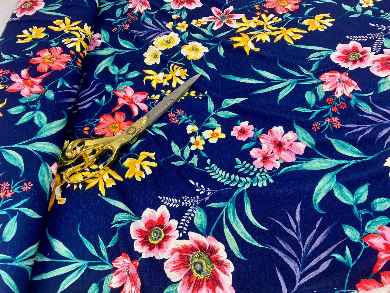 This designer 4-way stretch Lycra fabric features a beautiful floral print and offers excellent elasticity in all directions, making it perfect for dresses, activewear, costumes, leggings, swimwear, and creative DIY projects. Its smooth finish and vibrant colours make it a standout choice for both fashion and crafts