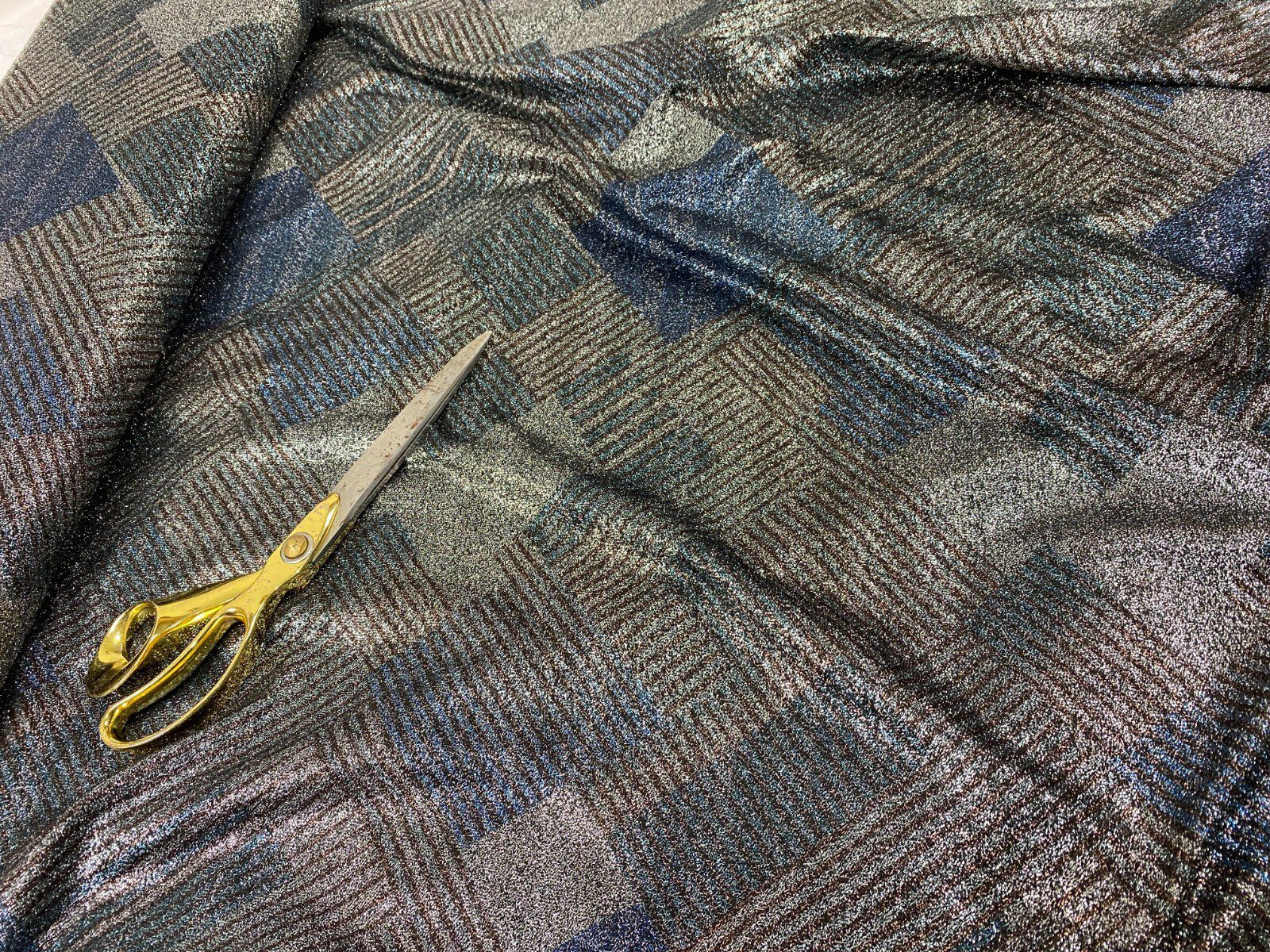 This eye-catching black and silver stretch jersey fabric is woven with shimmering Lurex threads, giving it a subtle sparkle and a glamorous finish. Soft, stretchy, and comfortable to wear, it’s ideal for party dresses, tops, dancewear, and standout craft projects. With a smooth backing and a glittery surface, it combines comfort with a high-impact look.
