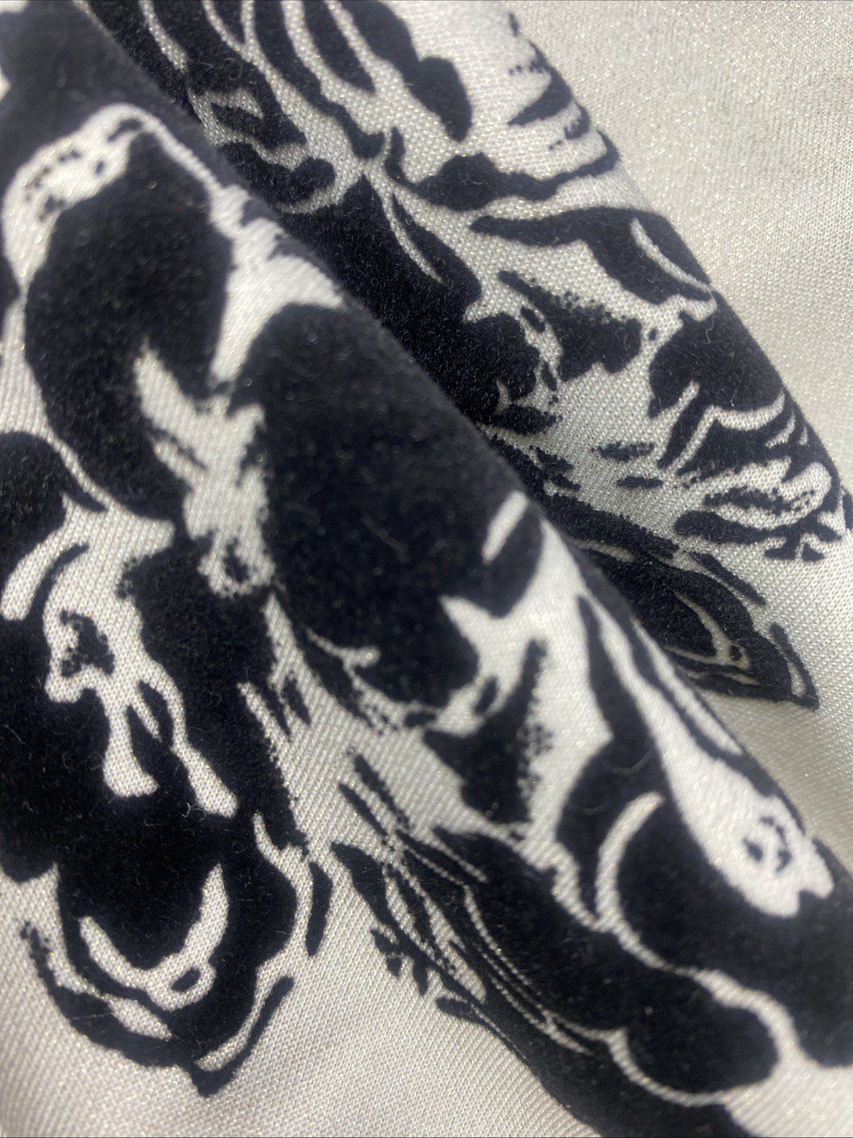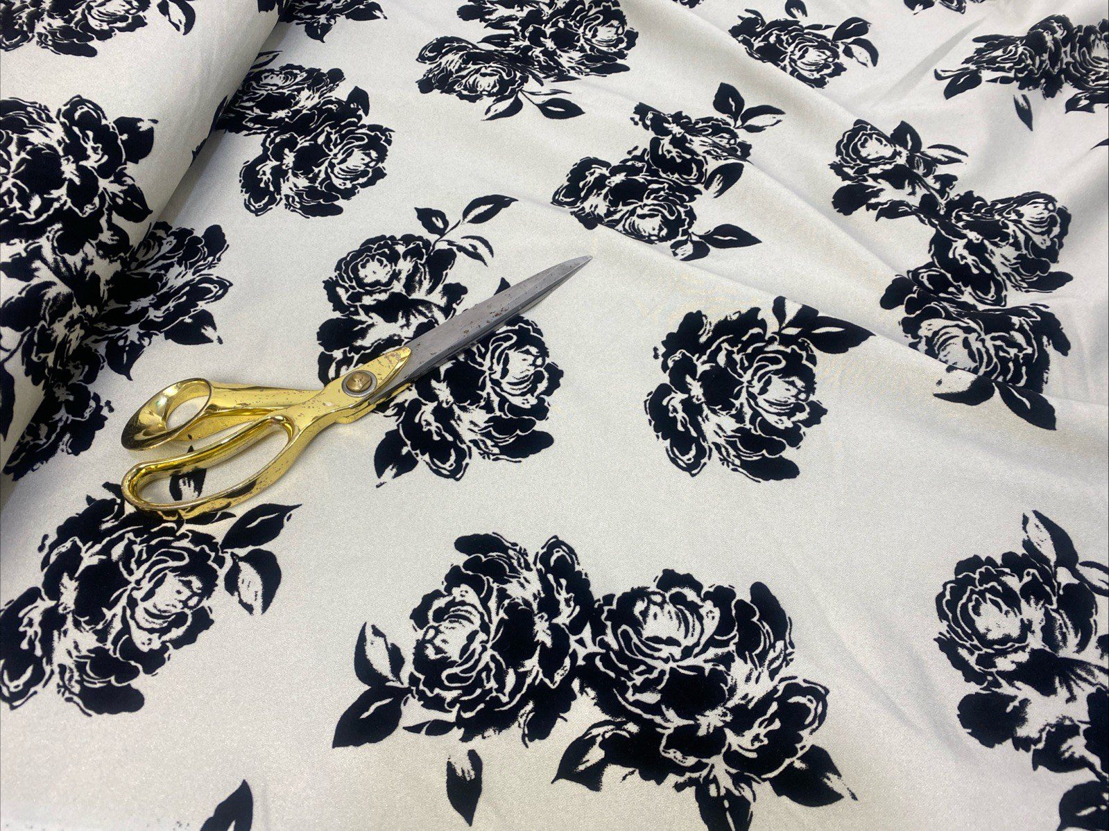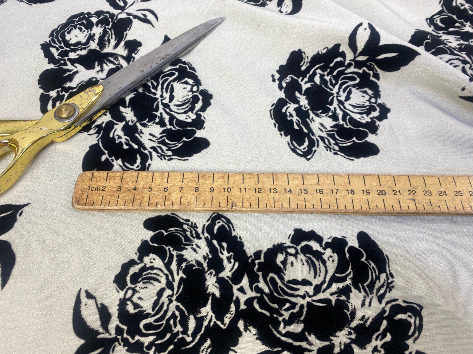 This Black Velvet Embossed-Grey Roses Stretch Double Knit Jersey Dress/Craft Fabric is a high-quality material suitable for a variety of crafting projects. The fabric features a luxurious light grey base with a black velvet embossed rose pattern, giving it a sophisticated and elegant look. Perfect for creating apparel such as dresses, sweatshirts, and accessories like bags, hats, and gloves. The stretch jersey material allows for easy draping and shaping, making it ideal for both everyday wear and special occasions. Made in the United Kingdom by Cheapest Fabrics UK, this fabric is sure to add a touch of glamour to any project.