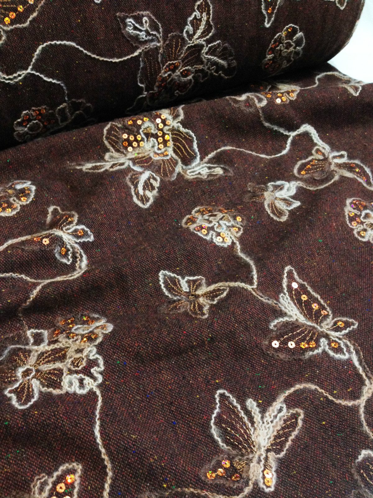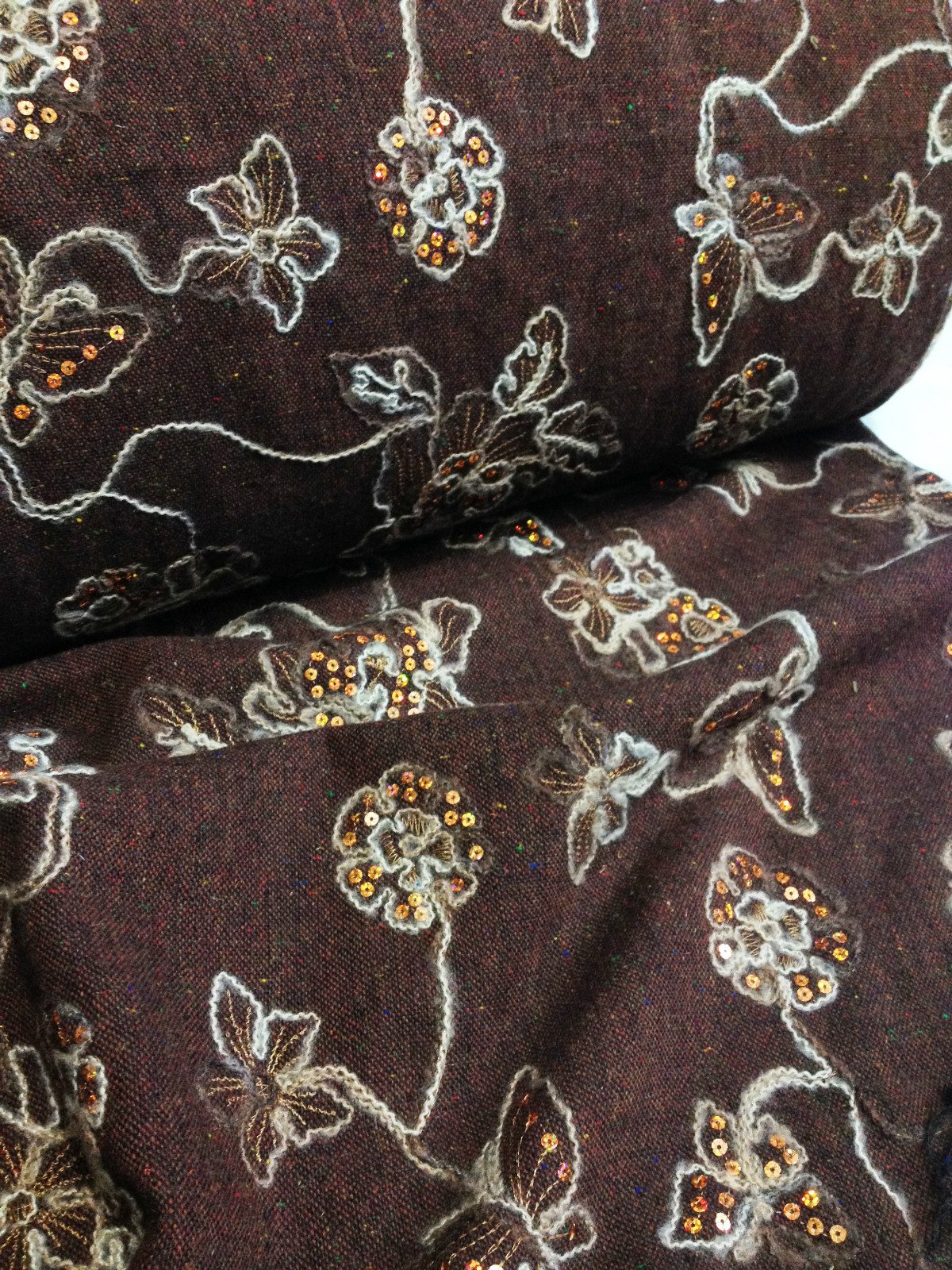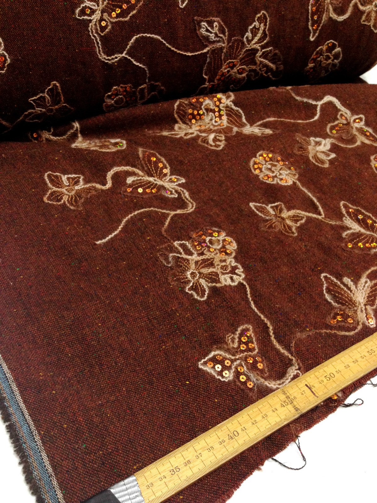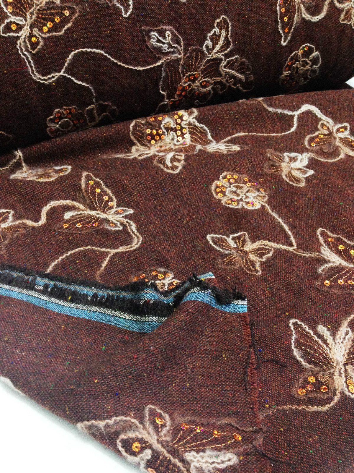 This exquisite designer wool fabric features rich brown tones embellished with multicolour sequinned embroidery, blending natural warmth with luxurious sparkle. Woven from high-quality wool, it offers a structured yet soft handle, making it ideal for statement coats, jackets, skirts, and couture-level craft projects. The intricate embroidery and sequin detail lend a bold, artistic edge to winterwear or fashion-forward designs.