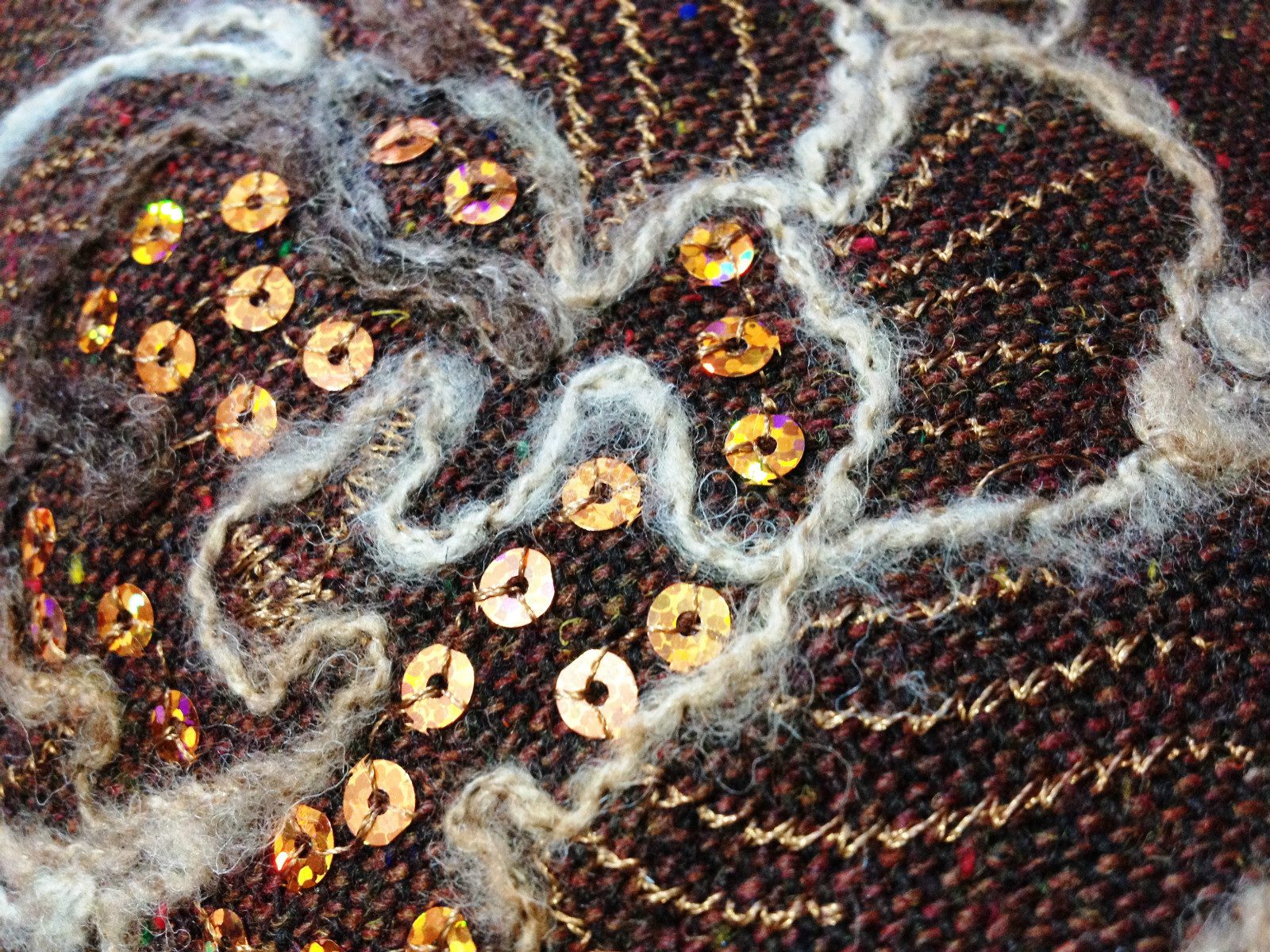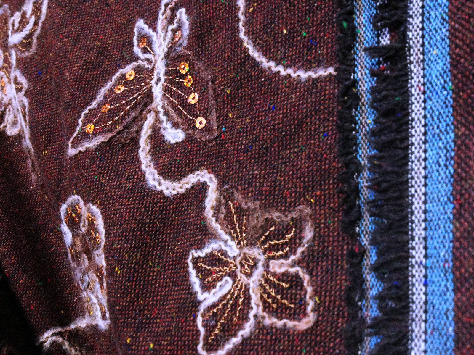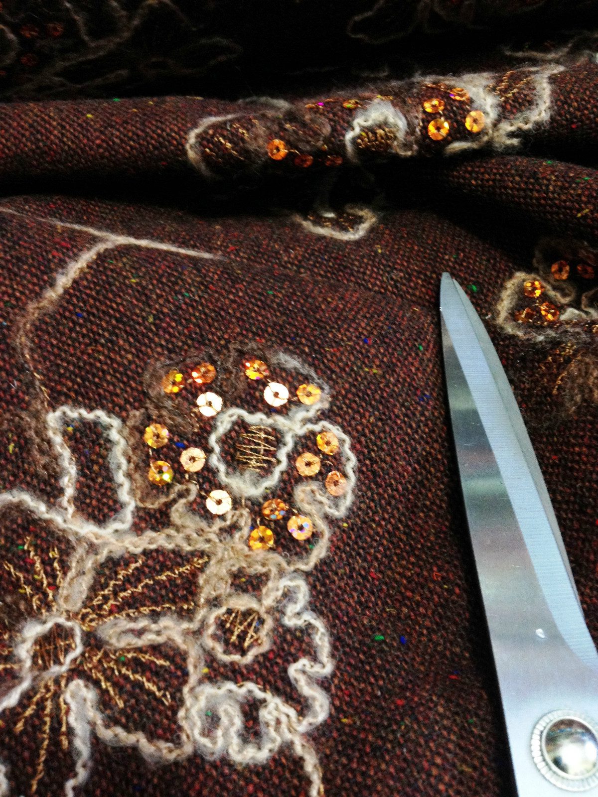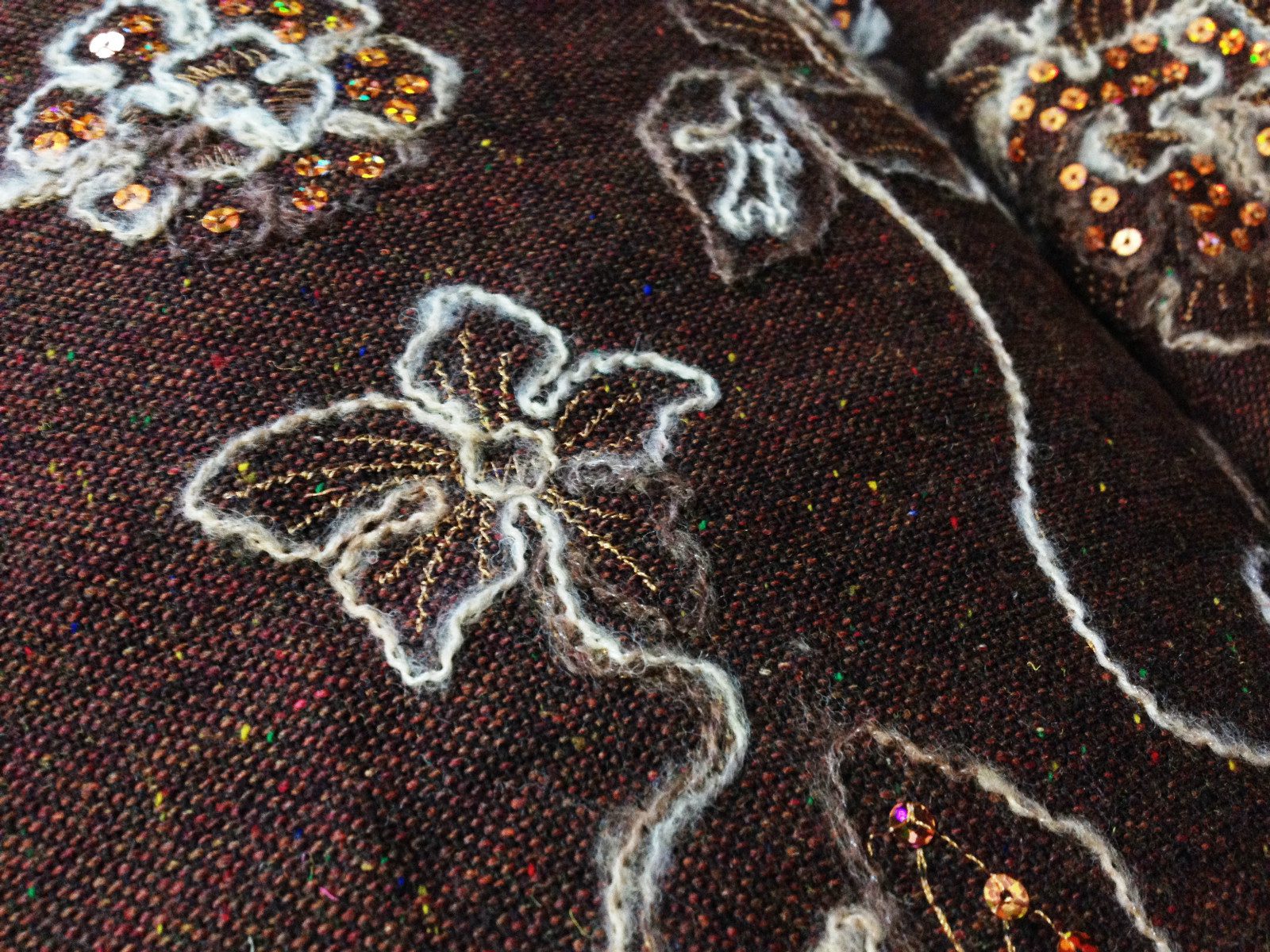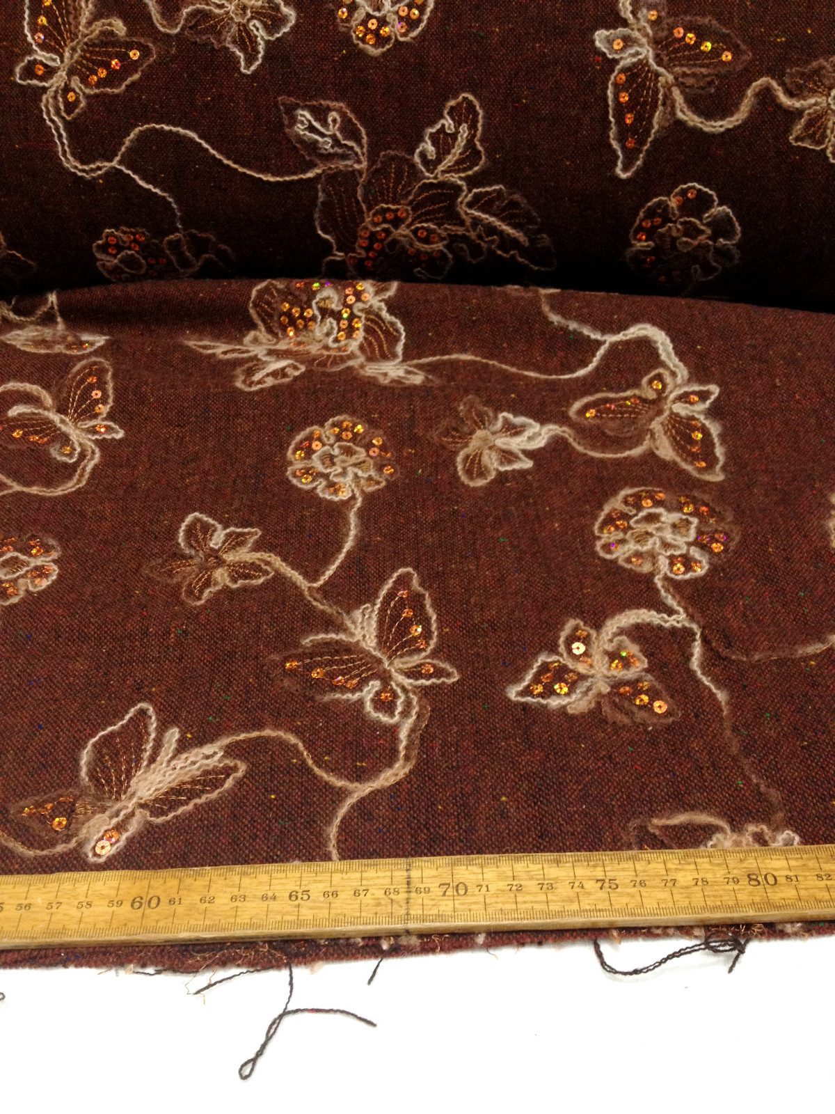 This exquisite designer wool fabric features rich brown tones embellished with multicolour sequinned embroidery, blending natural warmth with luxurious sparkle. Woven from high-quality wool, it offers a structured yet soft handle, making it ideal for statement coats, jackets, skirts, and couture-level craft projects. The intricate embroidery and sequin detail lend a bold, artistic edge to winterwear or fashion-forward designs.