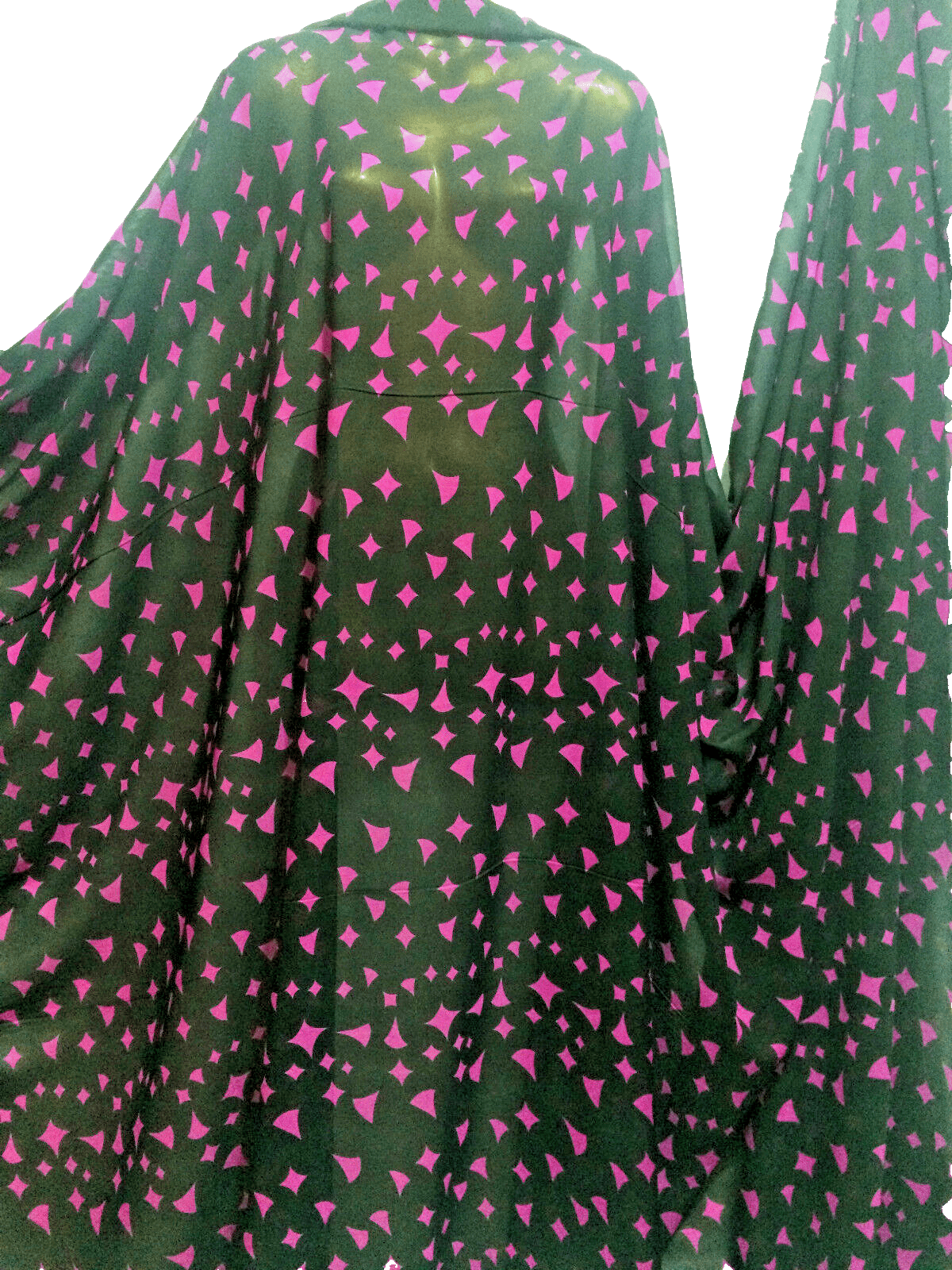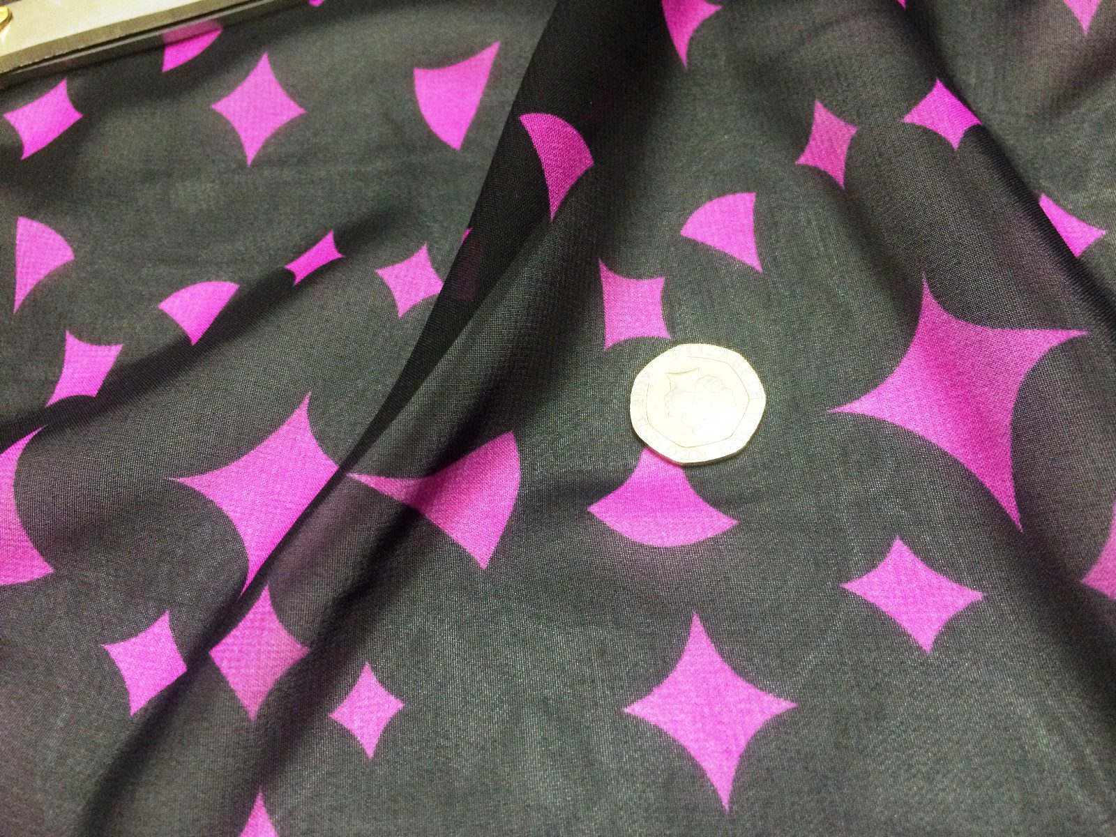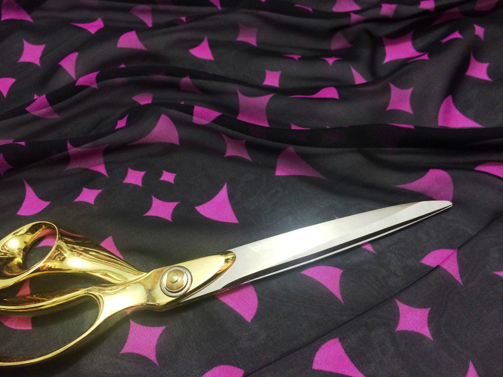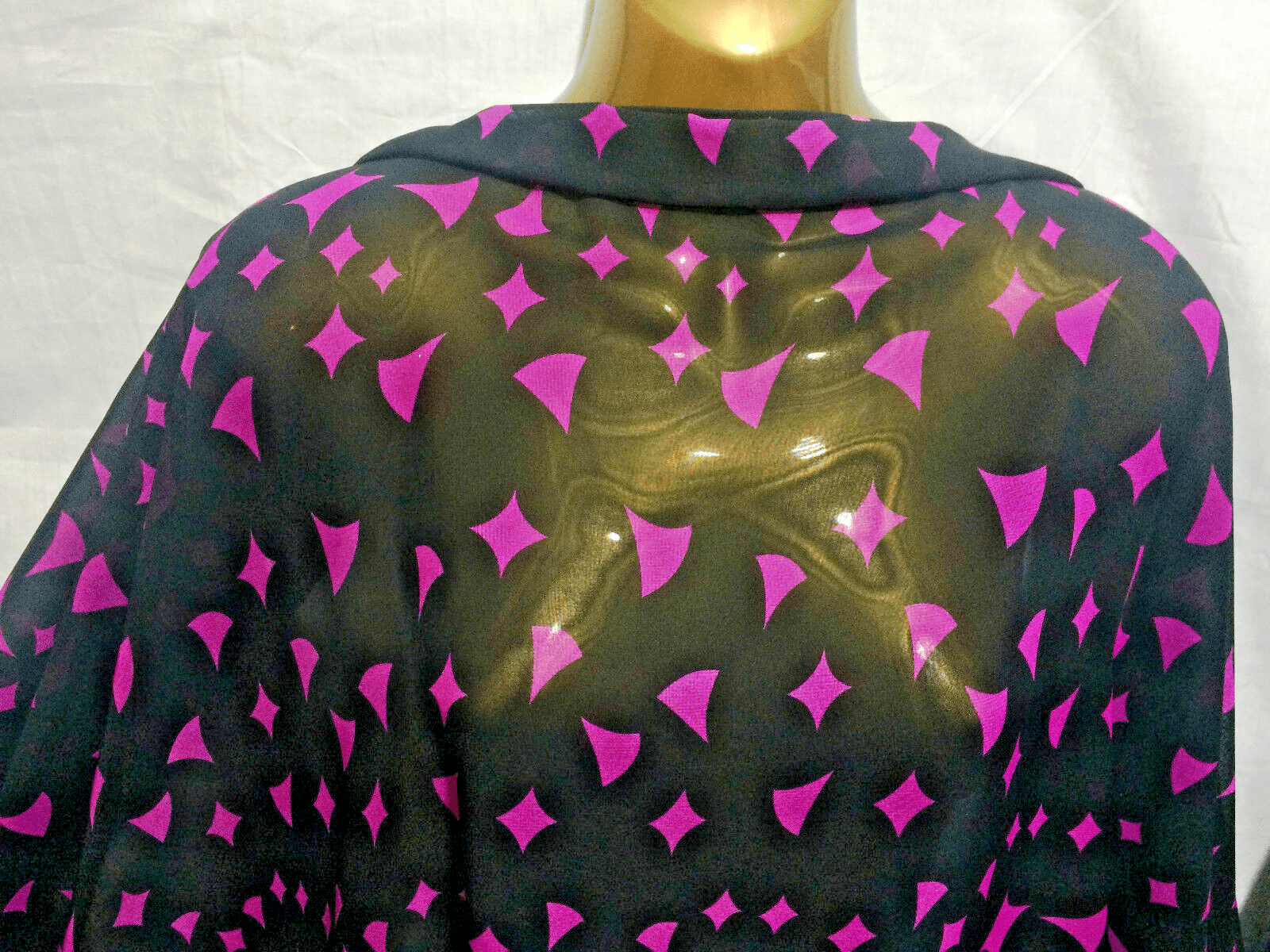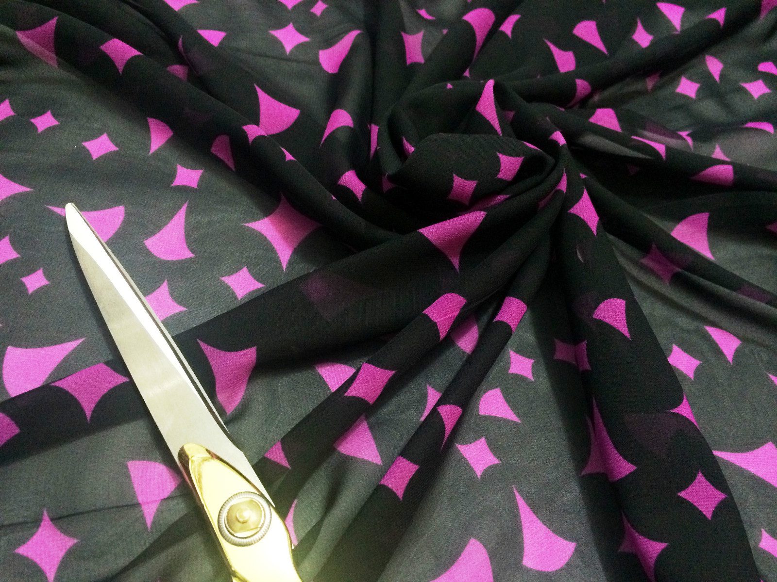 This stylish chiffon georgette fabric features a bold black and magenta abstract print, perfect for creating flowy and expressive dresses, tops, scarves, and creative craft projects. Lightweight and semi-sheer, it drapes beautifully and feels soft against the skin, making it a versatile choice for both casual and occasion wear. The dynamic pattern adds a modern artistic edge to any design.