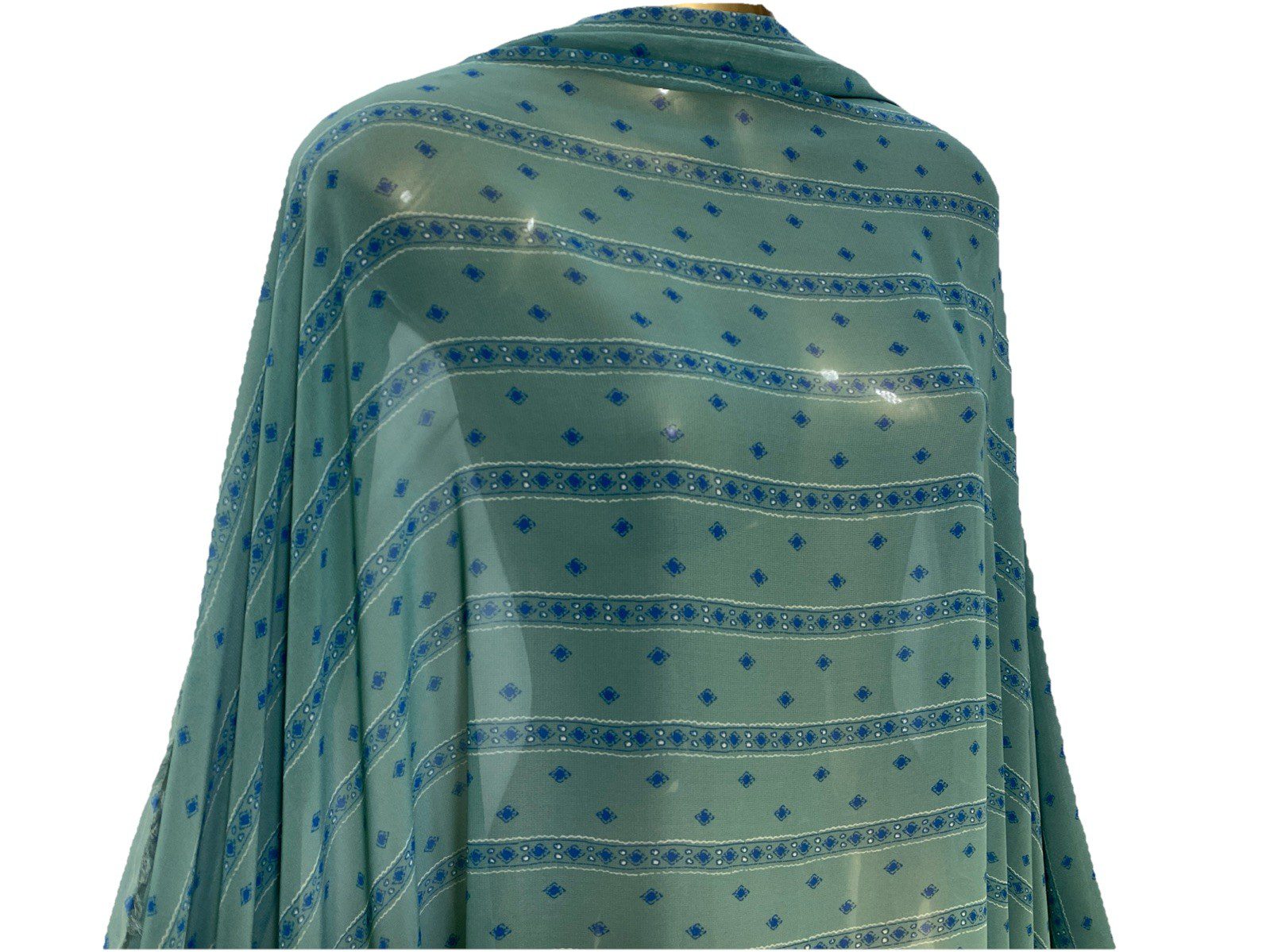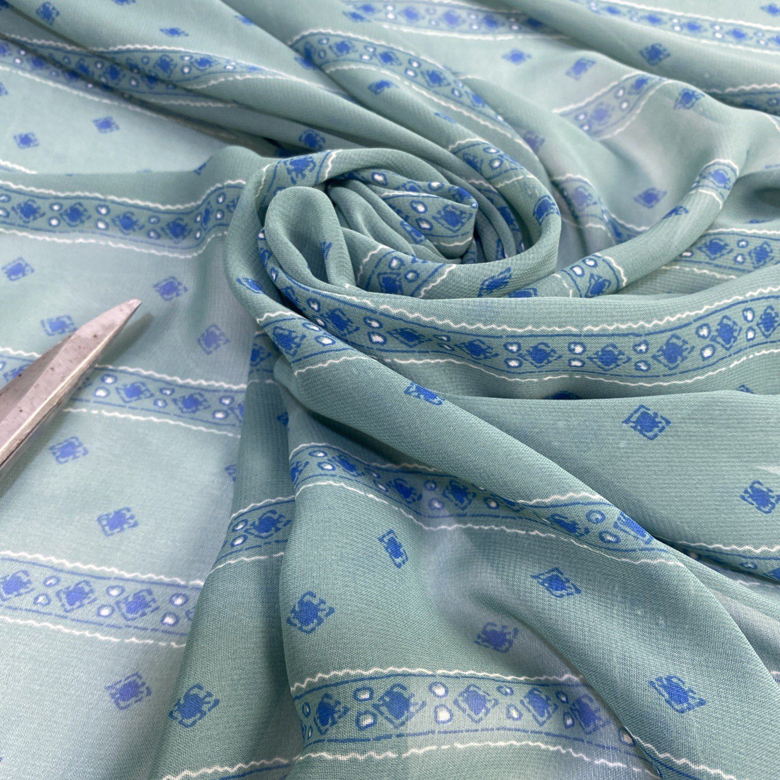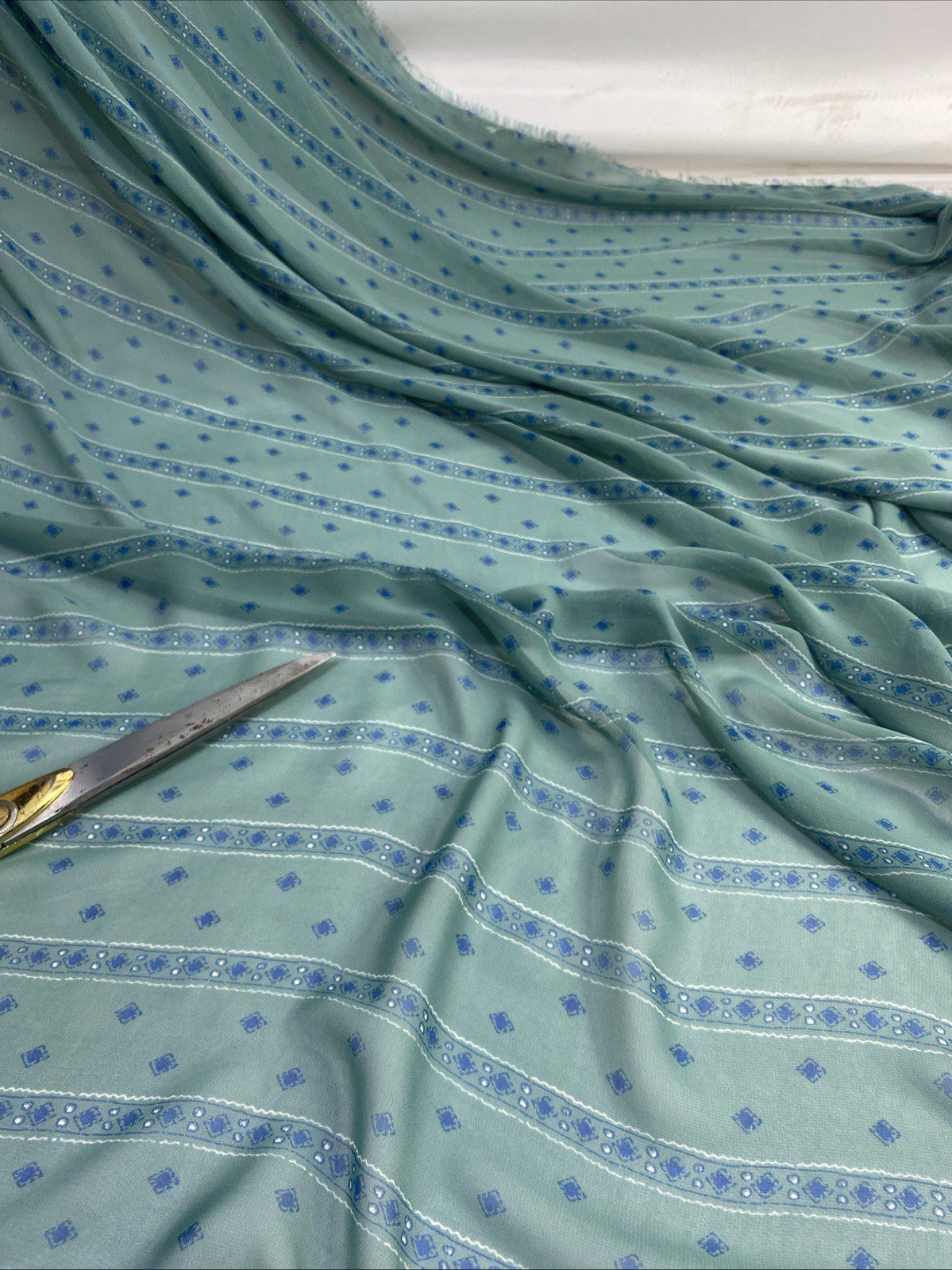 This beautiful chiffon fabric features a stylish striped print in navy, pink, red, and brown tones, along with the unique Green Blue Geometric Stripe Chiffon Fabric. Lightweight and semi-sheer, it drapes beautifully—making it perfect for flowy garments and creative craft projects.
