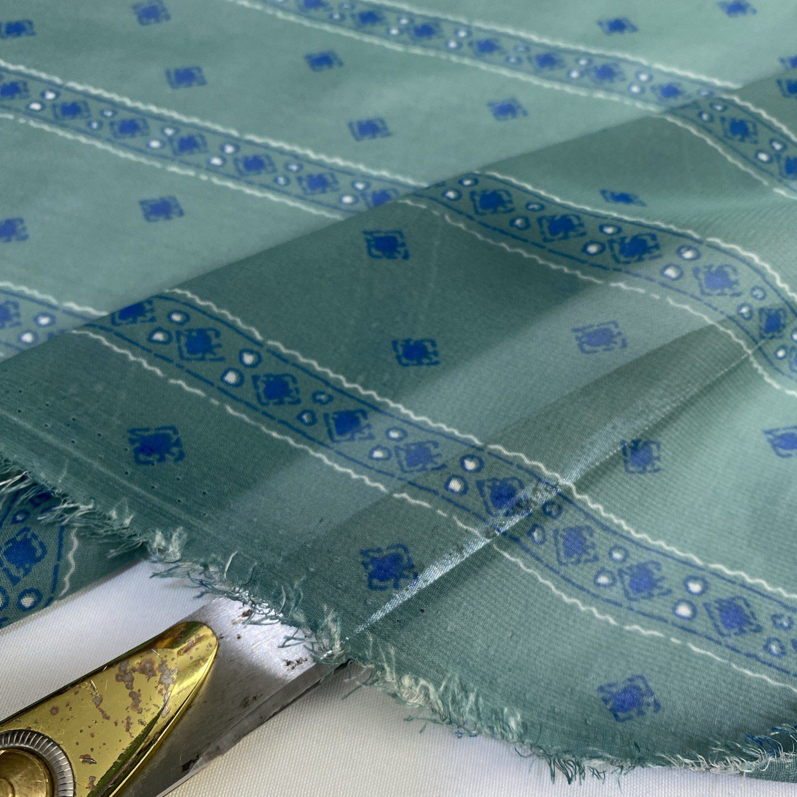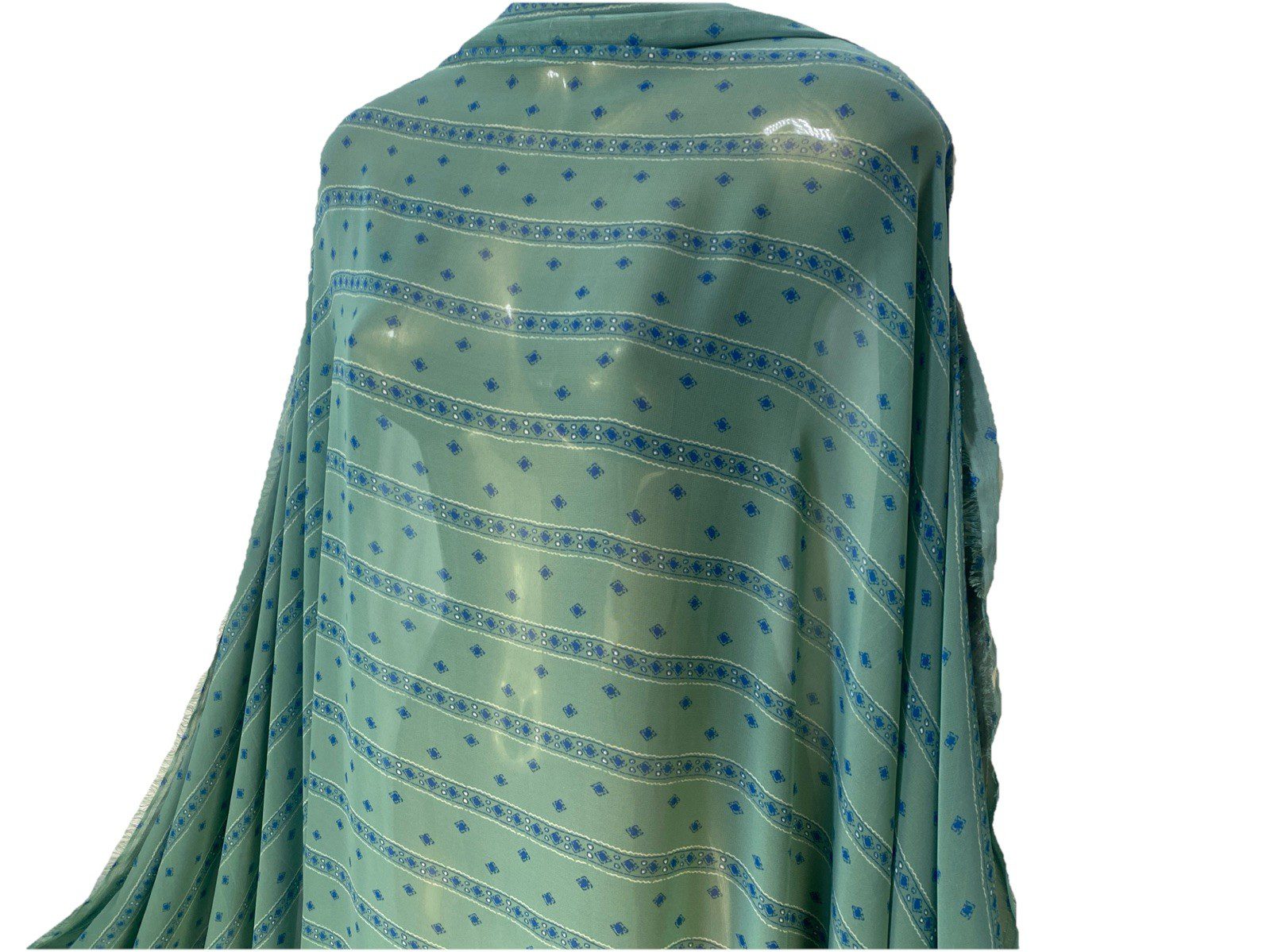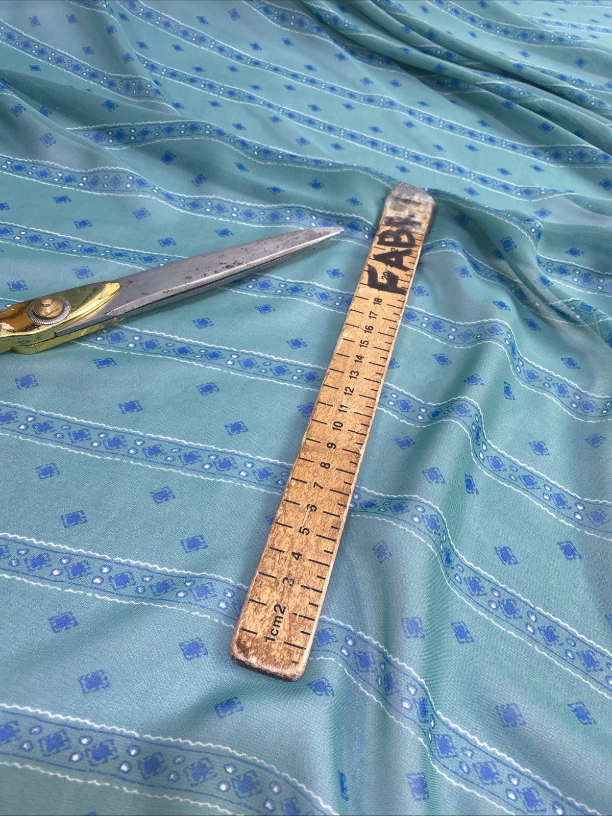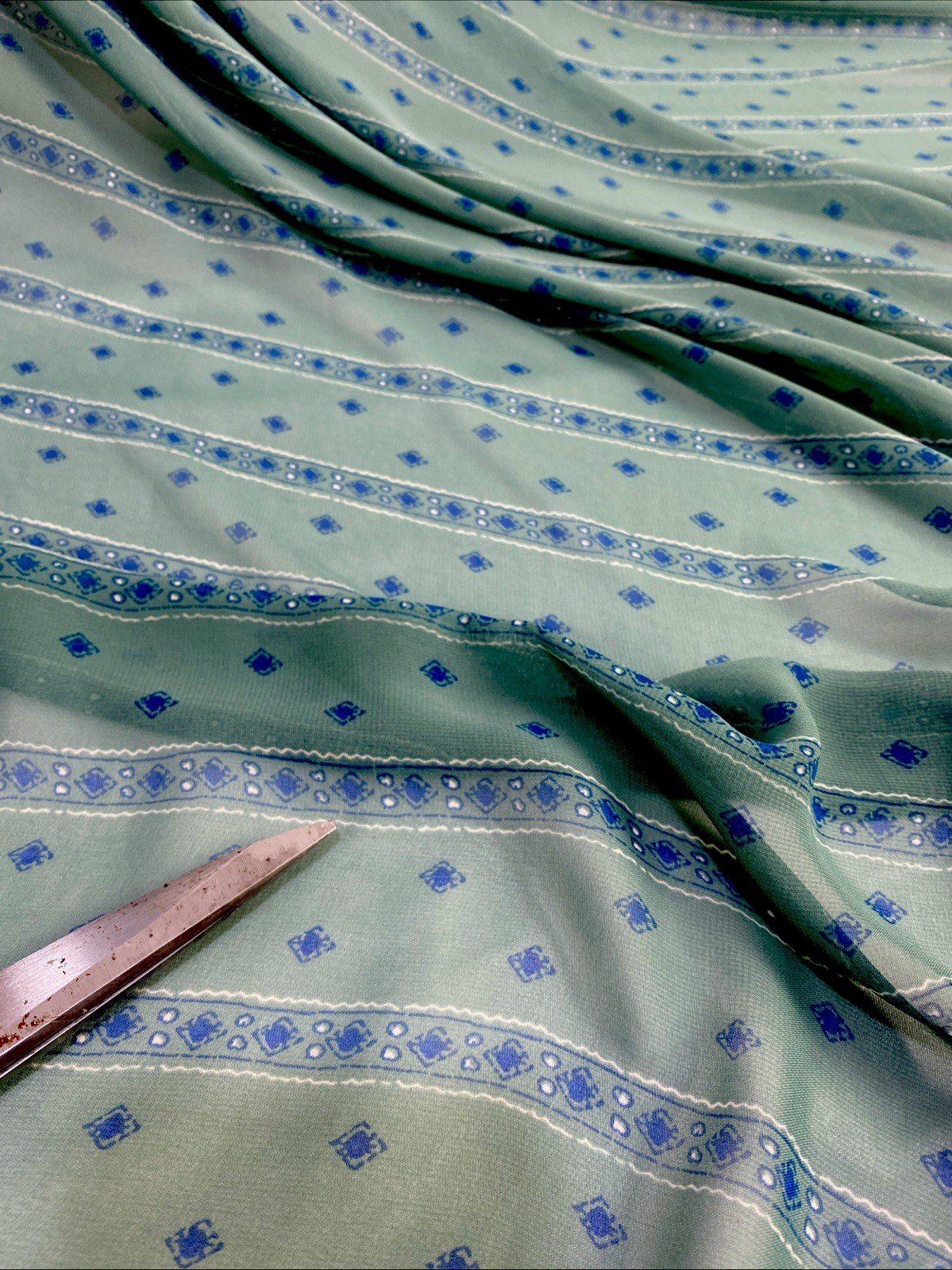 This beautiful chiffon fabric features a stylish striped print in navy, pink, red, and brown tones, along with the unique Green Blue Geometric Stripe Chiffon Fabric. Lightweight and semi-sheer, it drapes beautifully—making it perfect for flowy garments and creative craft projects.