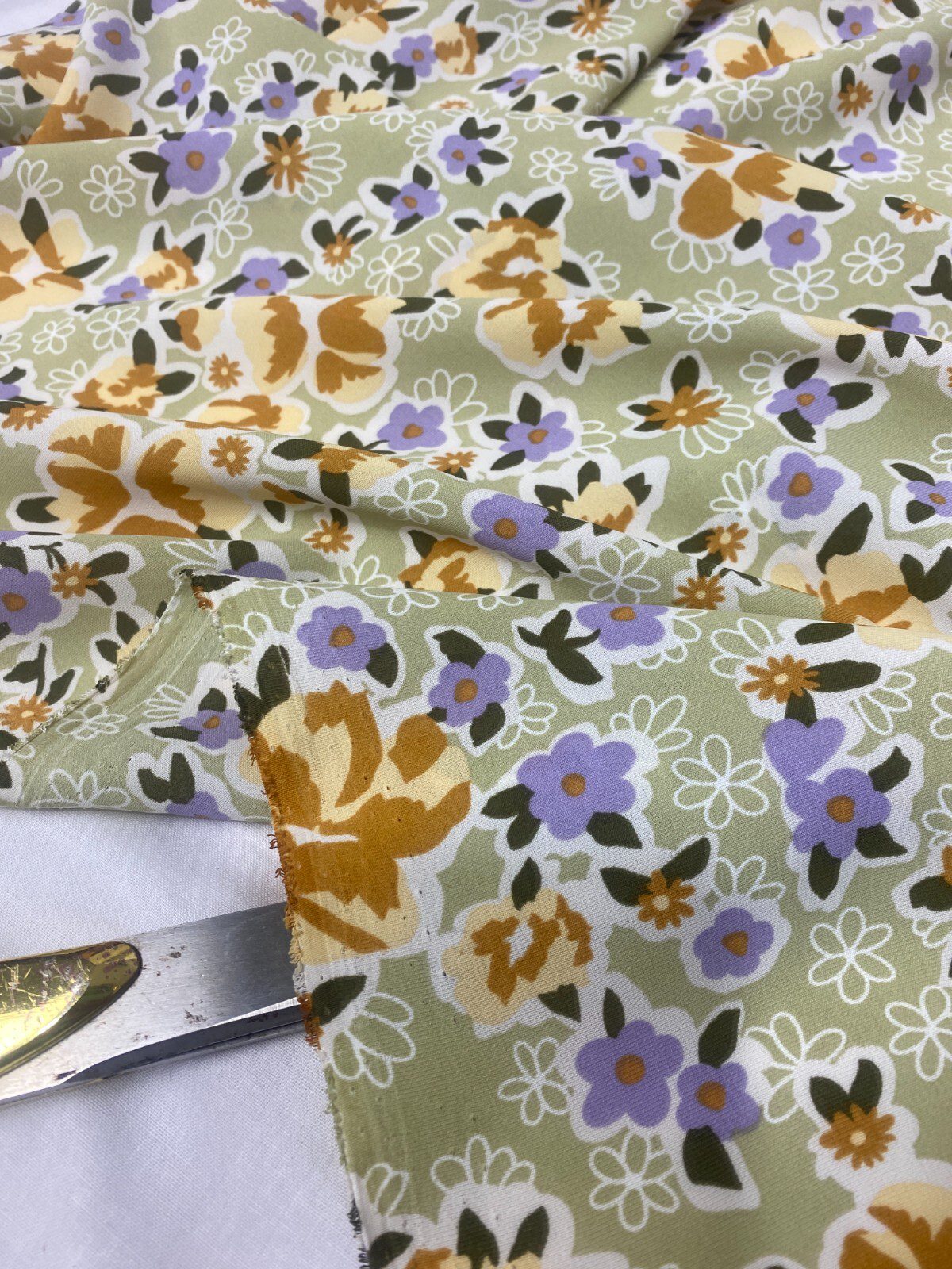 Designer Smooth Polyester – Olive Base with Small Floral Print – Dress Fabric