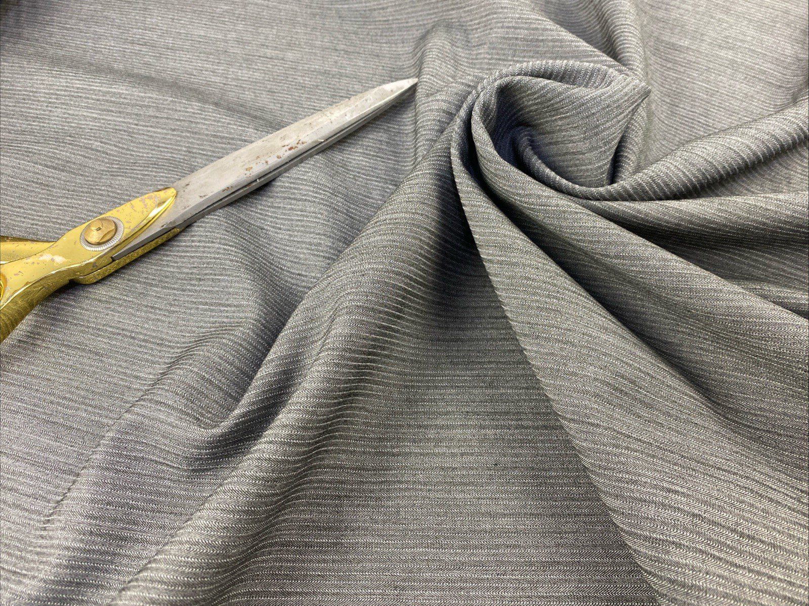 Designer grey striped stretch chambray denim fabric. Soft, lightweight, and ideal for dresses, skirts, shirts, and tailoring. Sold by the yard.