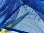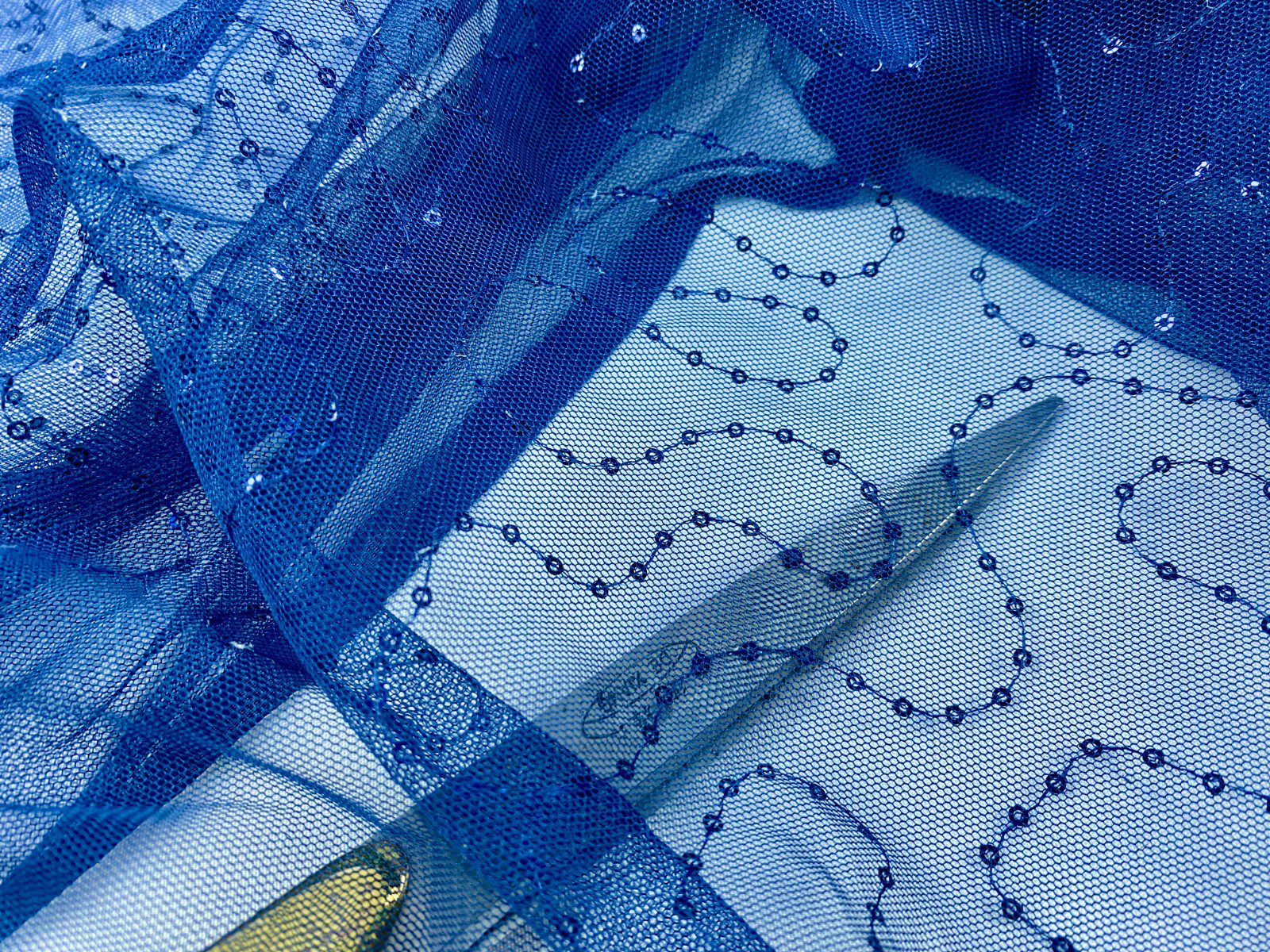 The product is a beautiful navy blue mesh net fabric with embroidered sequins, suitable for a variety of uses such as bridal, costume, and curtain design. This fabric is lightweight and has a geometric pattern, making it perfect for creating intricate and elegant designs. With a width of 60 inches and sold by the yard, this synthetic fabric from Fabric313 is ideal for those looking to add a touch of glamour and sophistication to their projects.