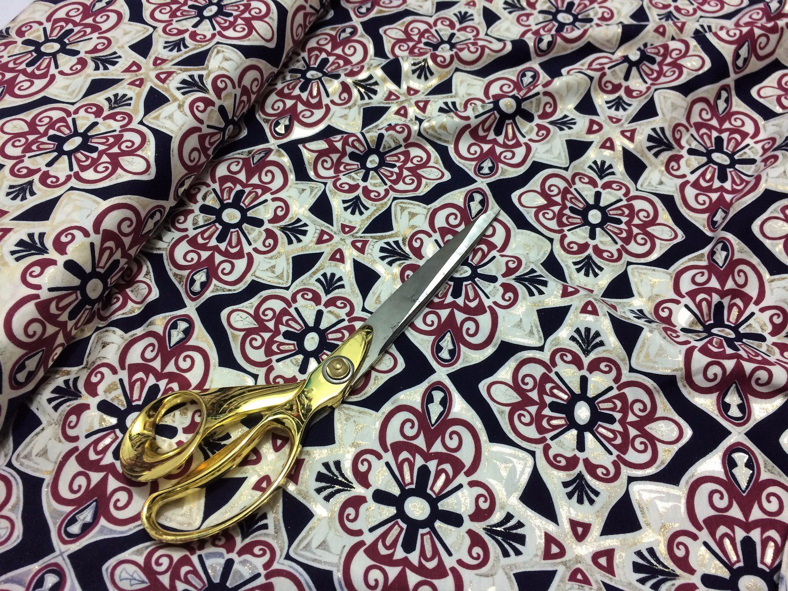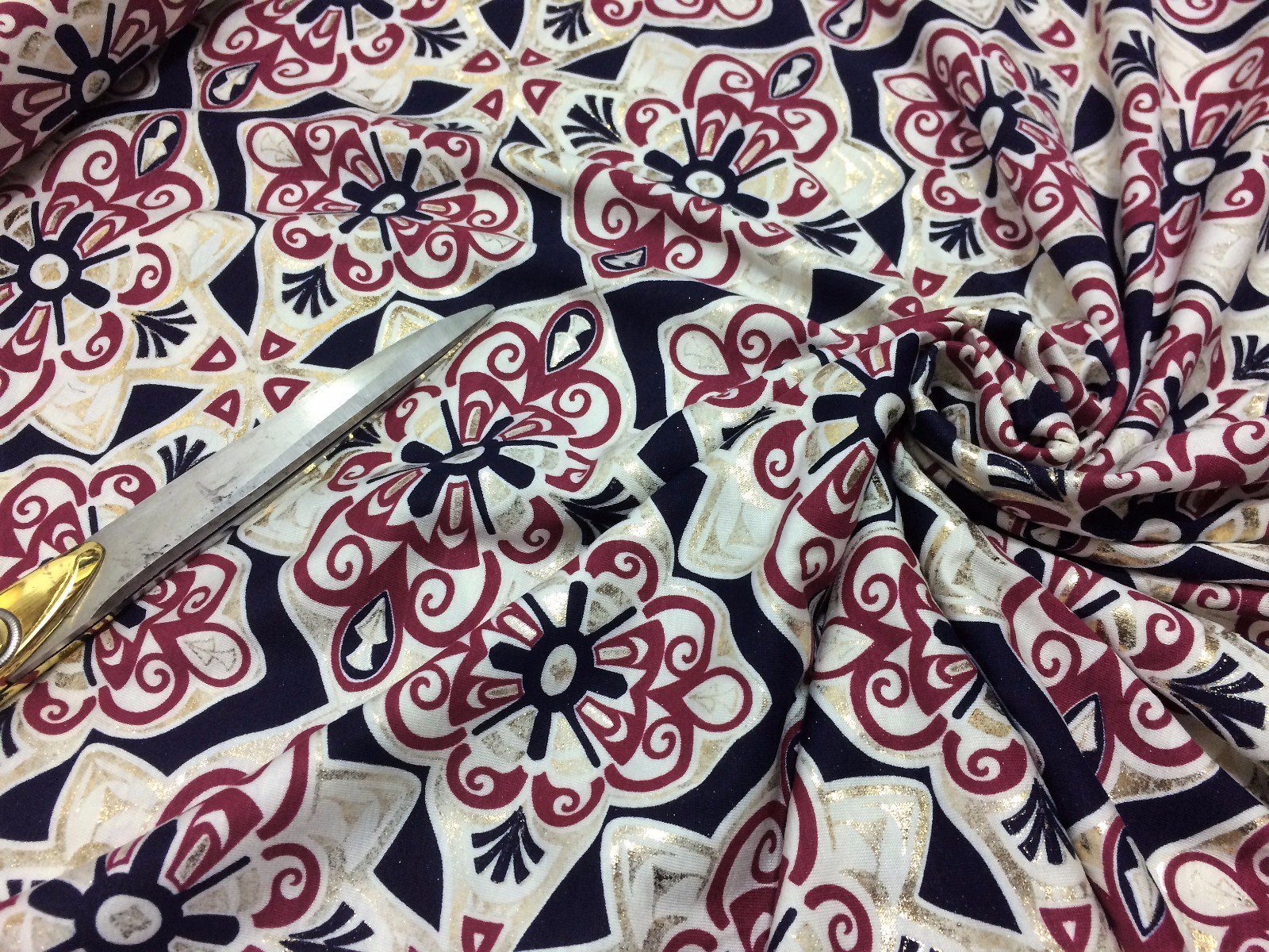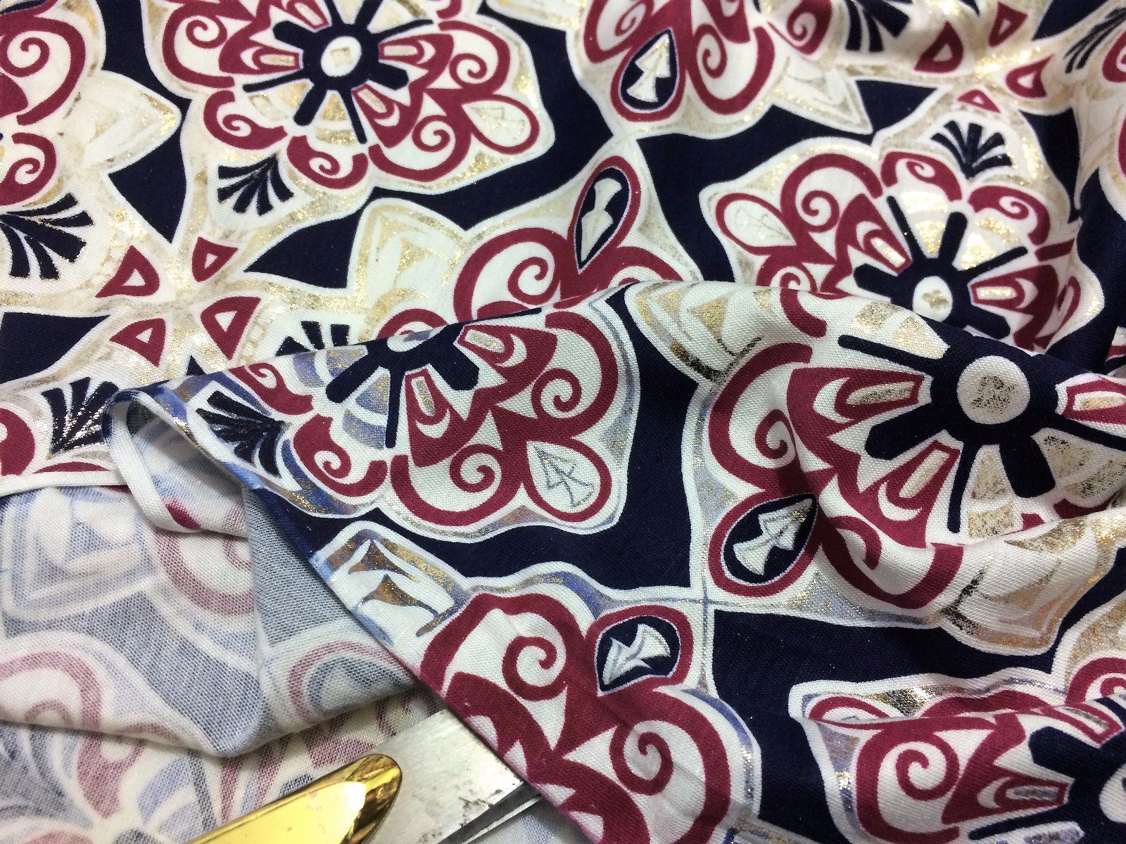 This elegant stretch viscose jersey fabric features a luxurious gold foil damask print on a soft, drapey base—ideal for creating evening dresses, tops, skirts, and decorative crafts. The rich damask motif adds a touch of vintage glamour, while the stretchy viscose blend ensures comfort and a flattering fit. Perfect for standout occasion wear or chic everyday styling.
