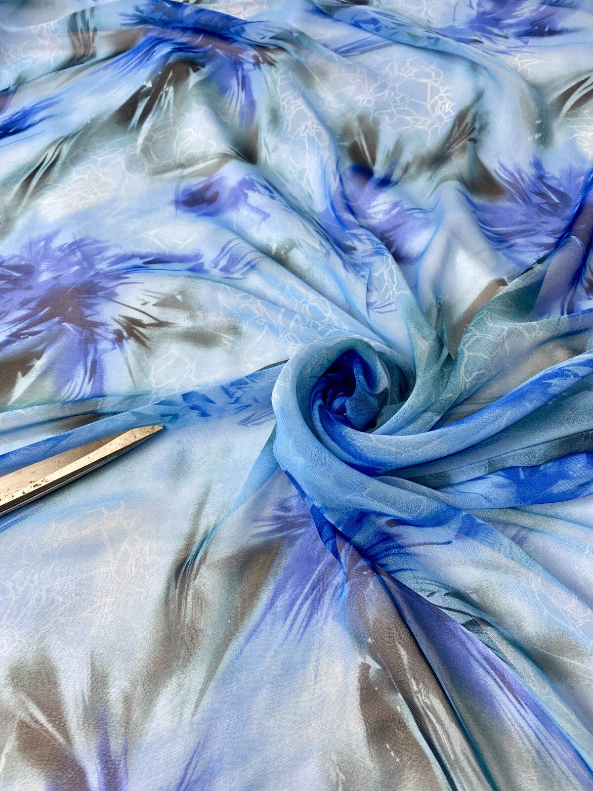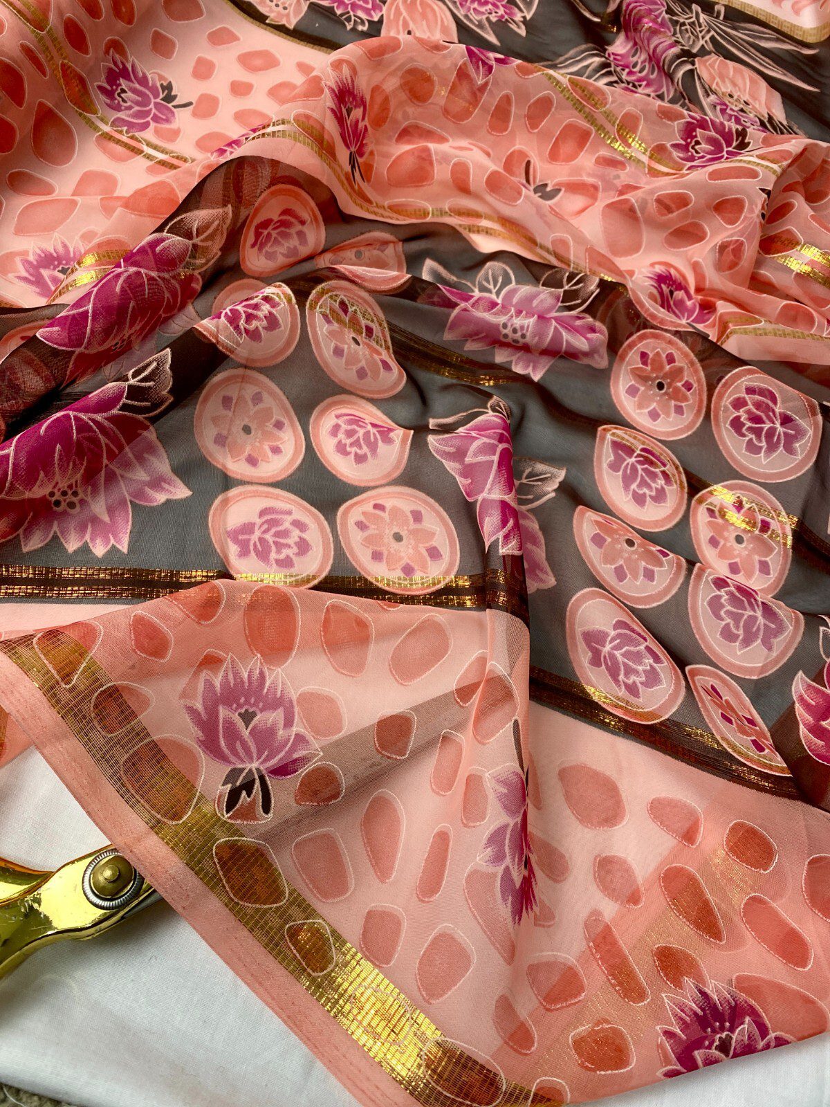 Gold Lurex Striped Floral Border Print Chiffon Dress/Craft Fabric