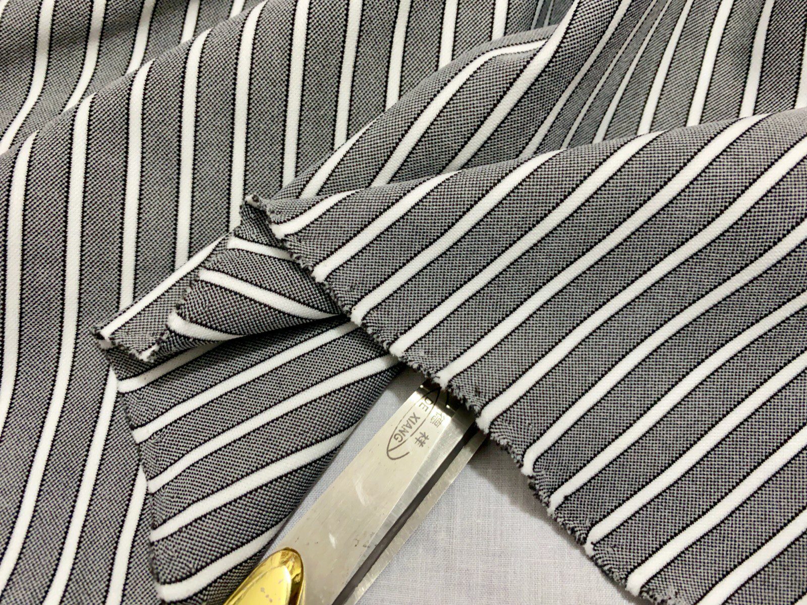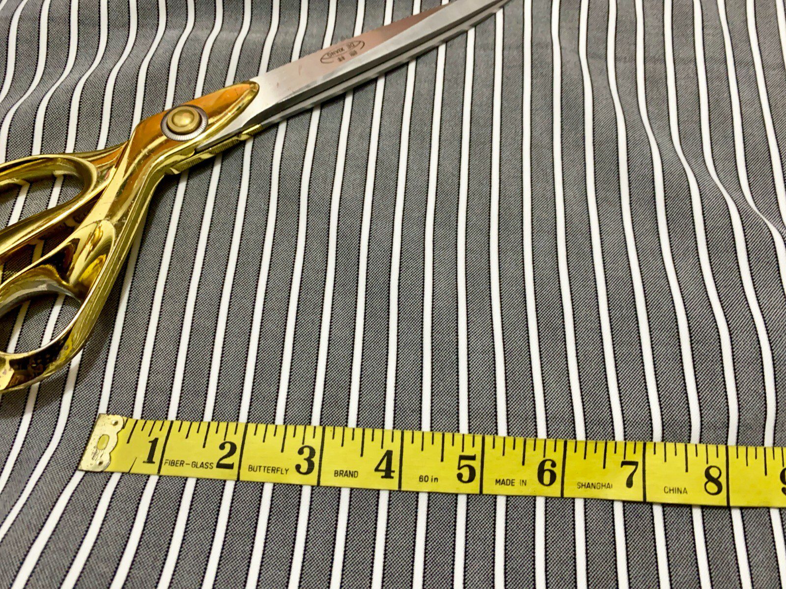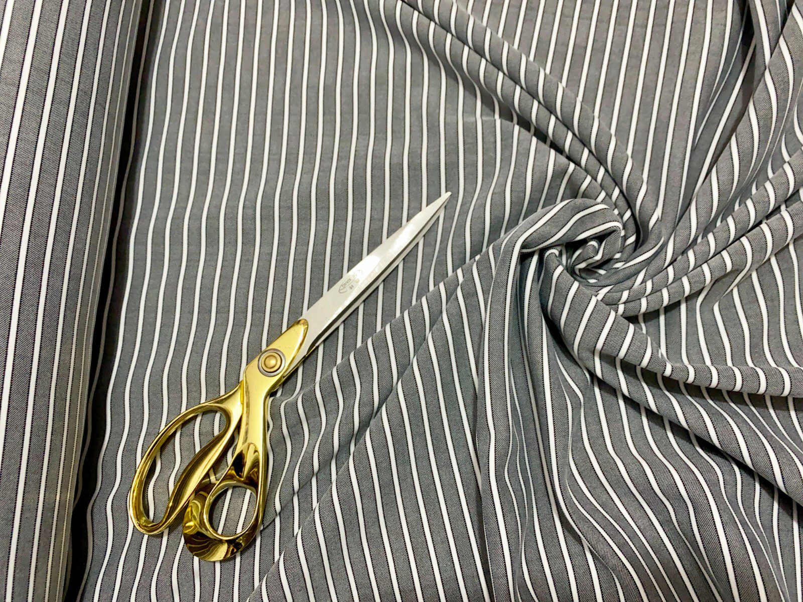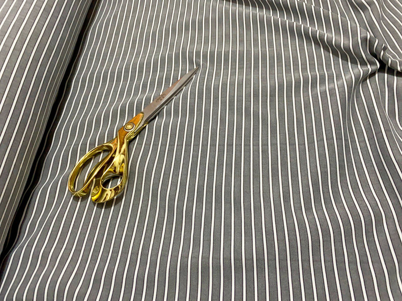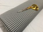 This versatile grey and white striped stretch jersey fabric is made from a soft, breathable double knit, offering excellent comfort and structure. With a medium weight and 2-way stretch, it’s ideal for dresses, tops, face masks, headwear, and loungewear. The fine stripe design adds a clean, modern look, while the double-knit construction provides added durability and opacity.