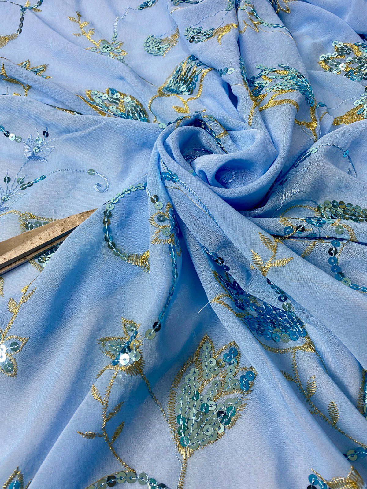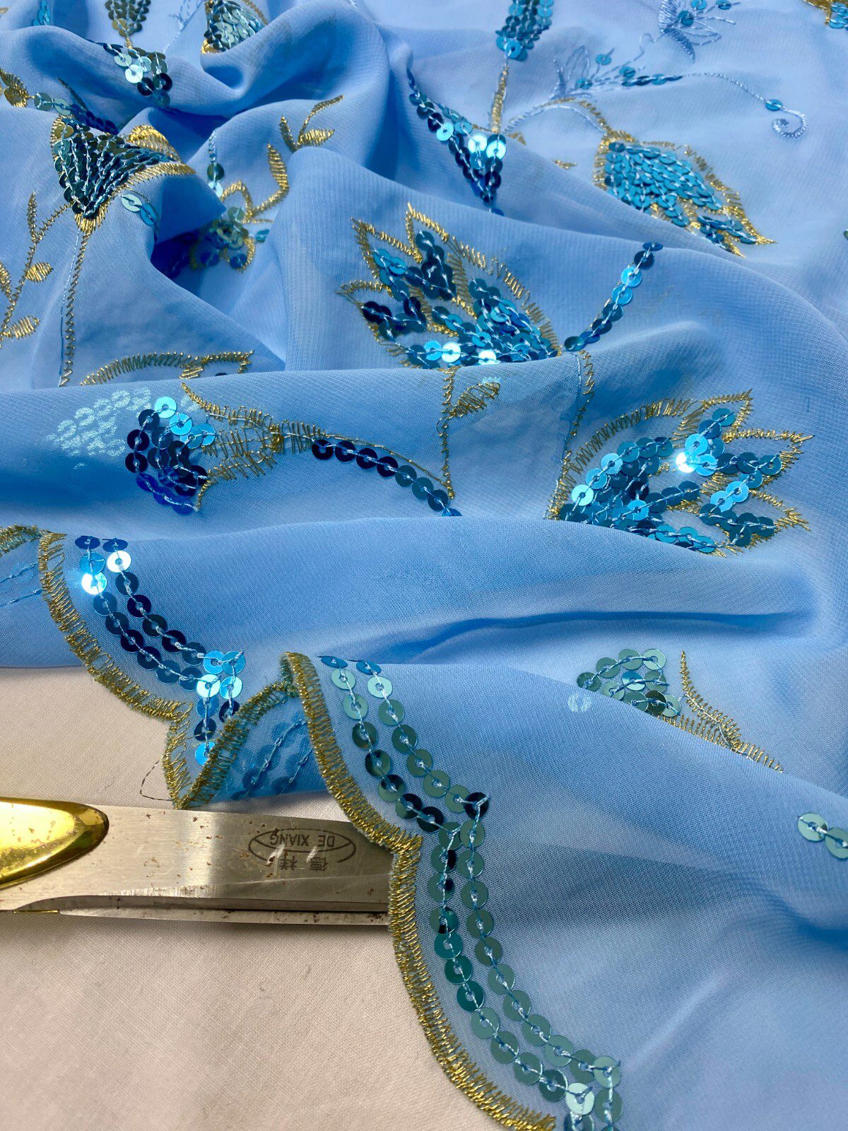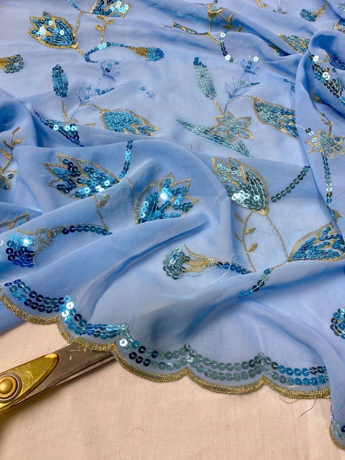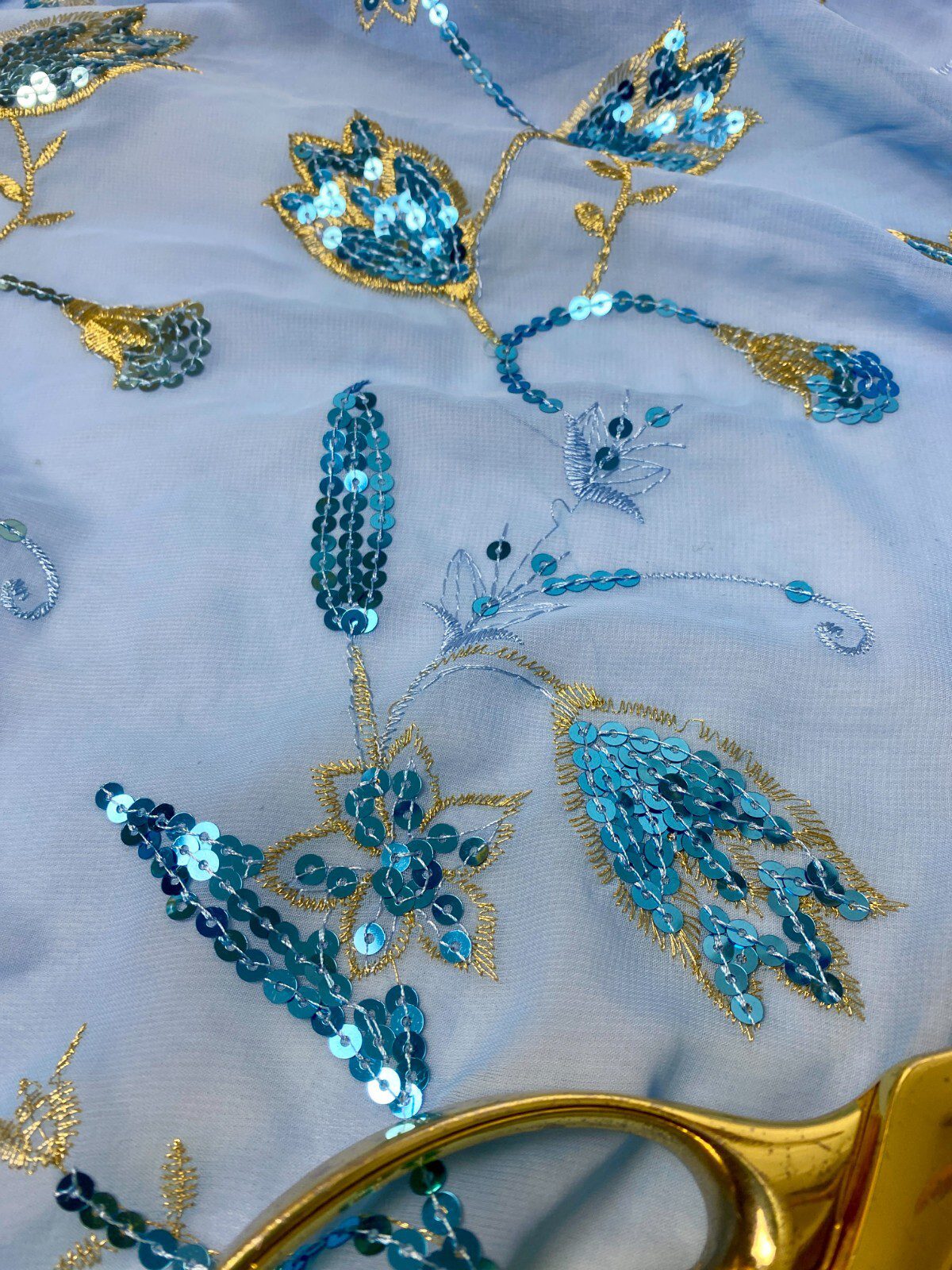 Elegant Light Blue Georgette Embroidered Sequin Fabric with gold embroidery and delicate sequin highlights
