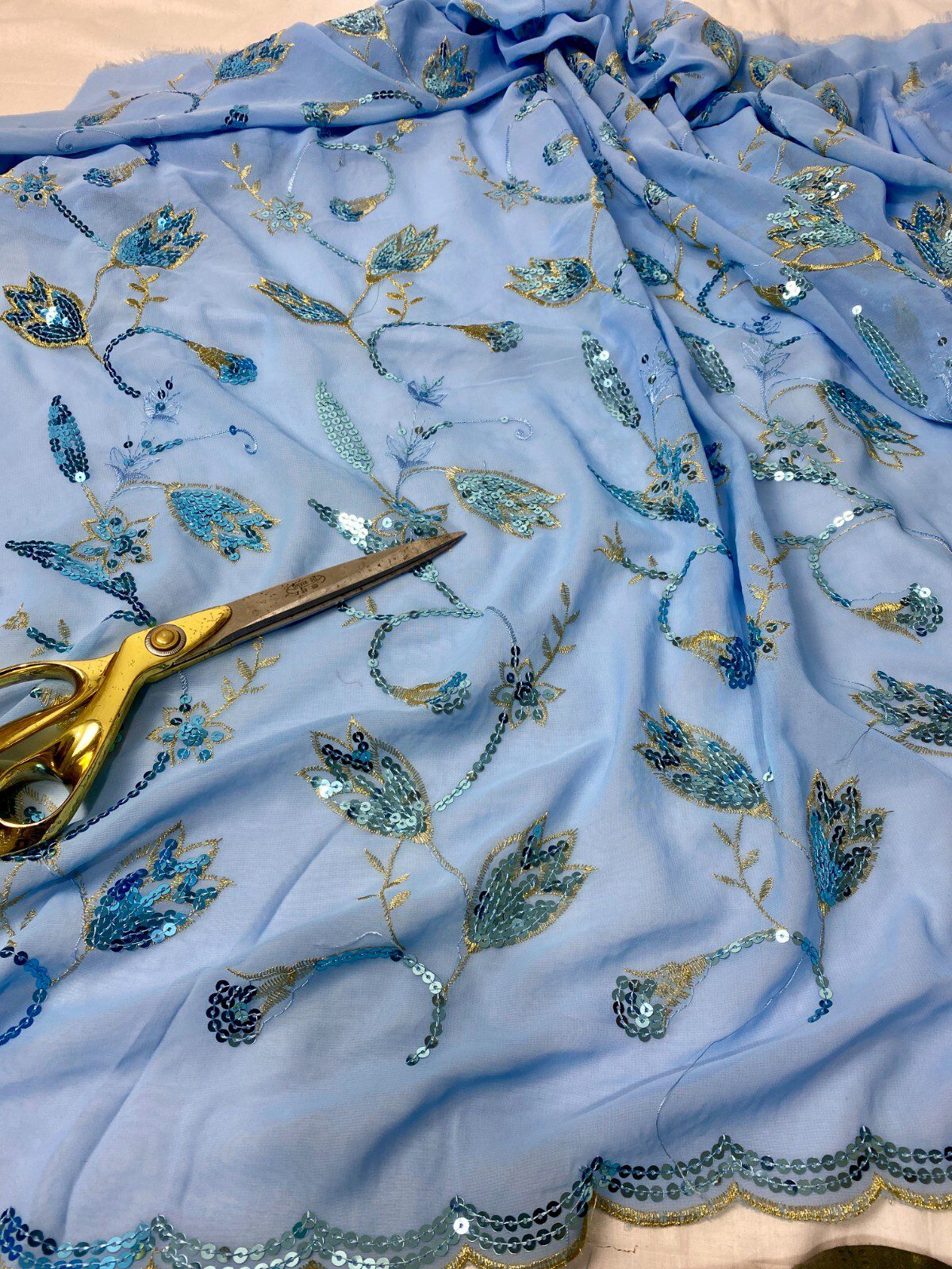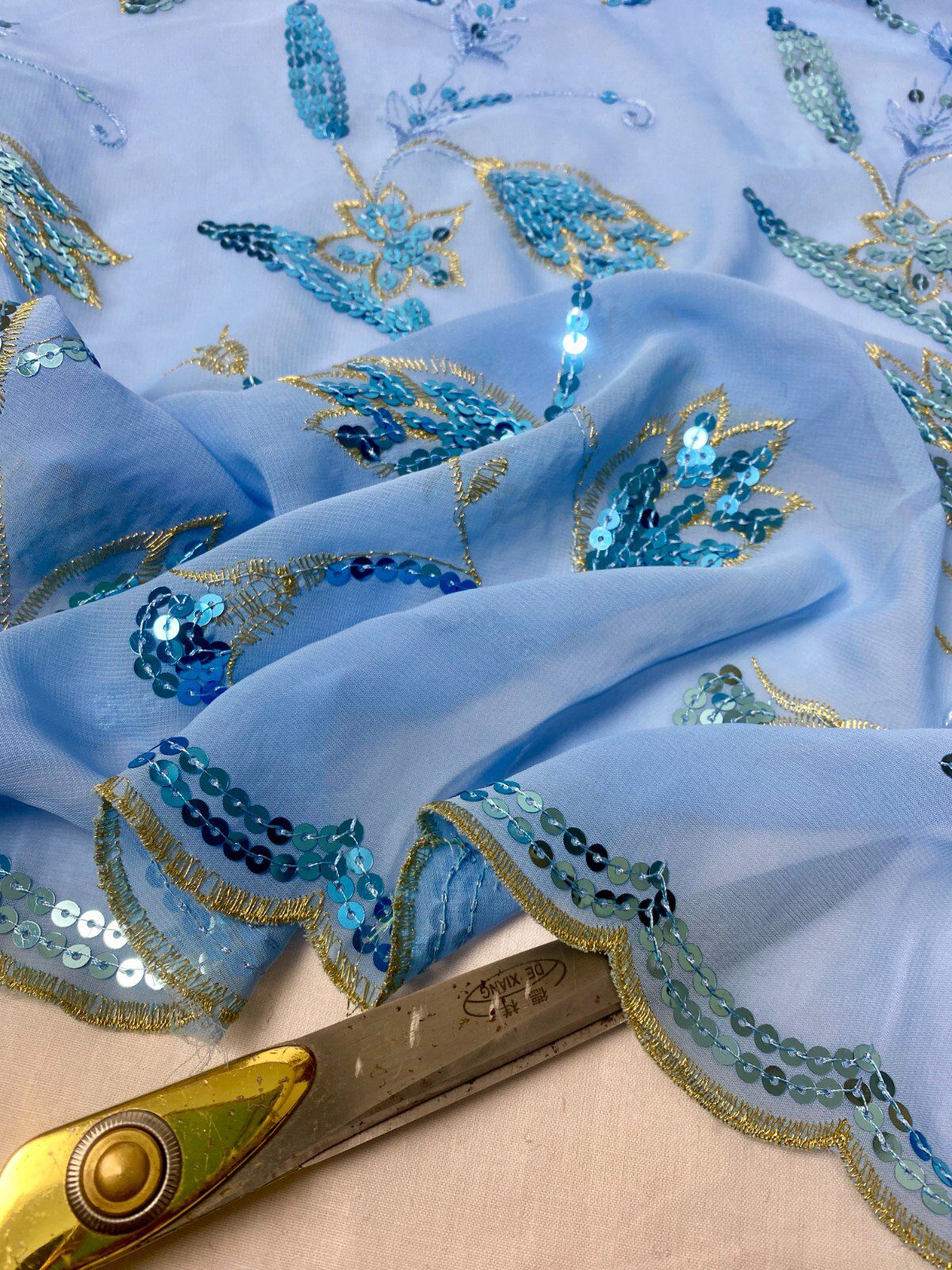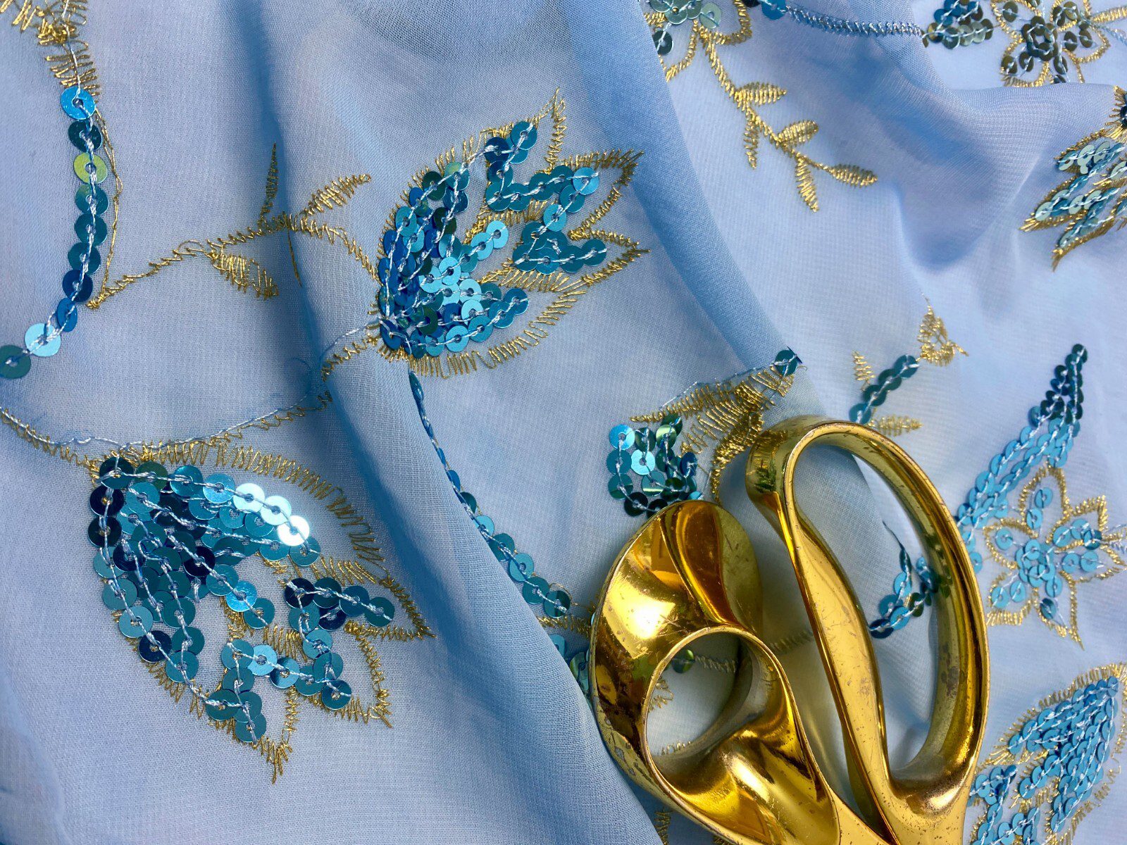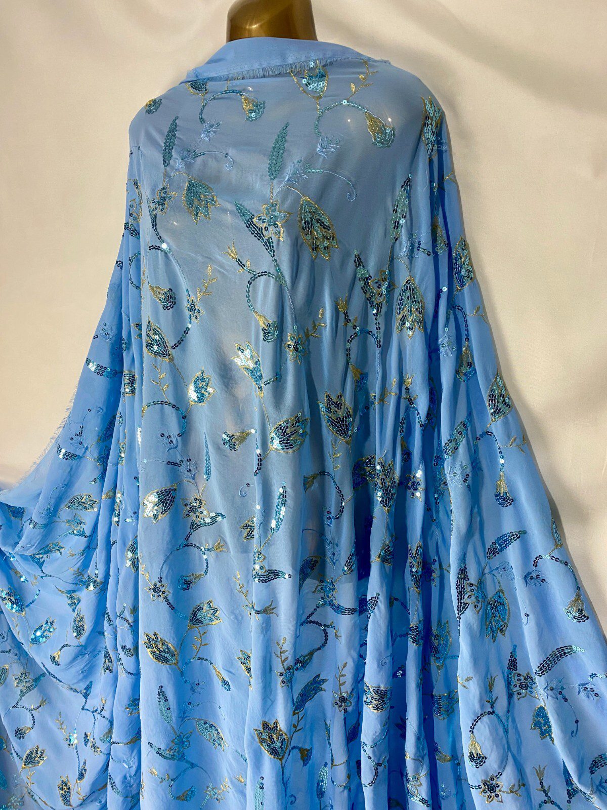 Elegant Light Blue Georgette Embroidered Sequin Fabric with gold embroidery and delicate sequin highlights
