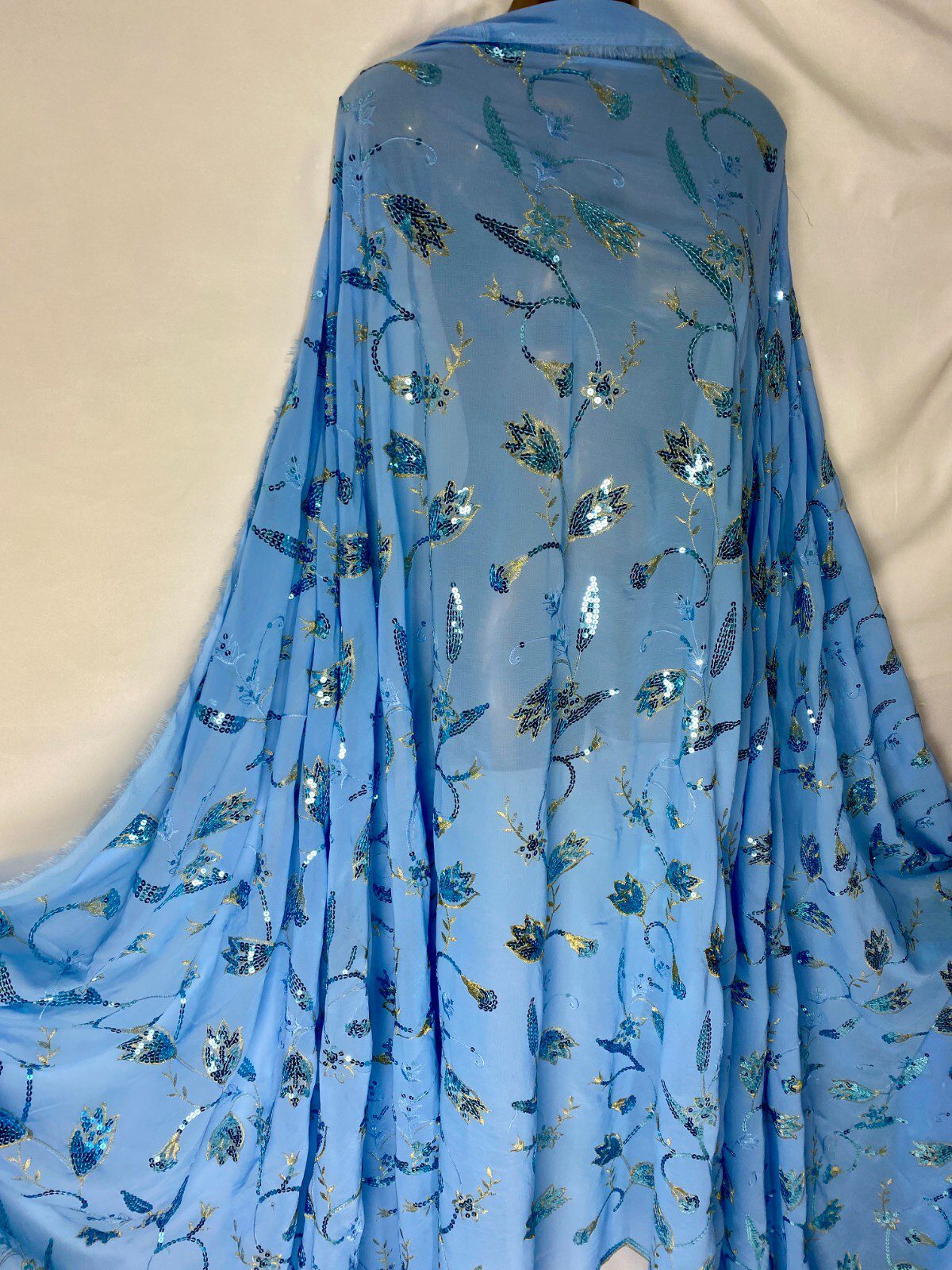 Lightweight and sheer with graceful drape – perfect for wedding dresses, overlays, crafts, and the exquisite Light Blue Georgette Embroidered Sequin Fabric