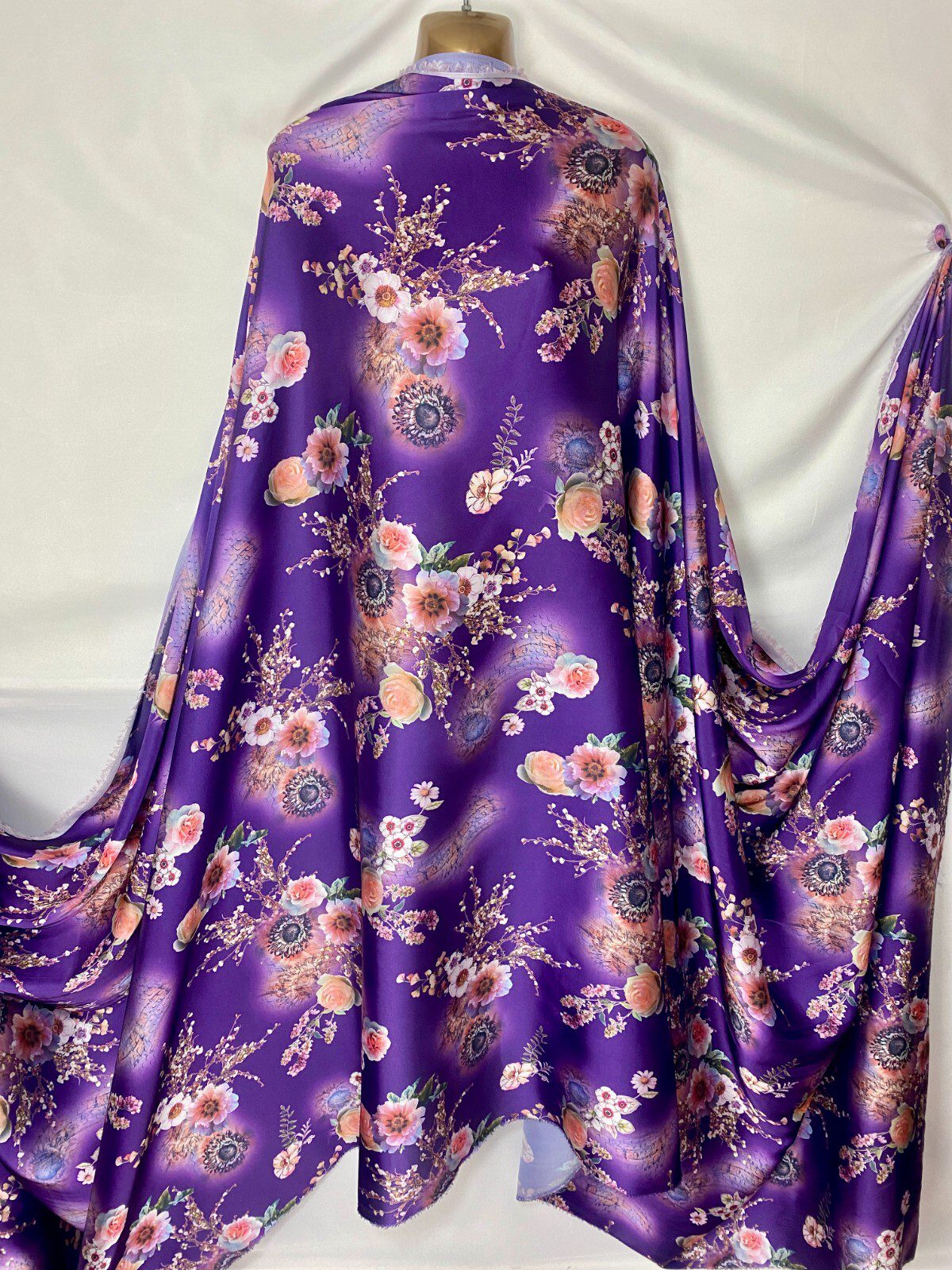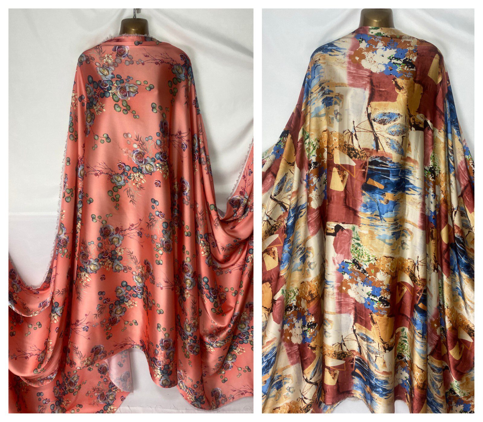 This lightweight liquid satin fabric features a smooth, glossy finish with a beautiful floral and abstract print. With its elegant drape and fluid movement, it’s perfect for formalwear, blouses, occasion dresses, scarves, and decorative craft projects. The luxurious shine and softness make it ideal for pieces that call for elegance and visual impact.