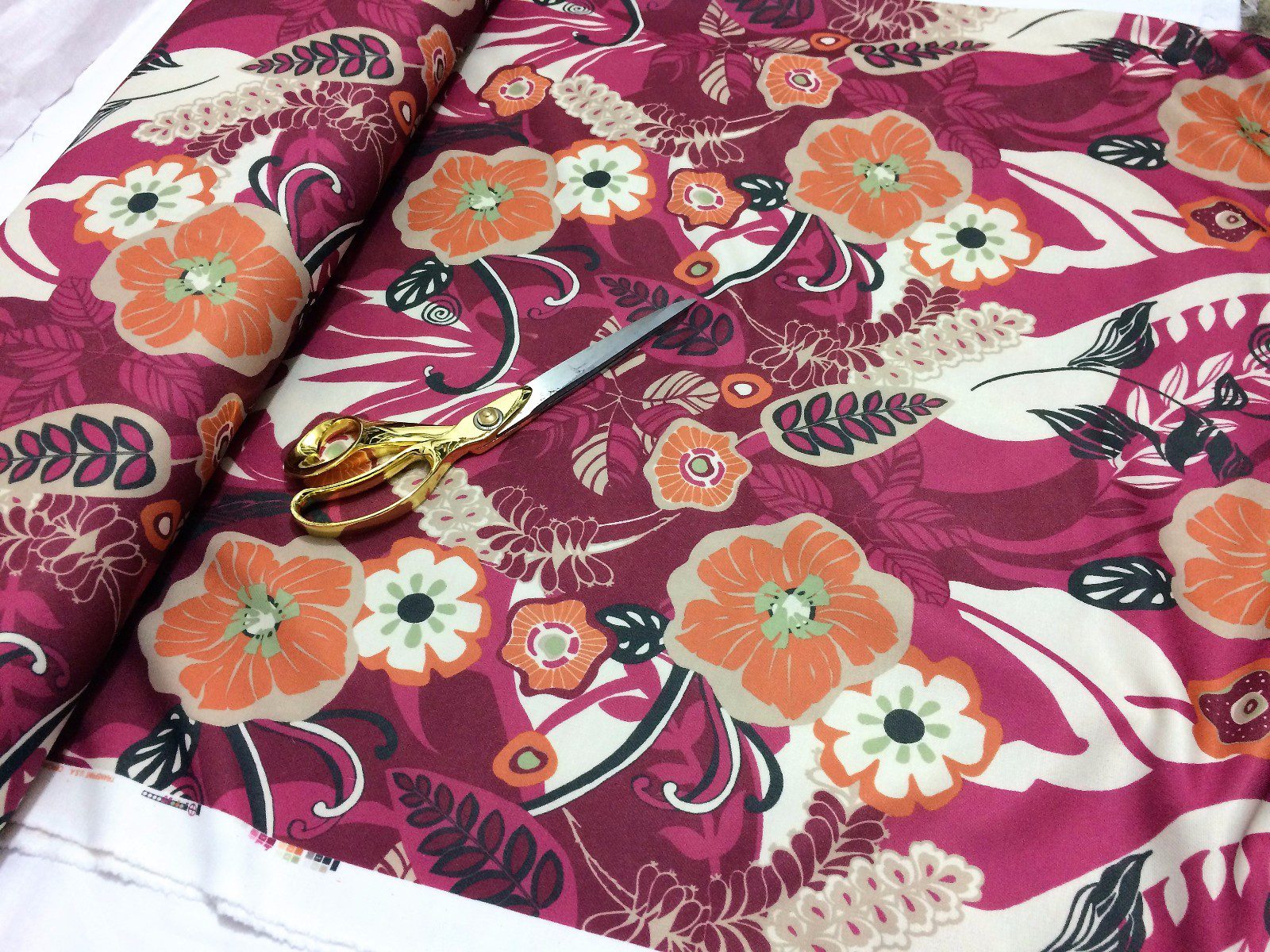 This high-quality medium weight stretch jersey fabric features a bold large floral print on a soft and durable polyviscose base, ideal for stylish dresses, tops, cushions, and versatile craft projects. The fabric offers excellent 2-way stretch, a smooth drape, and breathable comfort—perfect for everyday wear, soft furnishings, and decorative sewing.