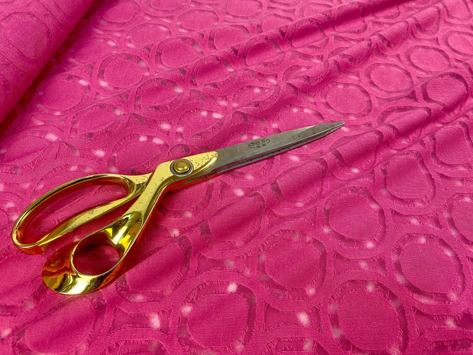Fuschia Pink Stretch Burnout Circles Devore Fabric – Bridal, Craft & Dressmaking 🎨 Vibrant Fuschia Pink – Eye-catching shade ✂️ Stretch Burnout Circles – Unique devore pattern 👰 Perfect for Bridal & Dressmaking 🧵 Ideal for Crafts & Decorative Projects Product Details: This Fuschia Pink Stretch Burnout Circles Devore Fabric combines elegance with versatility. Featuring a semi-transparent devore design with circular burnout patterns, it is ideal for creating statement bridal gowns, elegant dresses, and high-end craft projects. The fabric’s slight stretch provides comfort and flexibility while maintaining its luxurious drape. Its vivid fuschia pink colour adds bold character to any creation. Material: Stretch devore (burnout) fabric Colour: Fuschia Pink Pattern: Circular burnout design Width: Approx. 150cm Stretch: 2-way stretch Ideal For: Bridal wear, dresses, craft projects Sold By: The Yard (multiple Yards sent as one continuous piece)