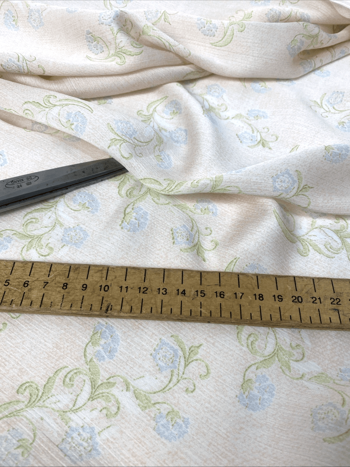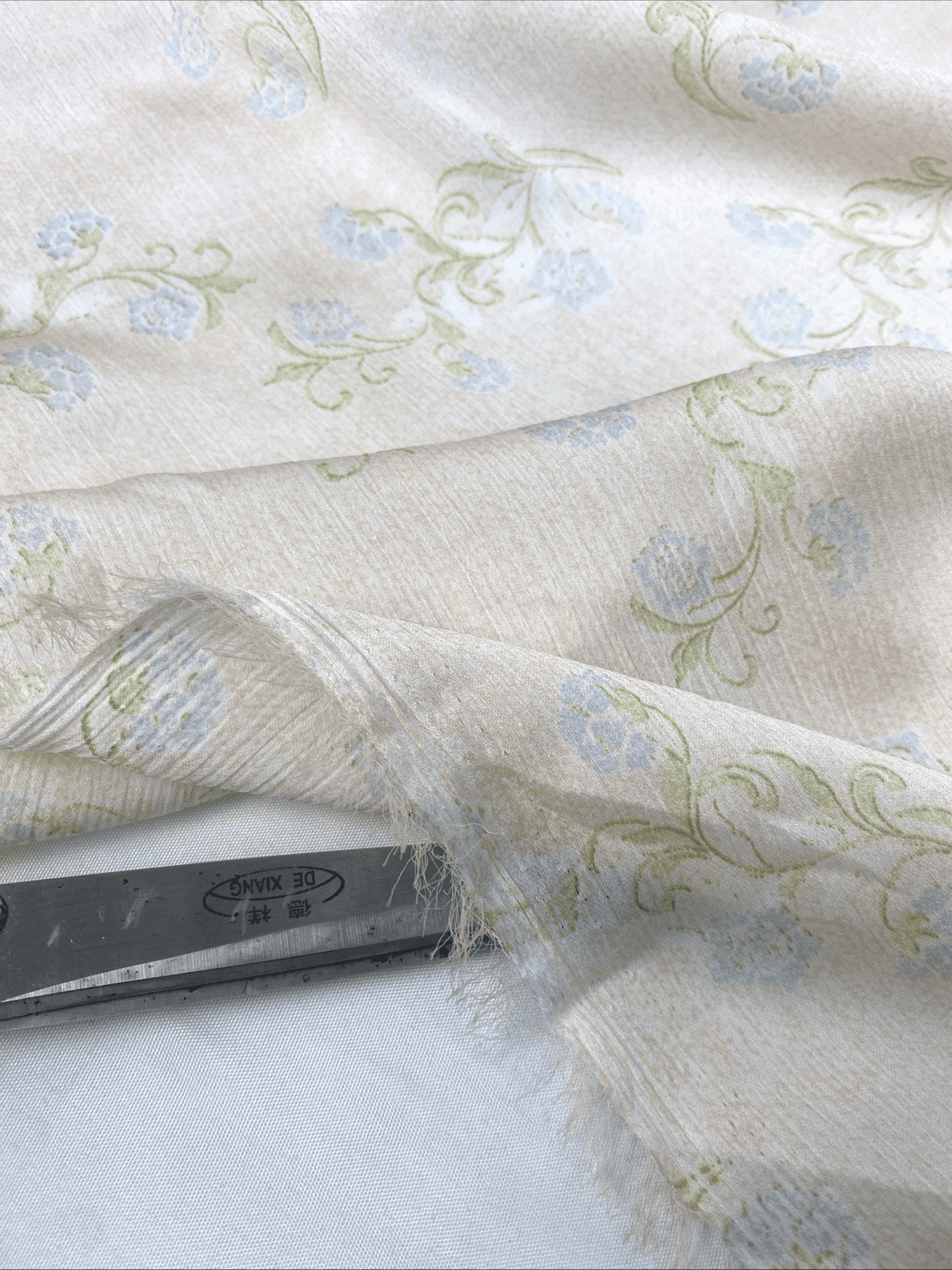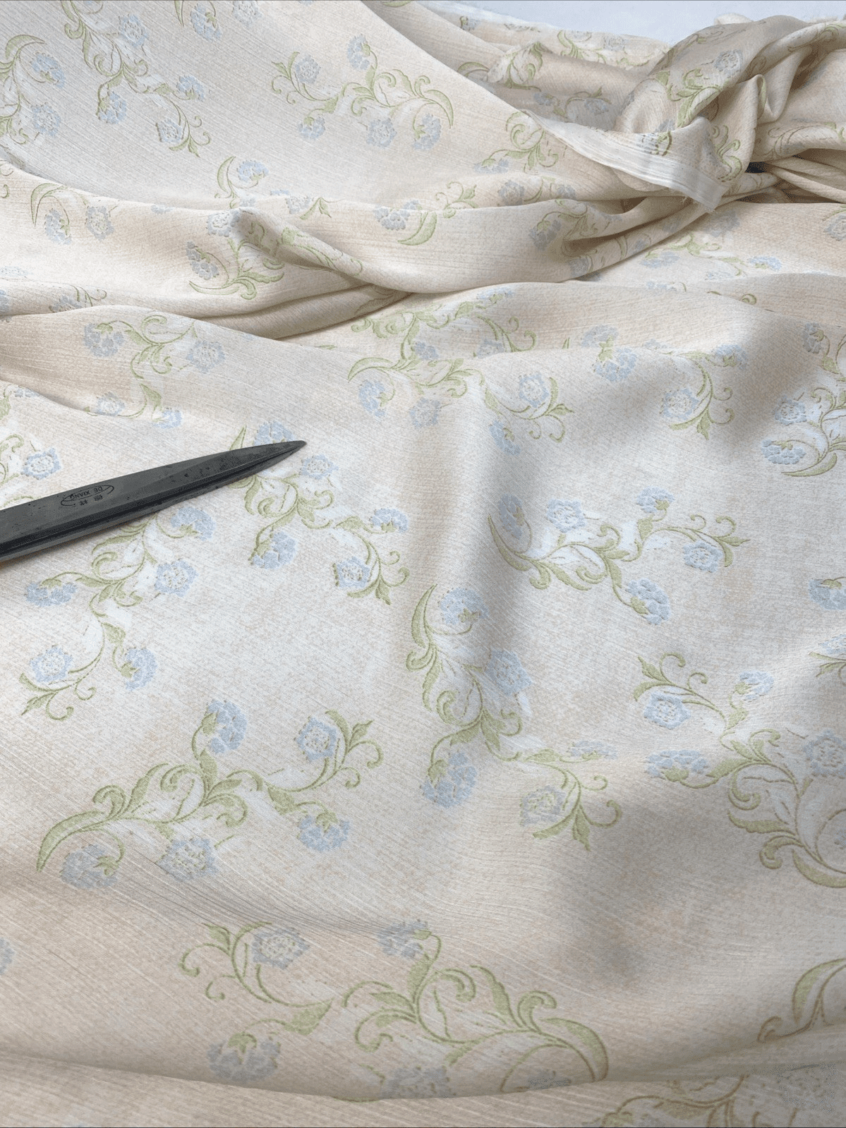 Add a breezy, elegant touch to your next sewing project with this stunning crinkle polyester fabric, perfect for summer dresses, skirts, blouses, and more. Featuring a soft pale peach background with delicate blue and green floral print, this lightweight fabric drapes beautifully and is easy to care for.