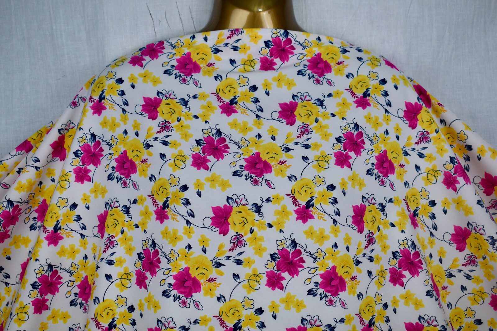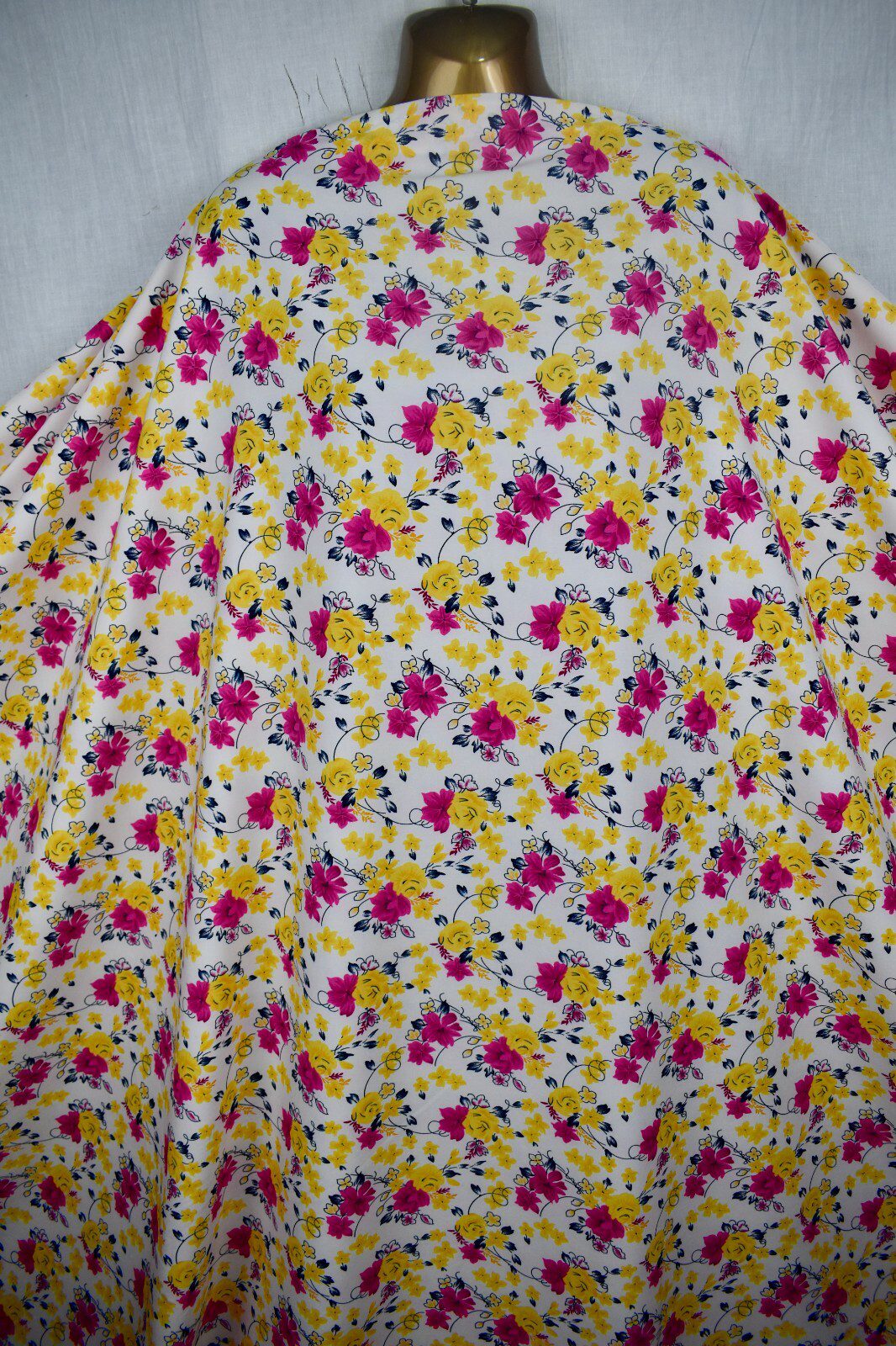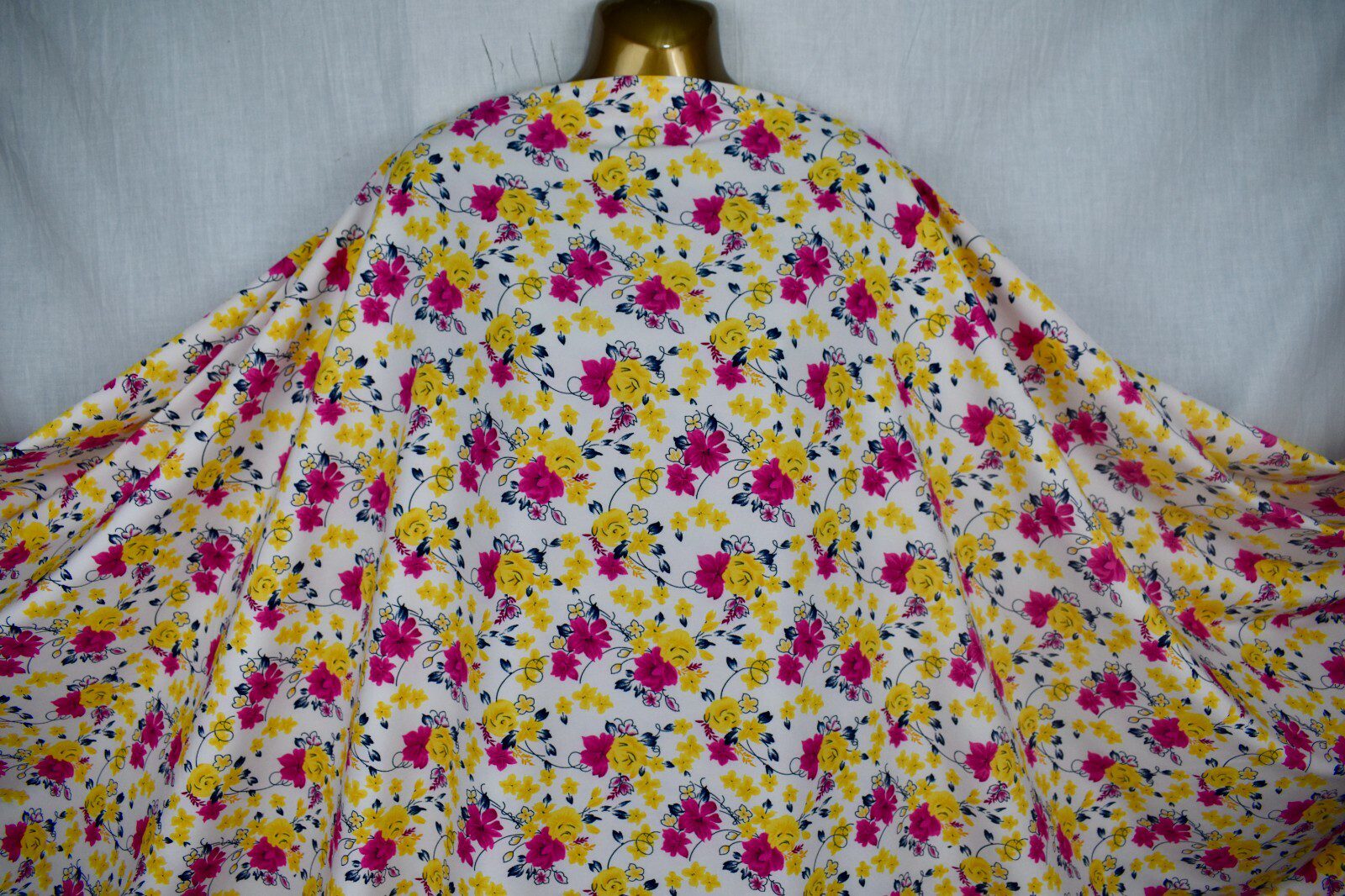 This soft and lightweight polyester microfiber fabric features a cheerful pink and yellow floral print, making it perfect for vibrant dresses, blouses, skirts, and crafts. The fine weave offers a silky texture with a breathable, flowing drape—ideal for warm-weather wear, layering, or decorative textile projects. Easy to sew and care for, it’s a great choice for both beginners and experienced makers.