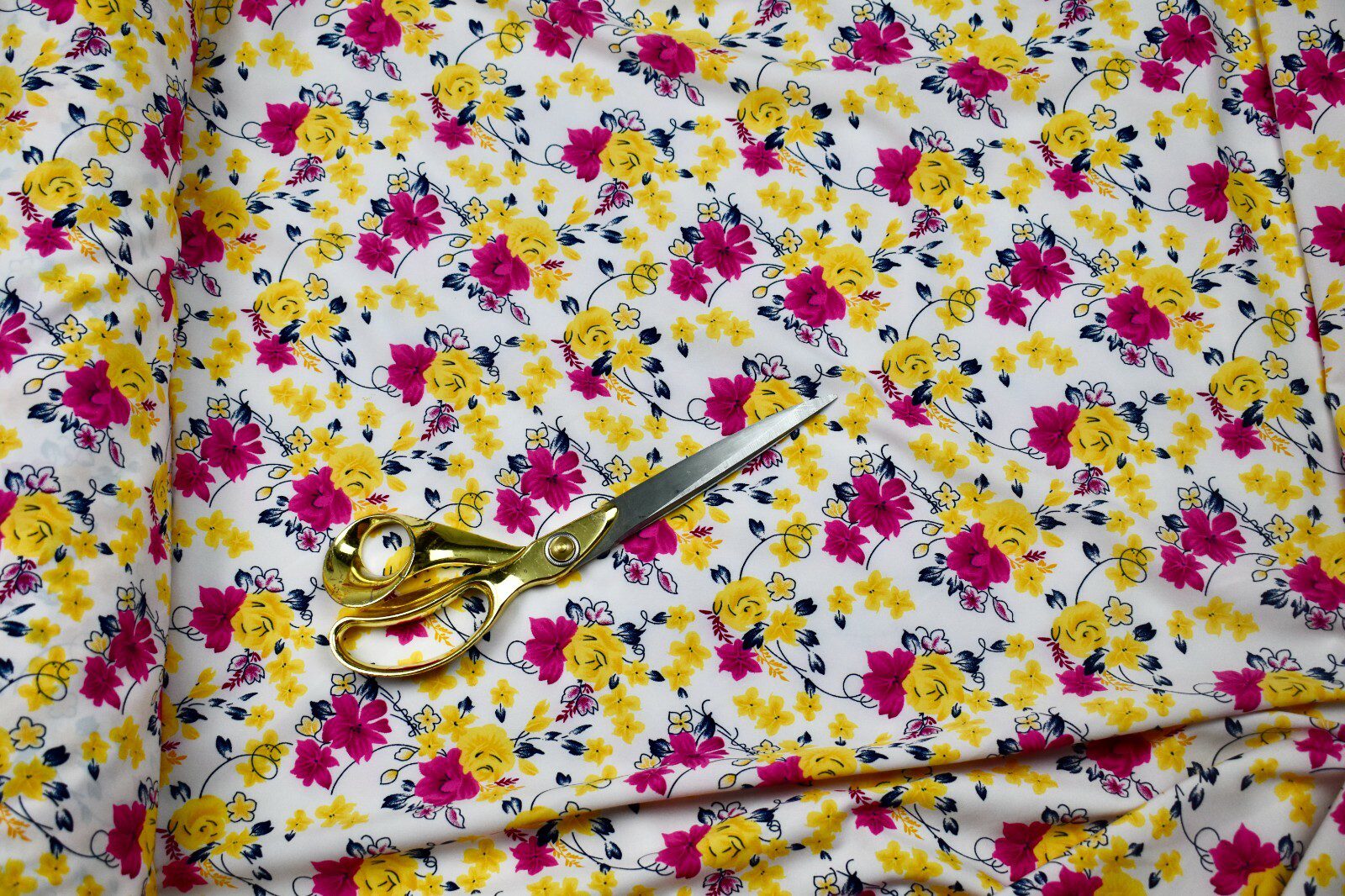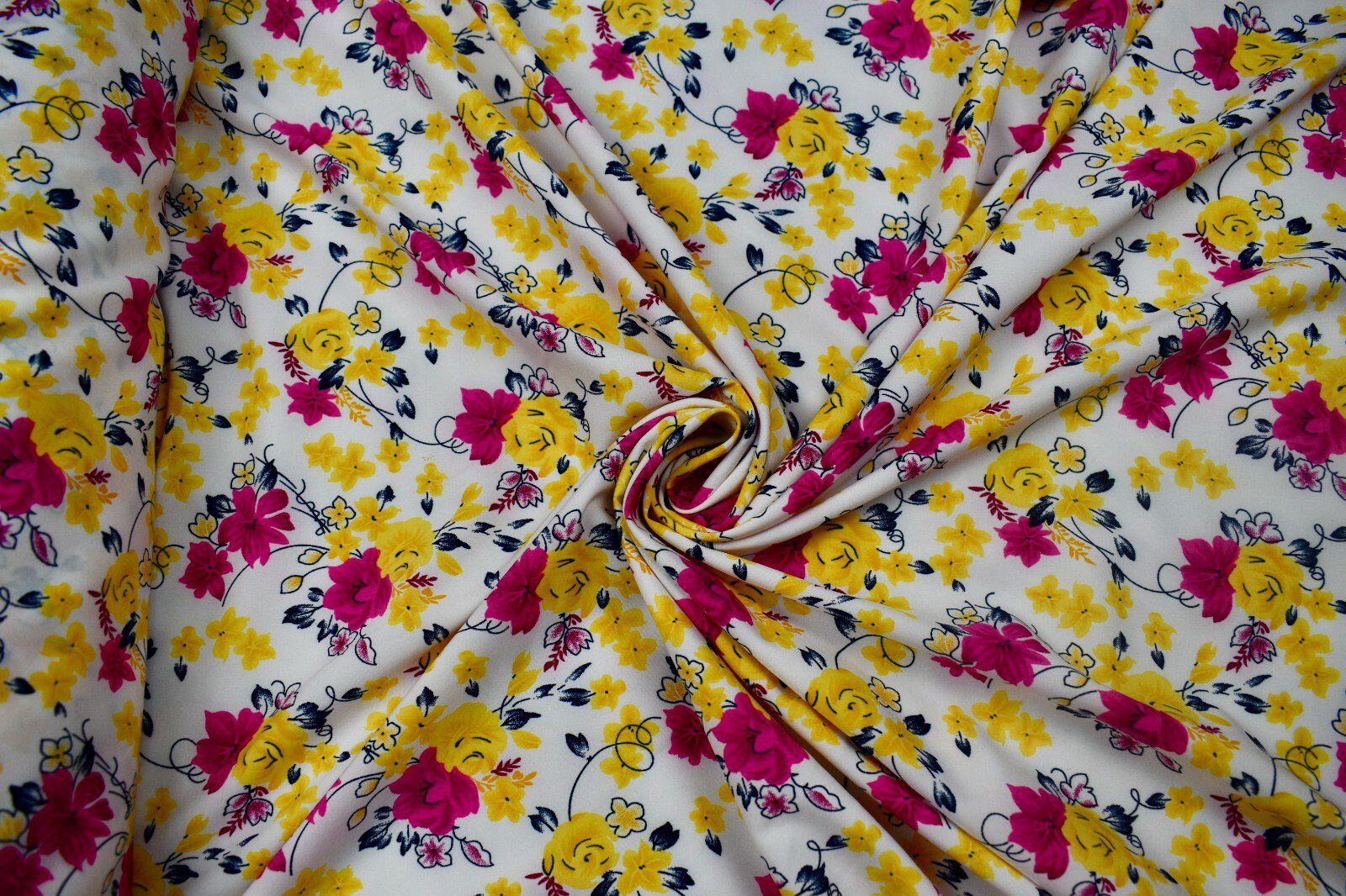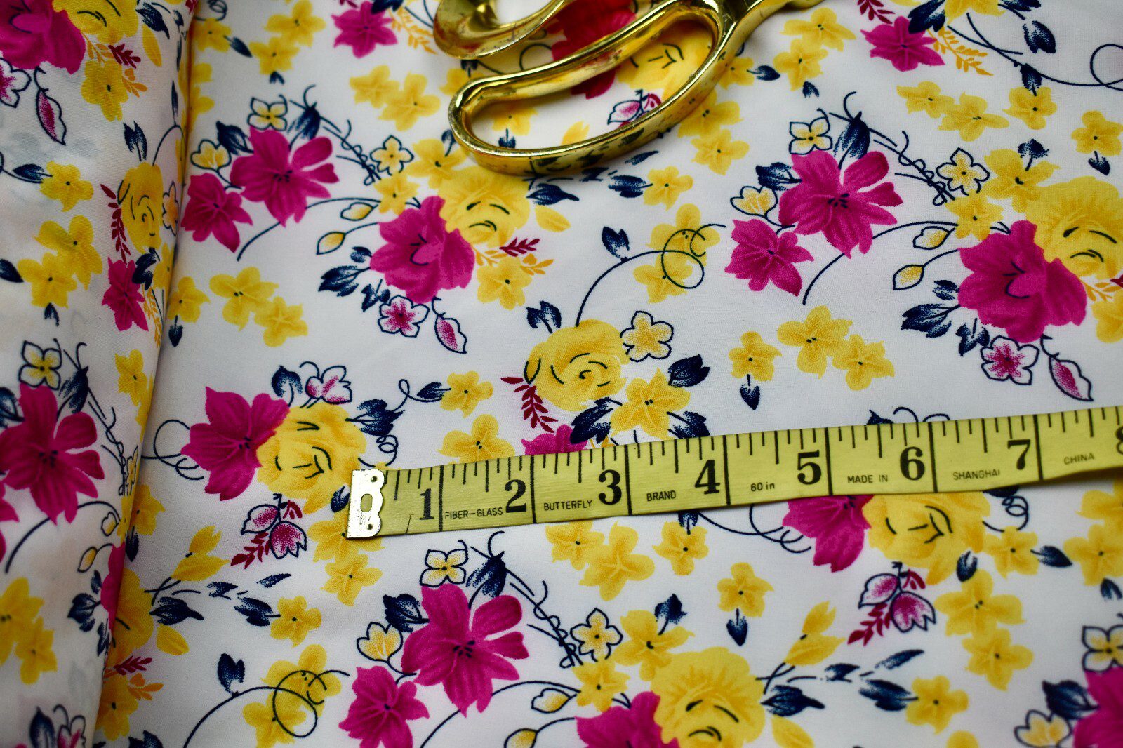 This soft and lightweight polyester microfiber fabric features a cheerful pink and yellow floral print, making it perfect for vibrant dresses, blouses, skirts, and crafts. The fine weave offers a silky texture with a breathable, flowing drape—ideal for warm-weather wear, layering, or decorative textile projects. Easy to sew and care for, it’s a great choice for both beginners and experienced makers.
