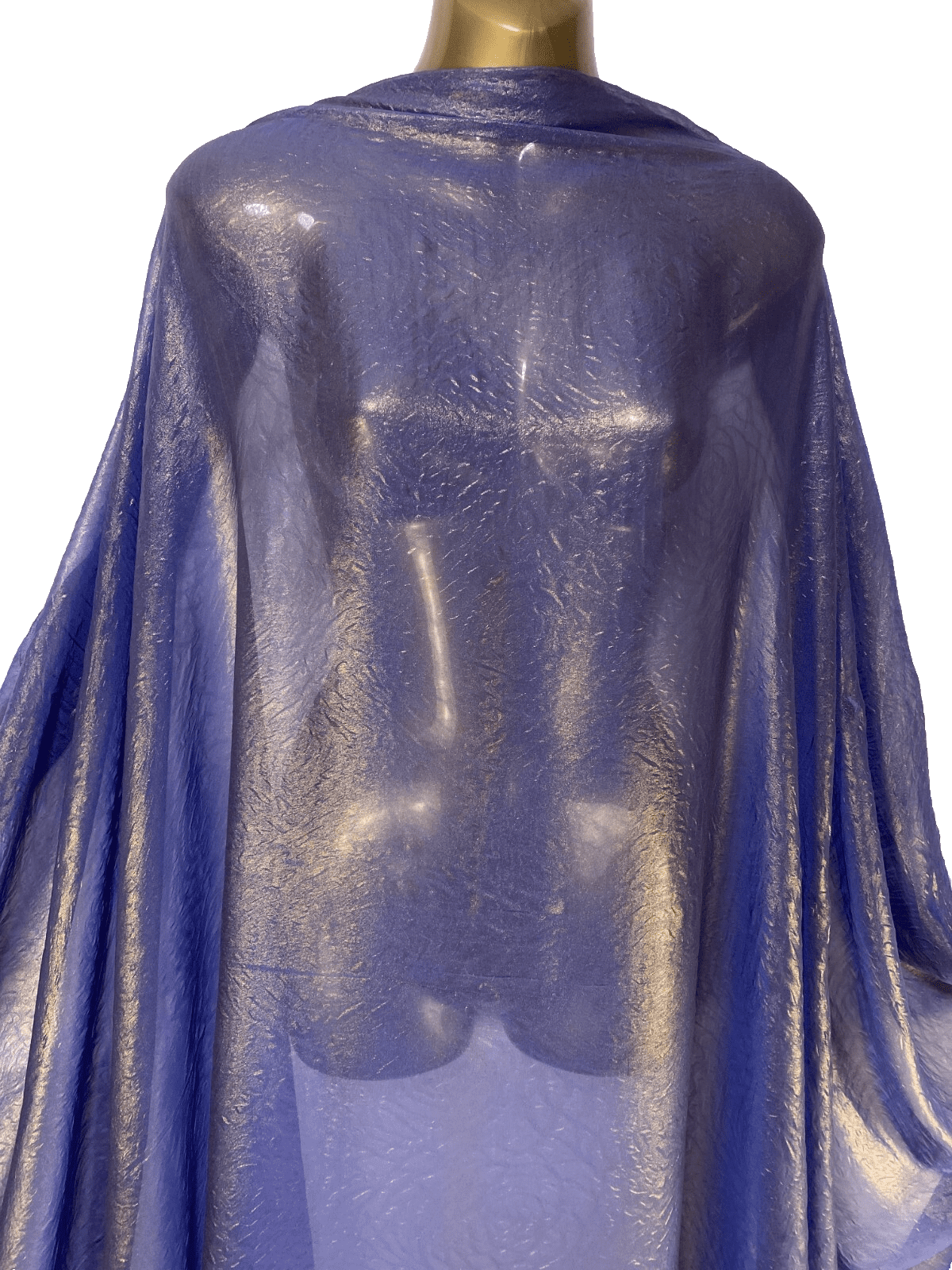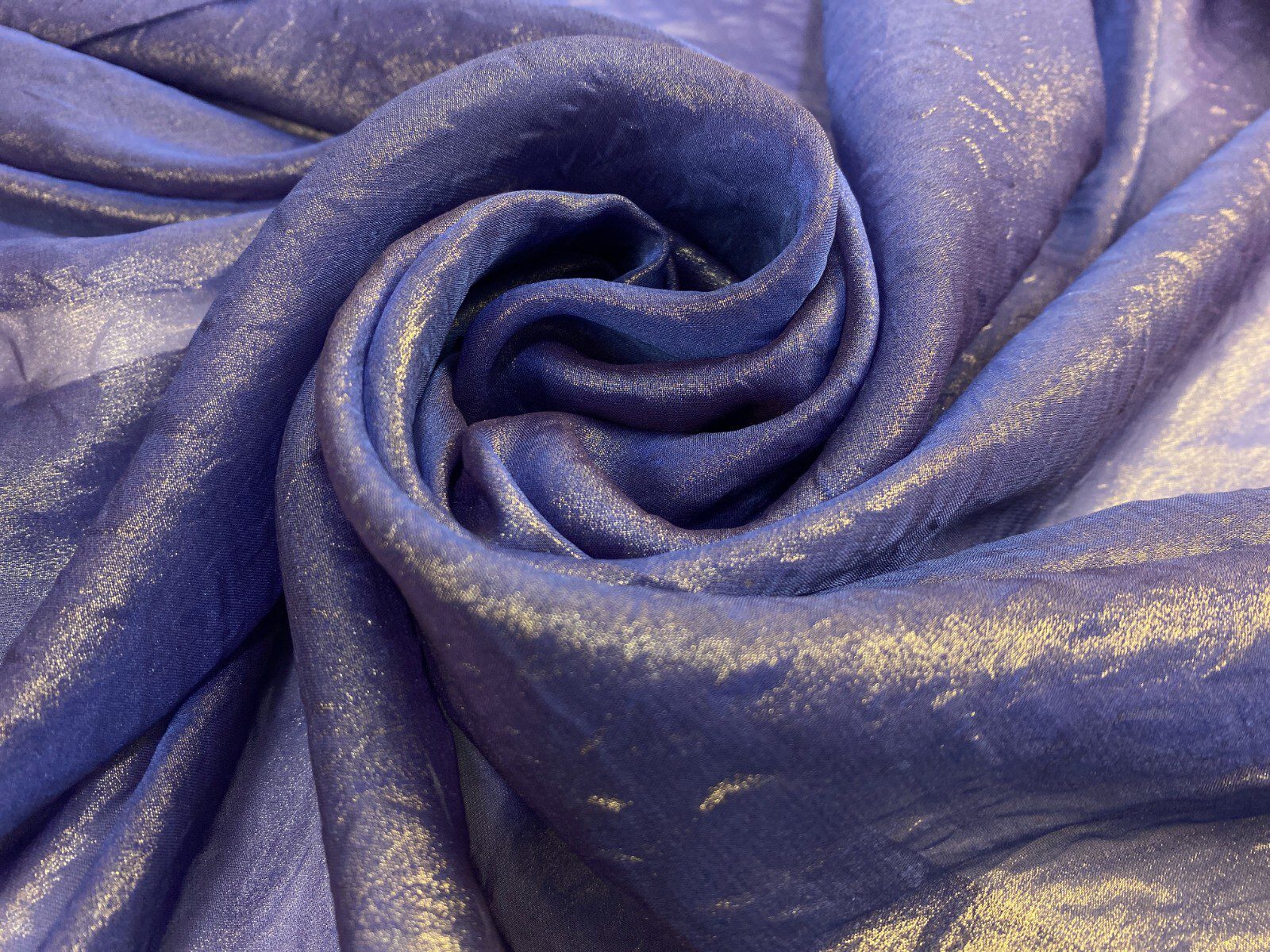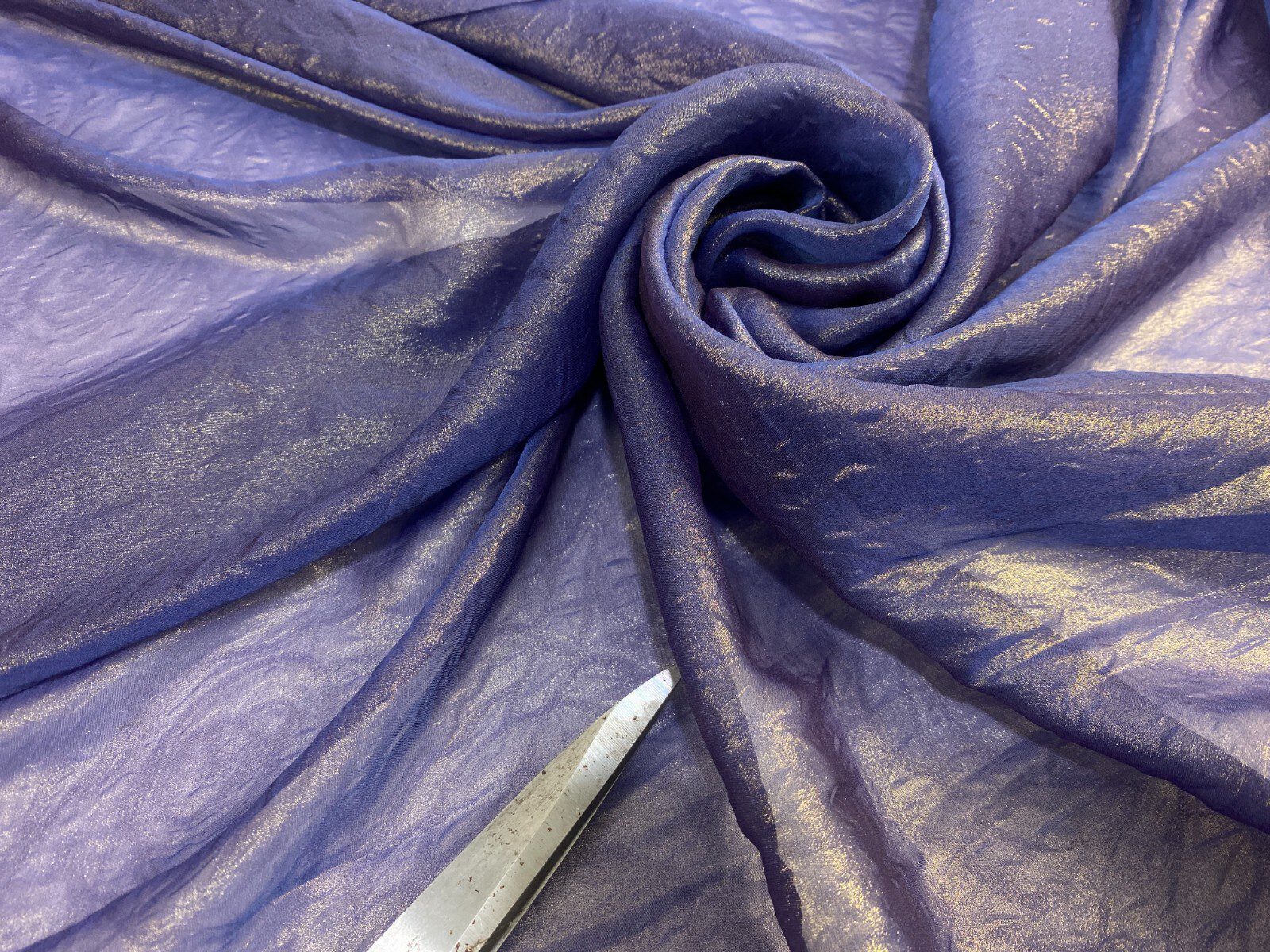 Add luxury and shimmer to your creations with this eye-catching Two Tone Crushed Chiffon Fabric. Featuring a unique purple and gold iridescent sheen, this lightweight material shimmers beautifully as it moves, making it ideal for eveningwear, bridal accents, scarves, draping, crafts, and more.