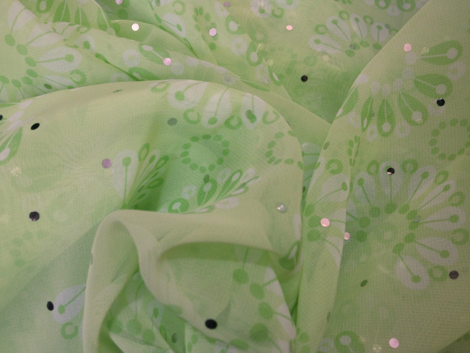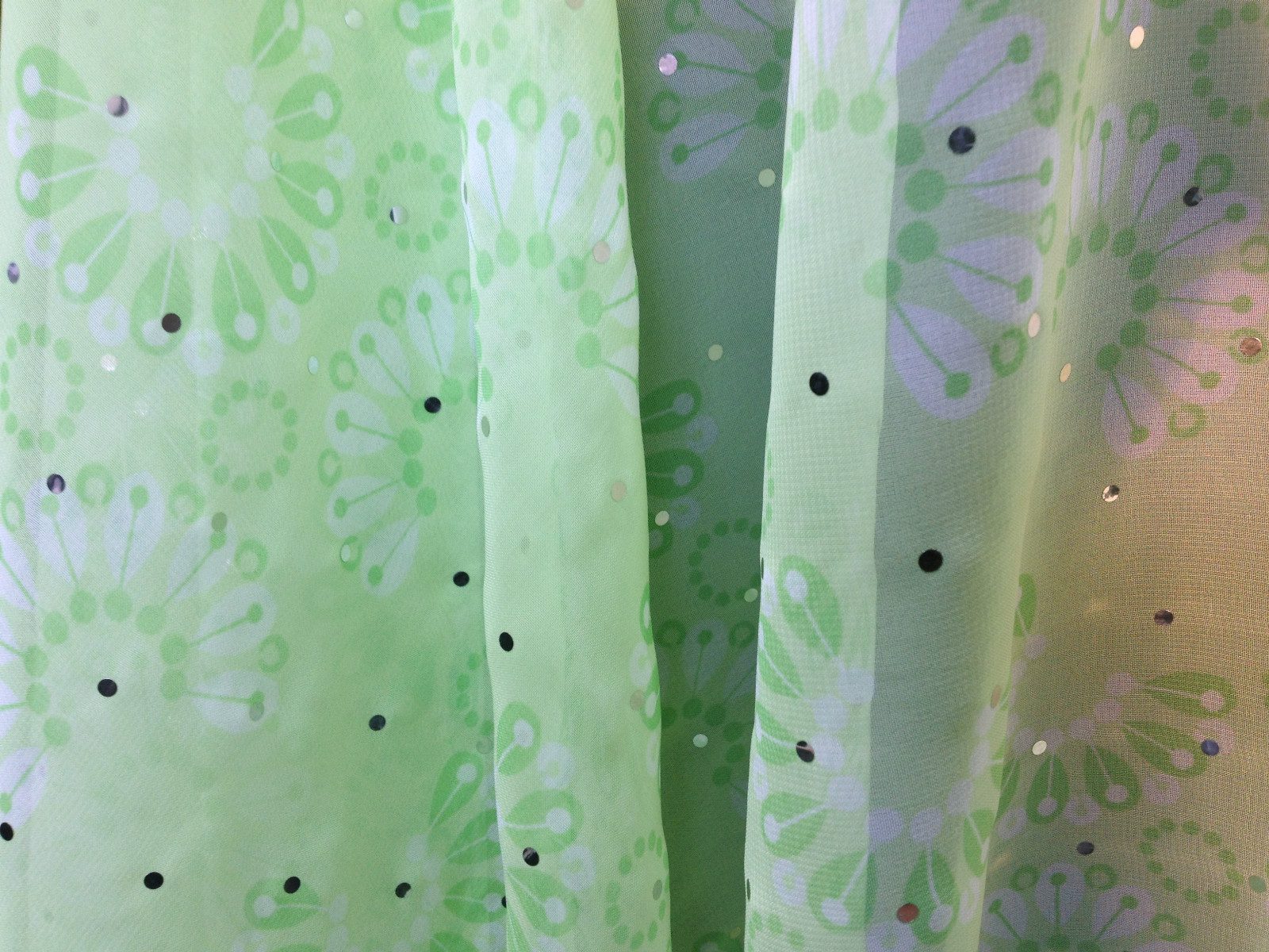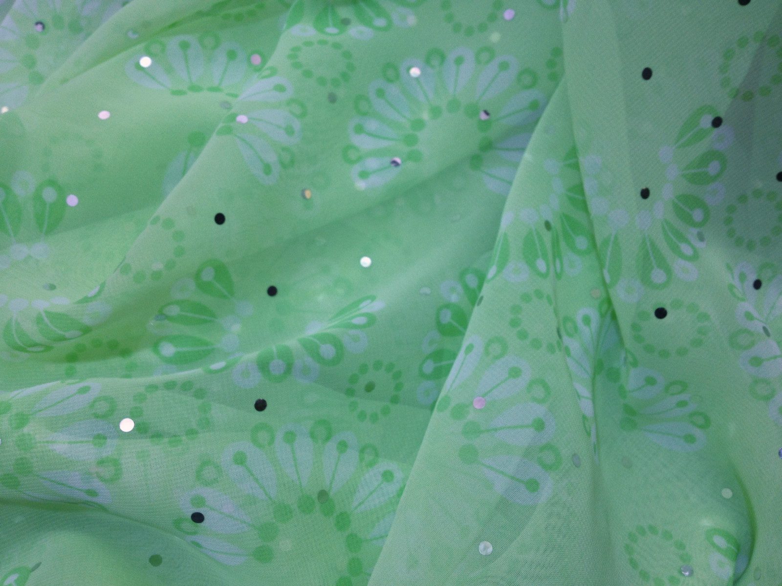 This eye-catching designer chiffon fabric features a vibrant lime green base adorned with a floral print and delicate sequin embellishments, adding sparkle and sophistication to any outfit. Lightweight and floaty, it’s ideal for creating statement dresses, evening gowns, sarongs, or bridal party looks. The sequins catch the light beautifully, while the chiffon drapes effortlessly — perfect for layered or flowing designs.