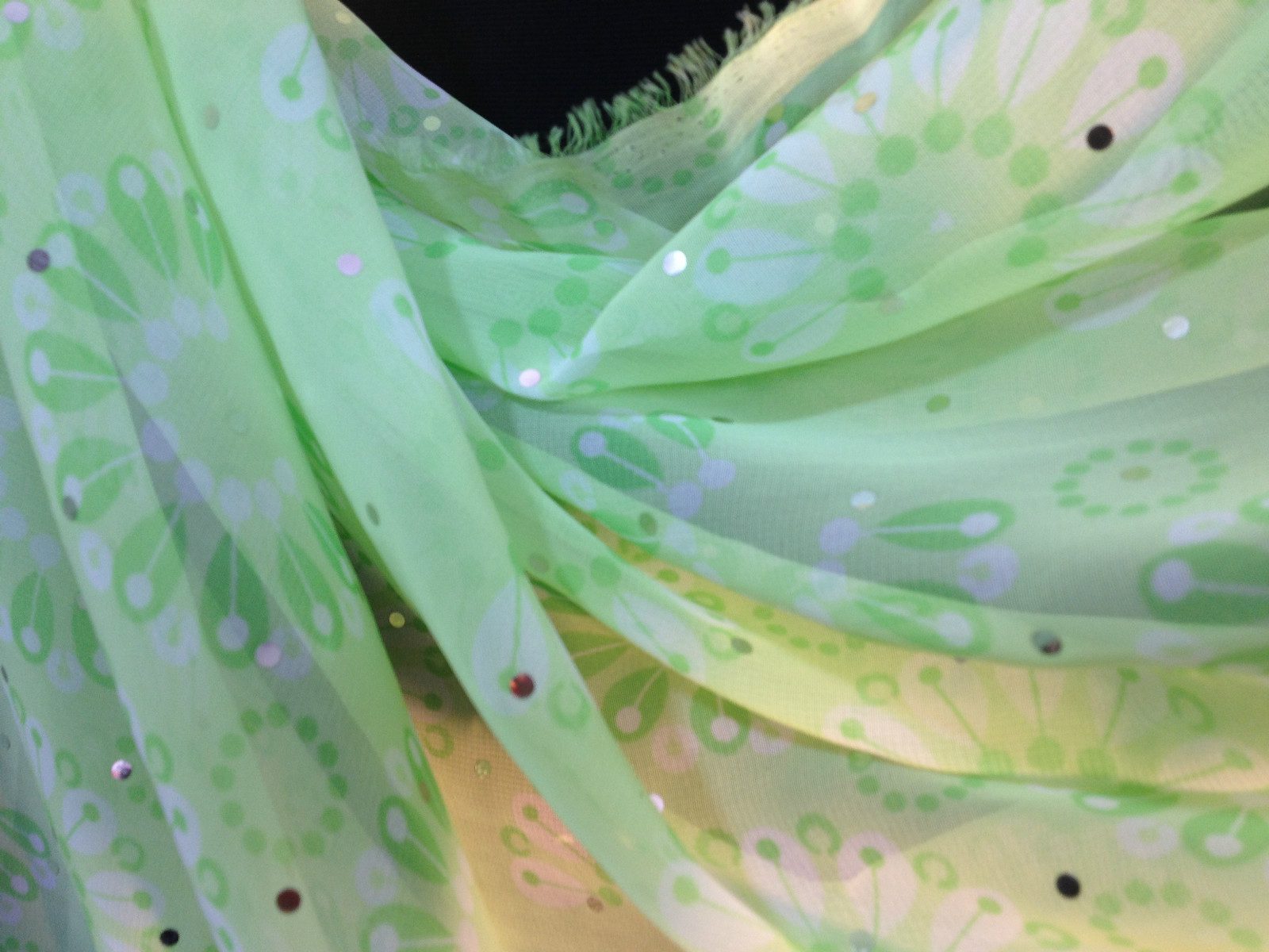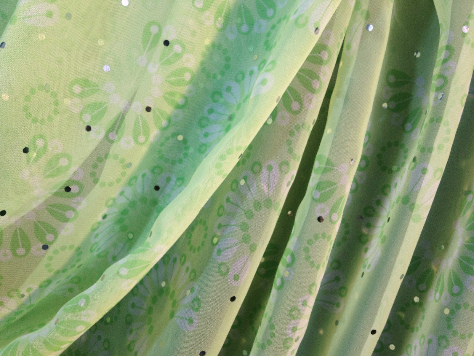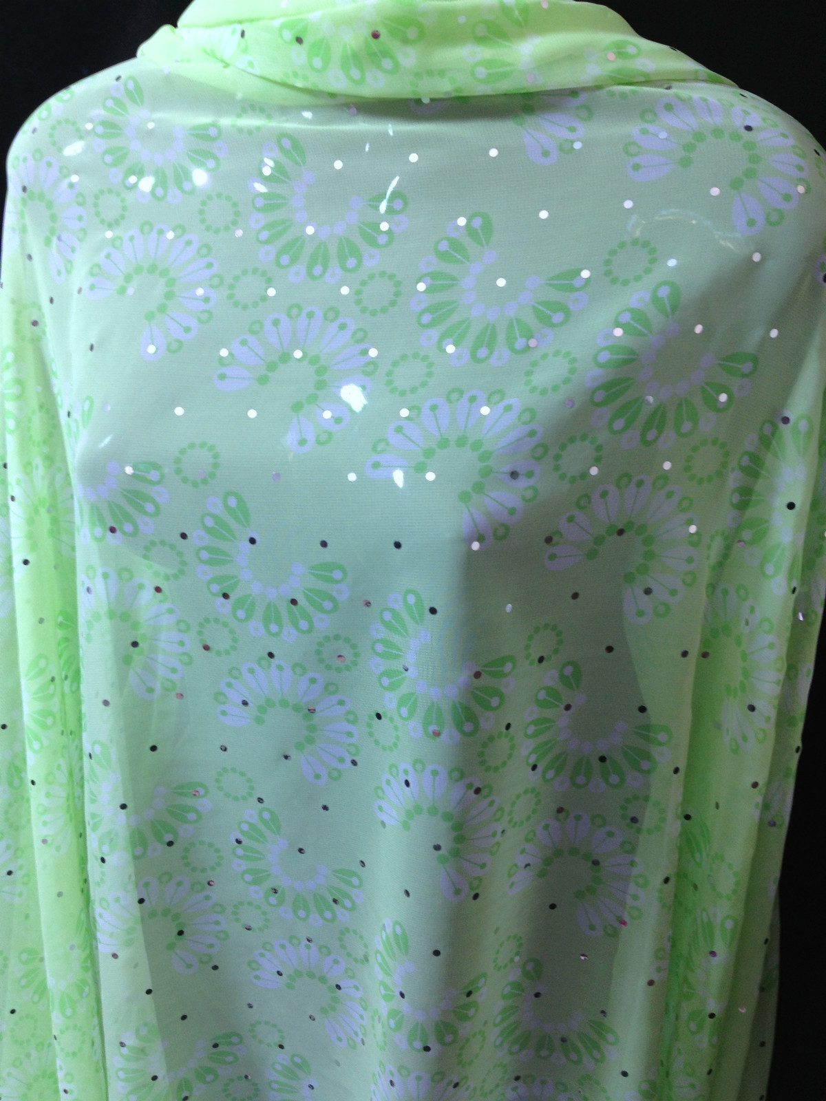 This eye-catching designer chiffon fabric features a vibrant lime green base adorned with a floral print and delicate sequin embellishments, adding sparkle and sophistication to any outfit. Lightweight and floaty, it’s ideal for creating statement dresses, evening gowns, sarongs, or bridal party looks. The sequins catch the light beautifully, while the chiffon drapes effortlessly — perfect for layered or flowing designs.
