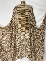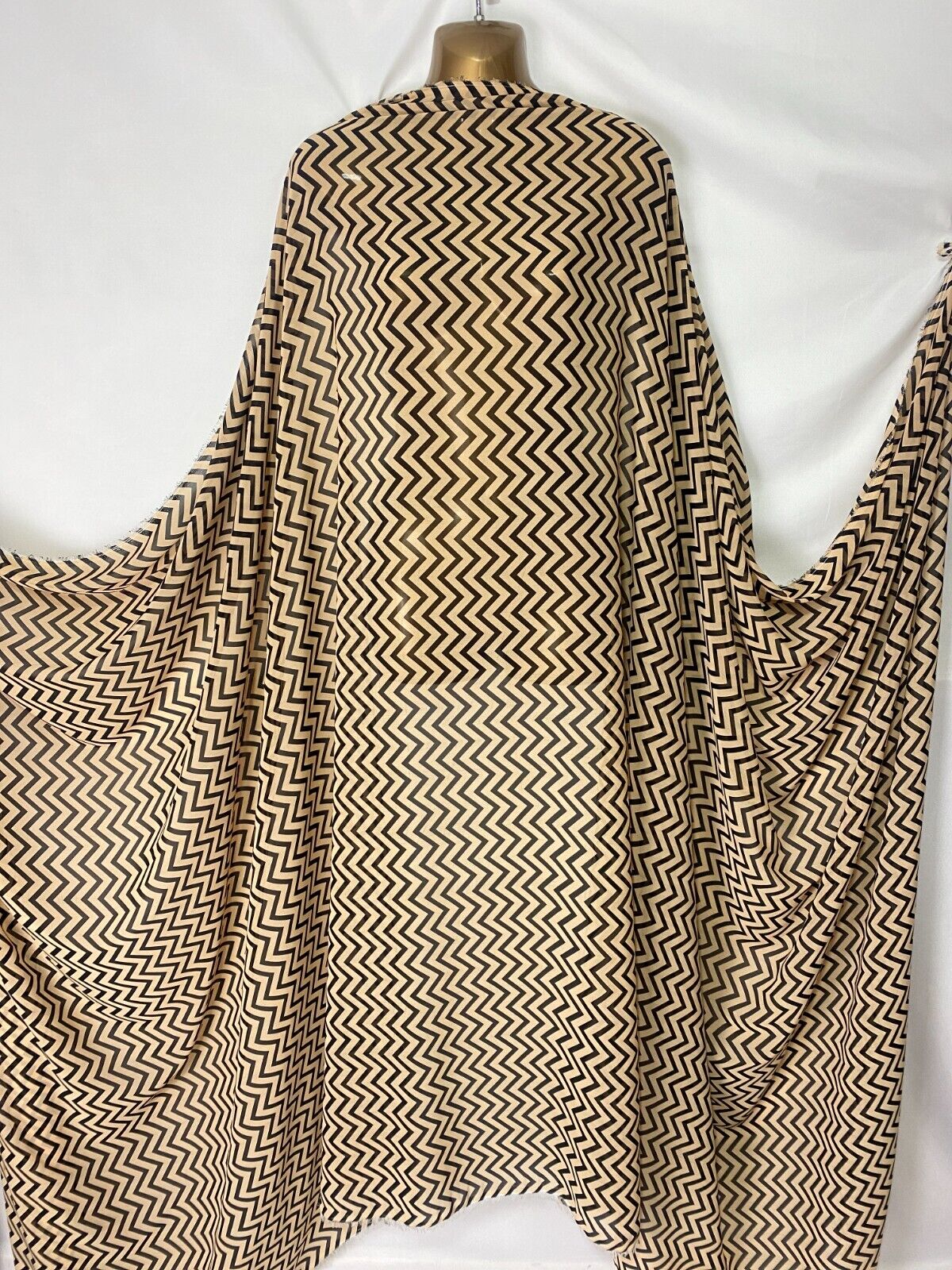 This lightweight smooth chiffon fabric showcases a bold chevron (zig zag) print, perfect for adding movement and modern flair to your sewing projects. Semi-sheer with a soft, fluid drape, it’s ideal for flowy dresses, scarves, overlays, and stylish craft work. Its breathable and airy quality makes it a favorite for warm-weather fashion and layered looks.