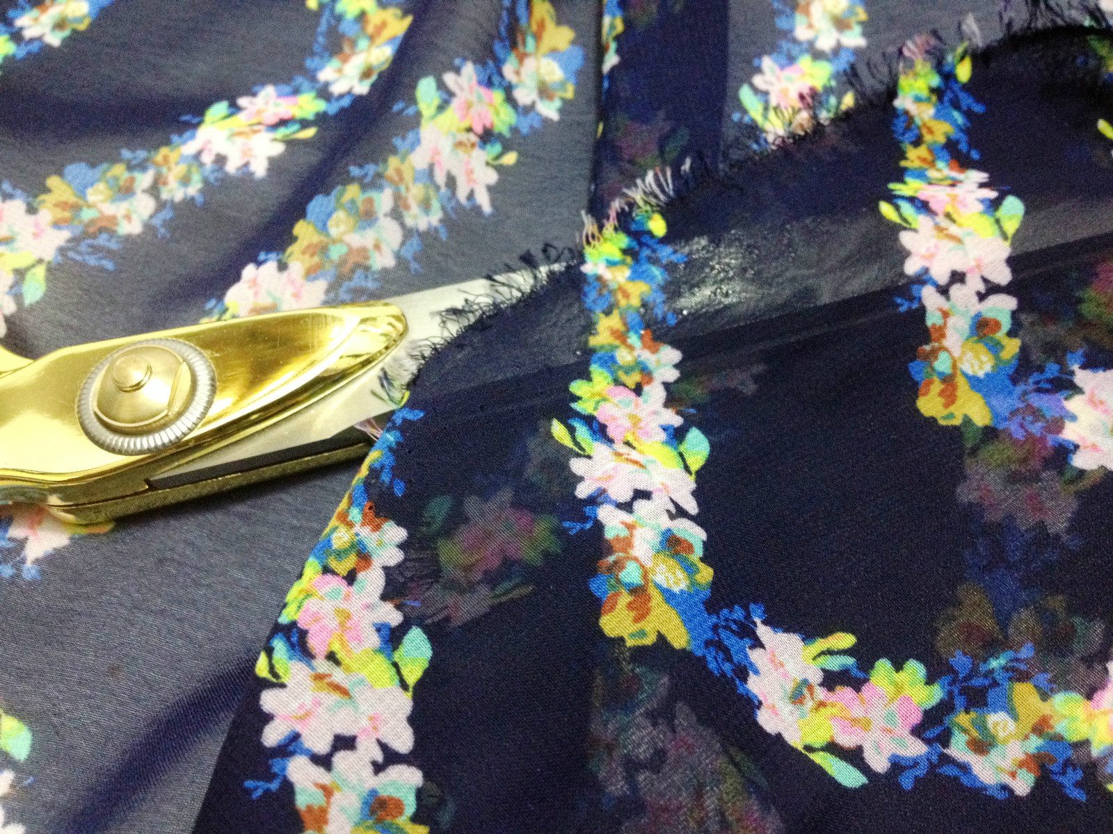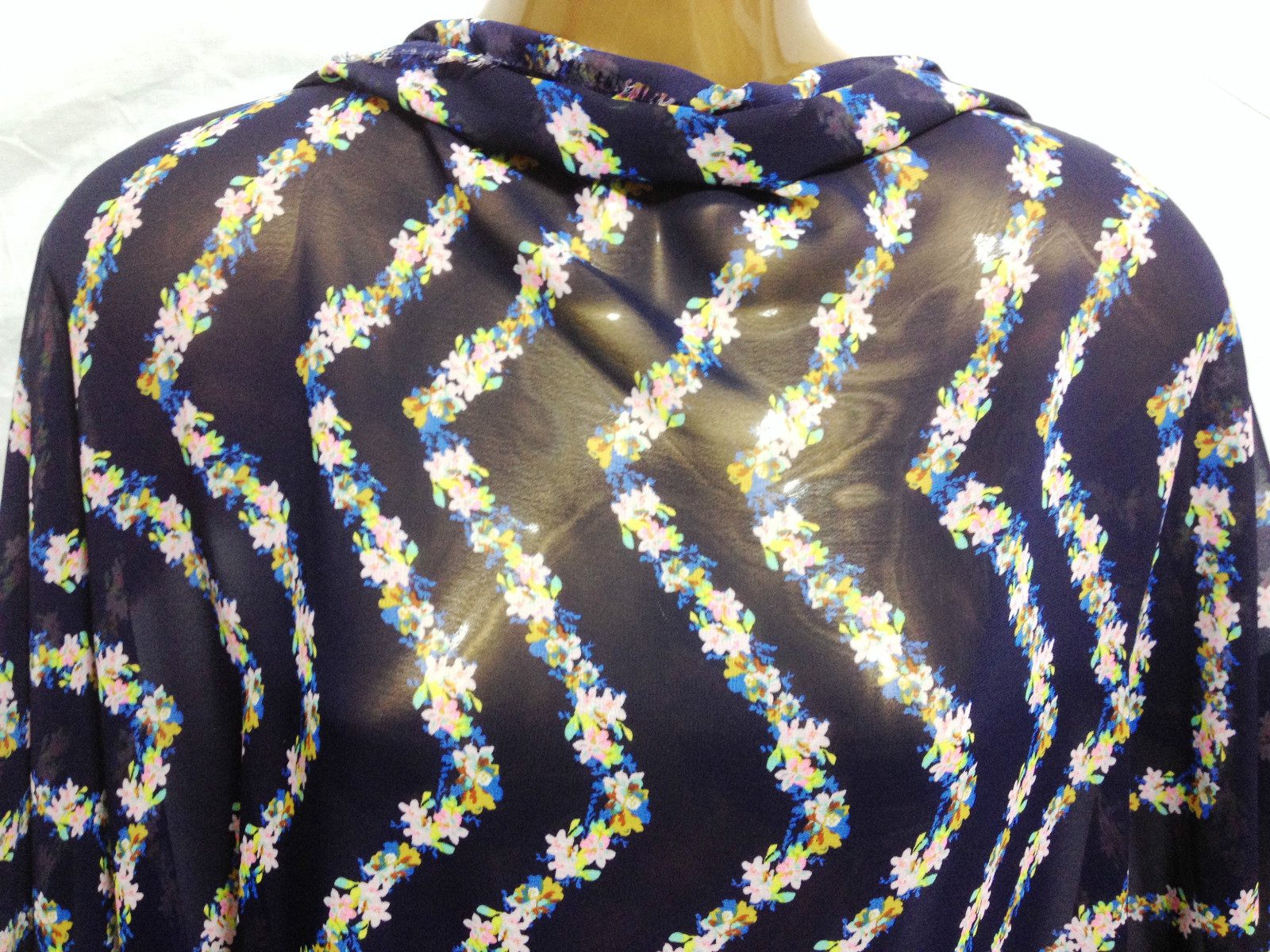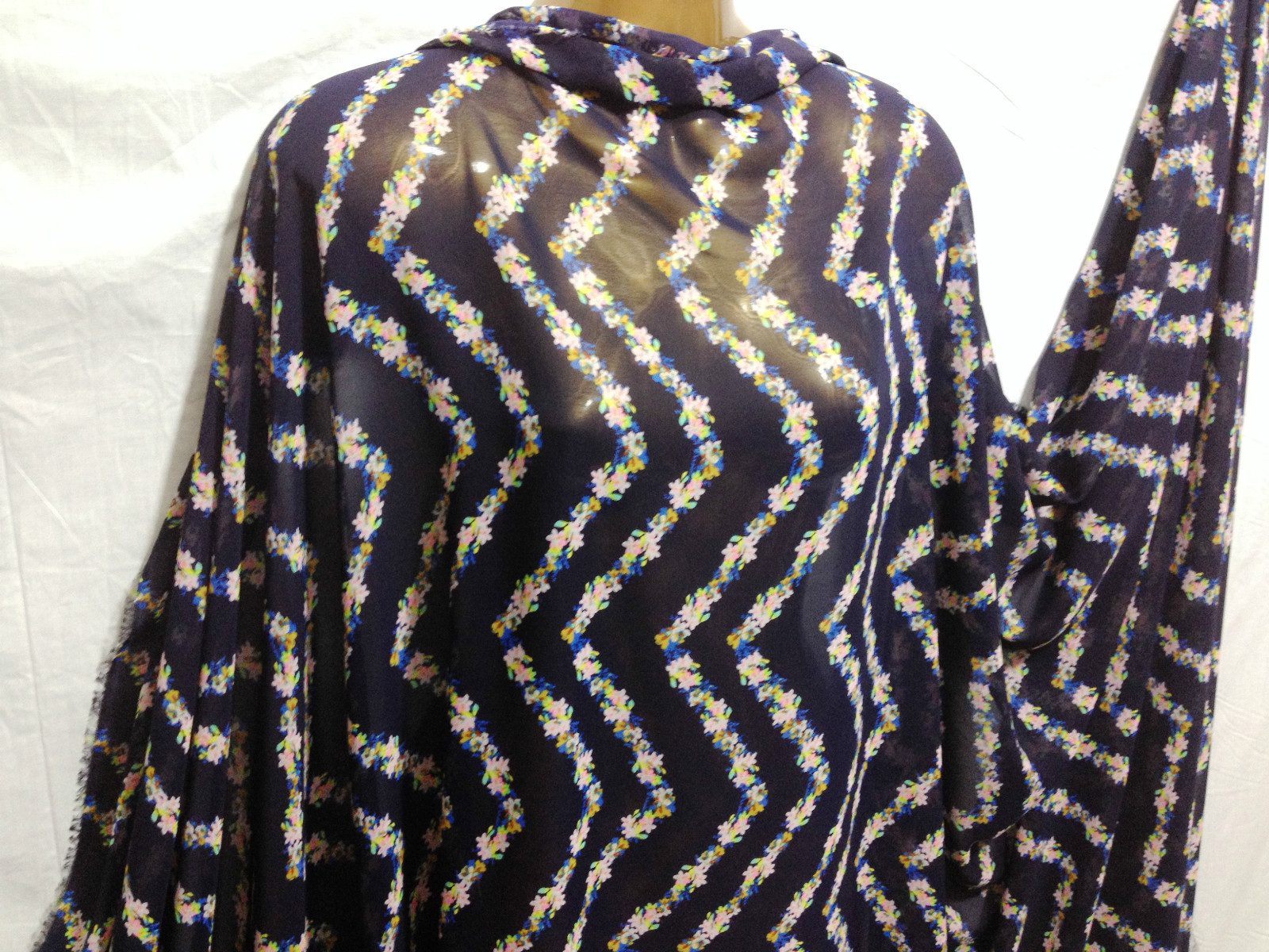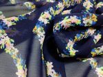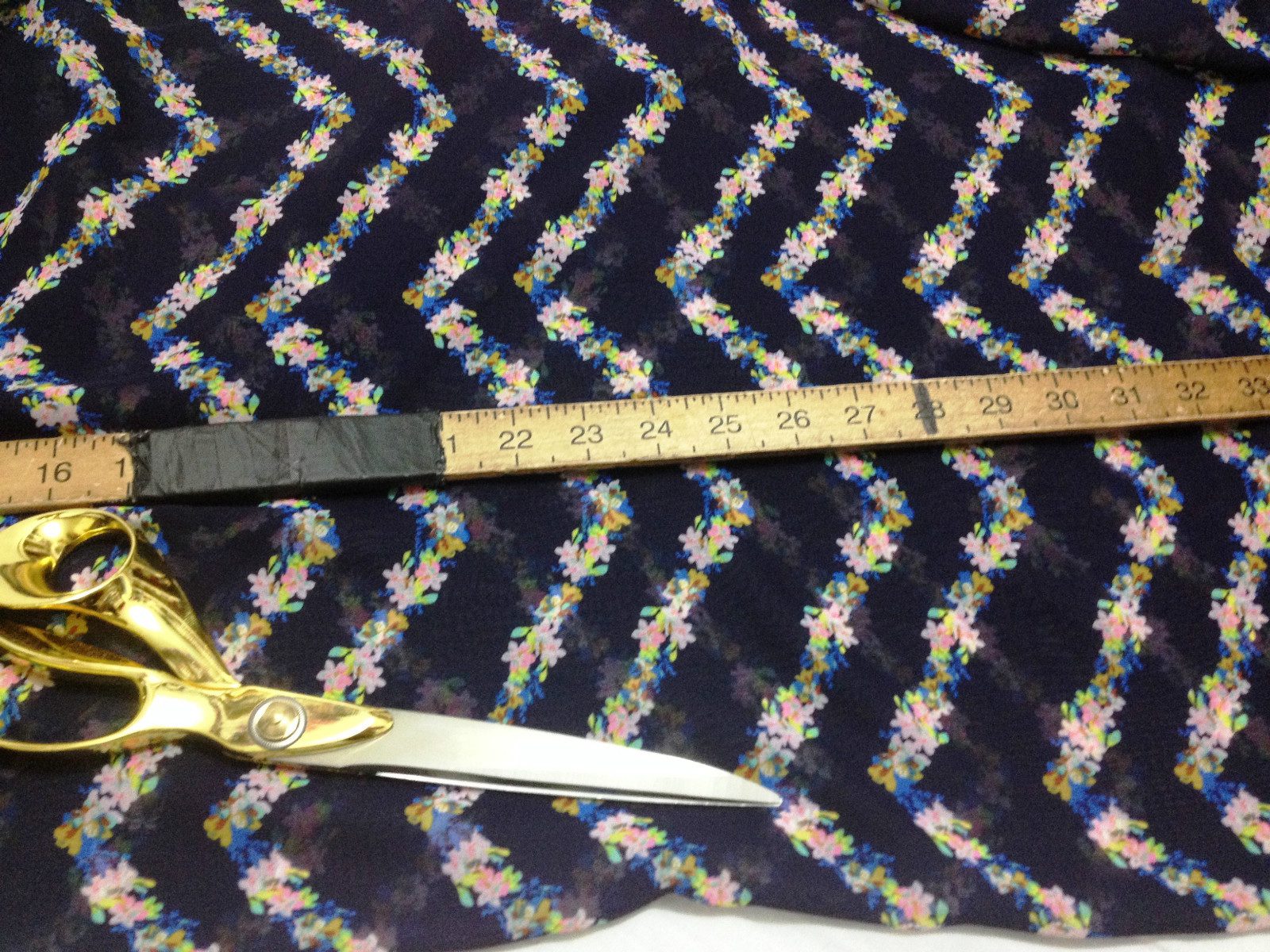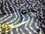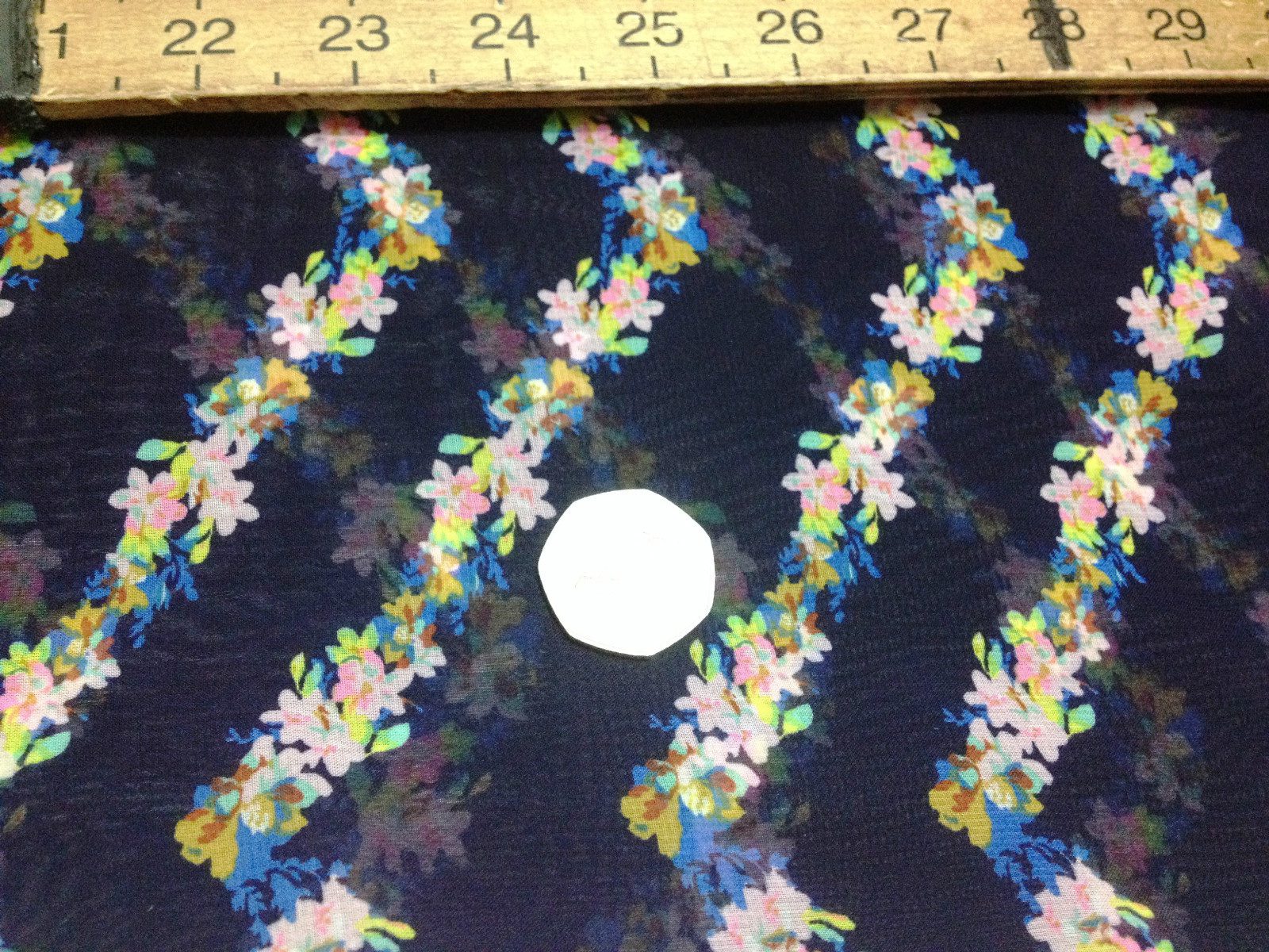 This elegant smooth chiffon fabric in dark navy features a stylish combination of floral motifs and chevron stripes, creating a modern yet feminine look. Lightweight and semi-sheer with a beautiful drape, it’s ideal for dresses, blouses, scarves, and layered craft projects. Perfect for spring/summer sewing or statement wardrobe pieces with flowing silhouettes.