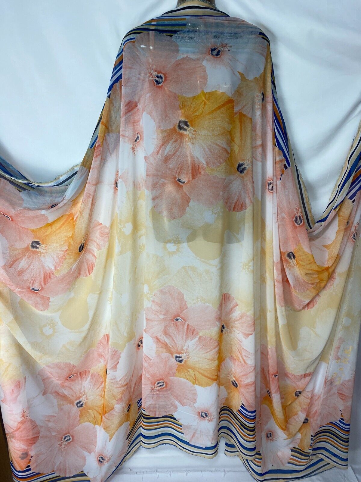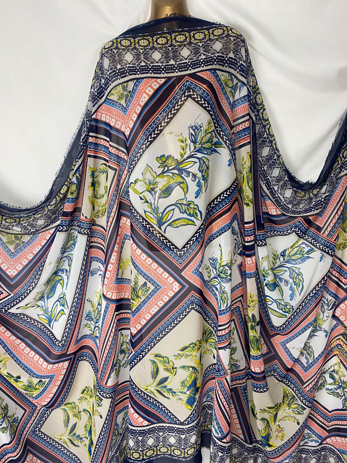 This lightweight smooth chiffon fabric features a beautiful floral double border print, ideal for garments that highlight hems, sleeves, or flowing panels. With its airy feel, soft drape, and semi-sheer finish, it’s perfect for dresses, scarves, blouses, and creative craft projects. A graceful choice for spring and summer sewing, this fabric adds movement and charm to every design.