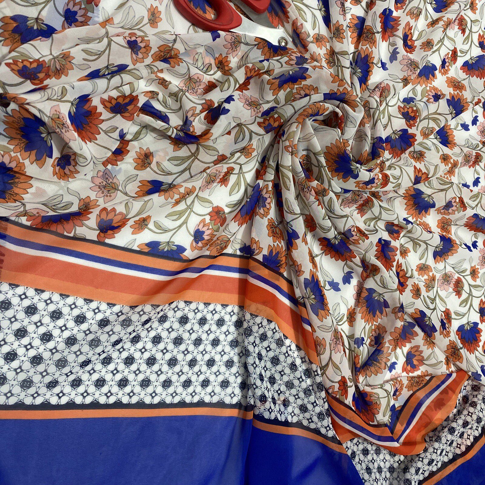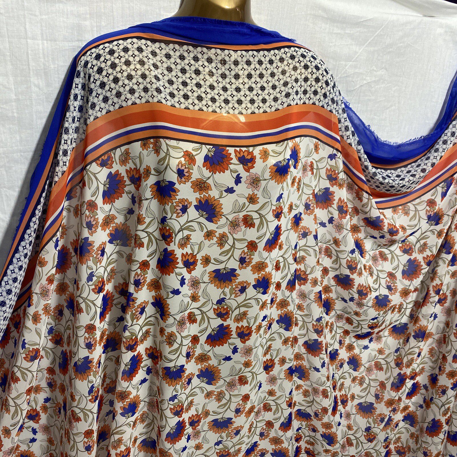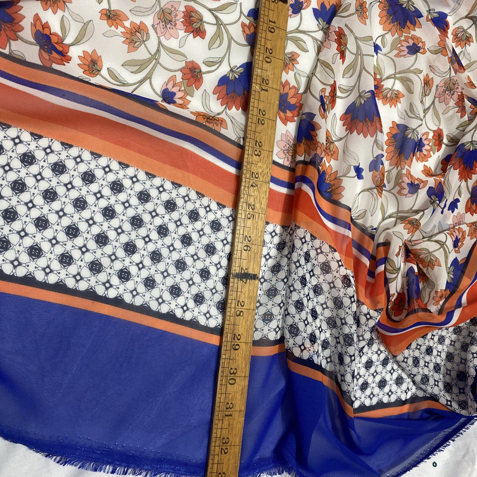 This airy smooth chiffon fabric combines a graceful floral double border print with elegant vertical stripes, creating a flowing and flattering effect perfect for fashion and craft projects. Lightweight and semi-sheer with a soft drape, it’s ideal for dresses, scarves, overlays, and occasionwear. The border runs along both selvedges, allowing for beautifully balanced garments and accessories.