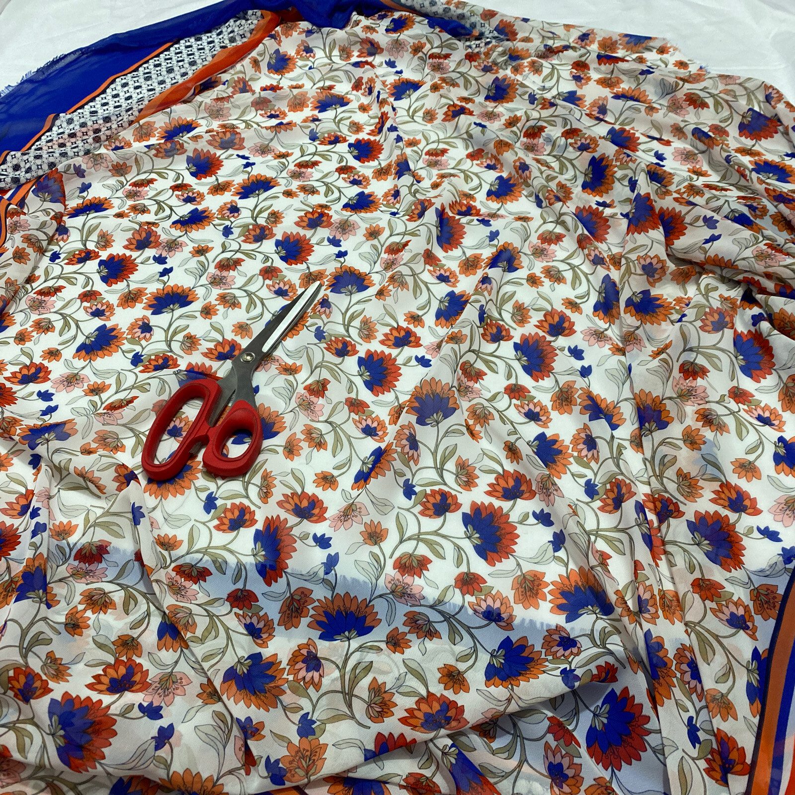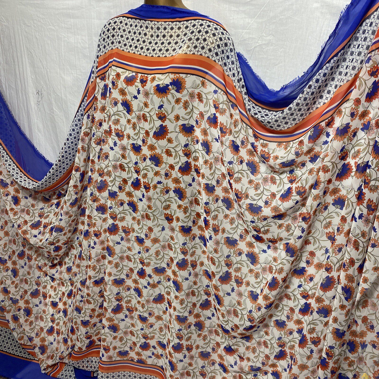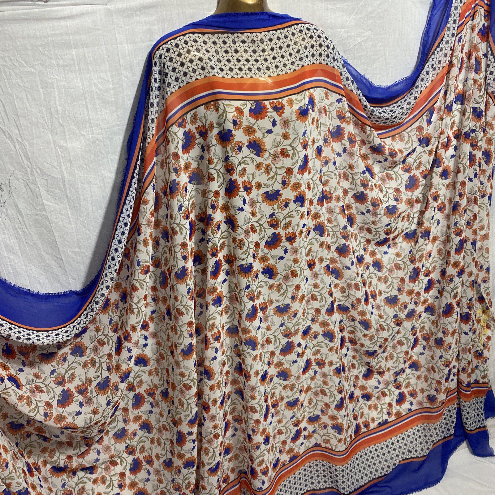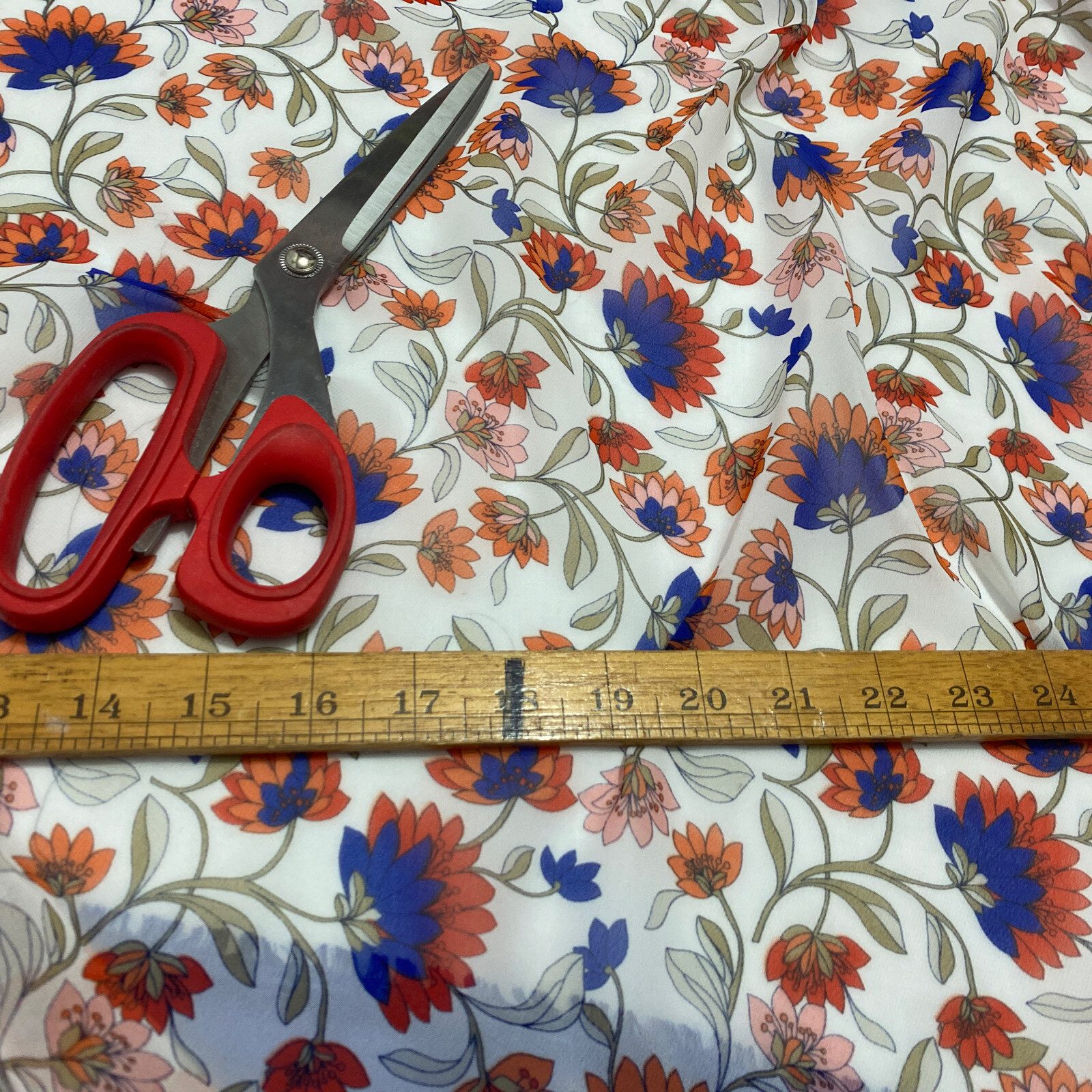 This airy smooth chiffon fabric combines a graceful floral double border print with elegant vertical stripes, creating a flowing and flattering effect perfect for fashion and craft projects. Lightweight and semi-sheer with a soft drape, it’s ideal for dresses, scarves, overlays, and occasionwear. The border runs along both selvedges, allowing for beautifully balanced garments and accessories.