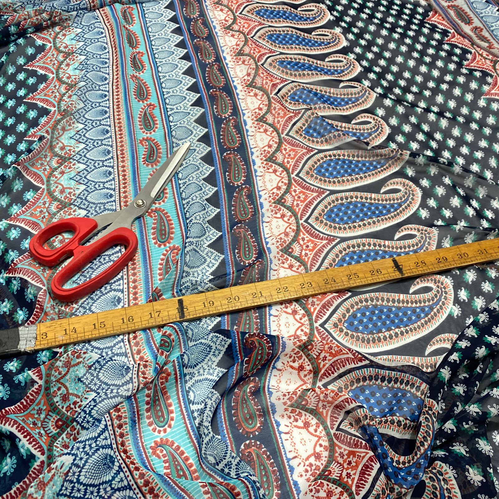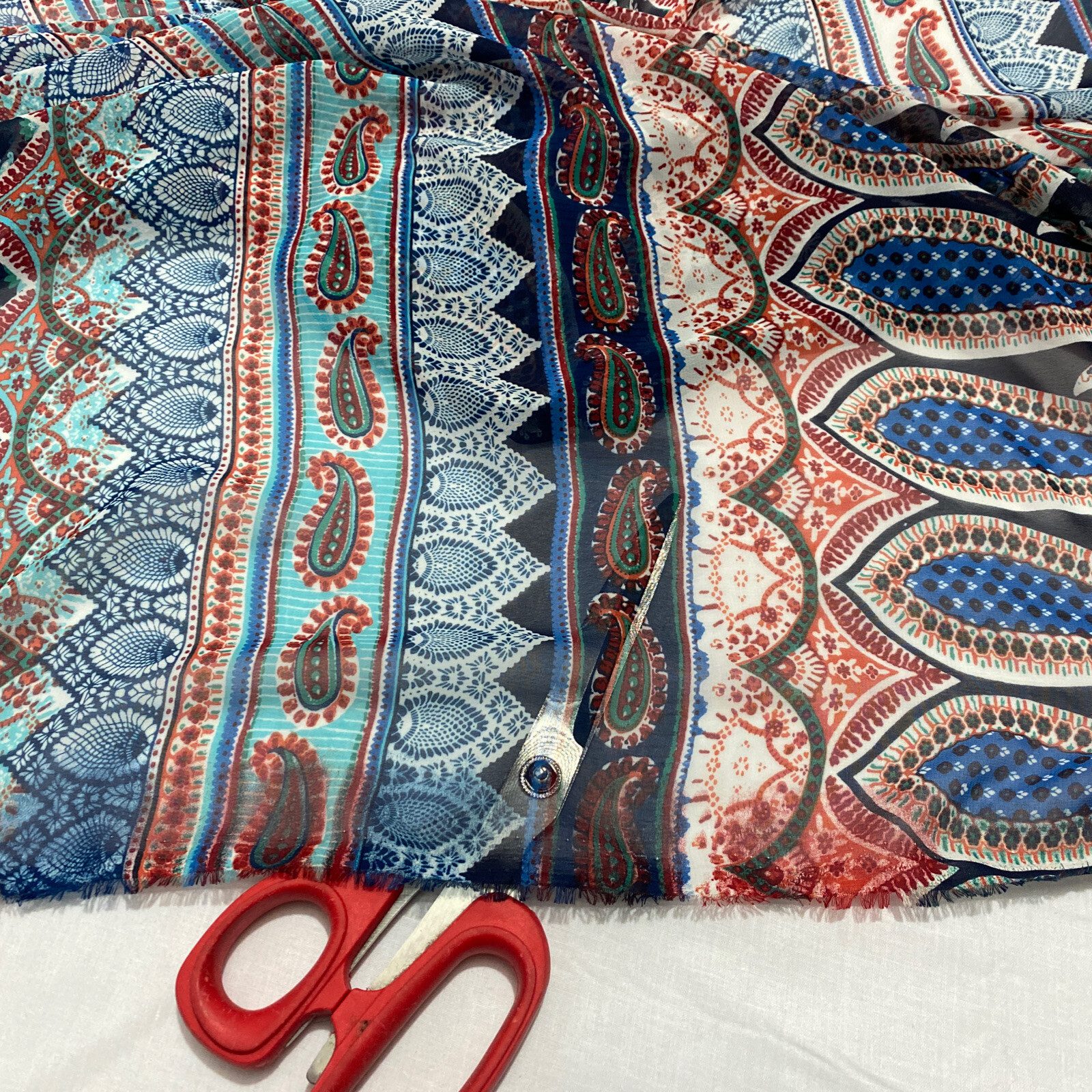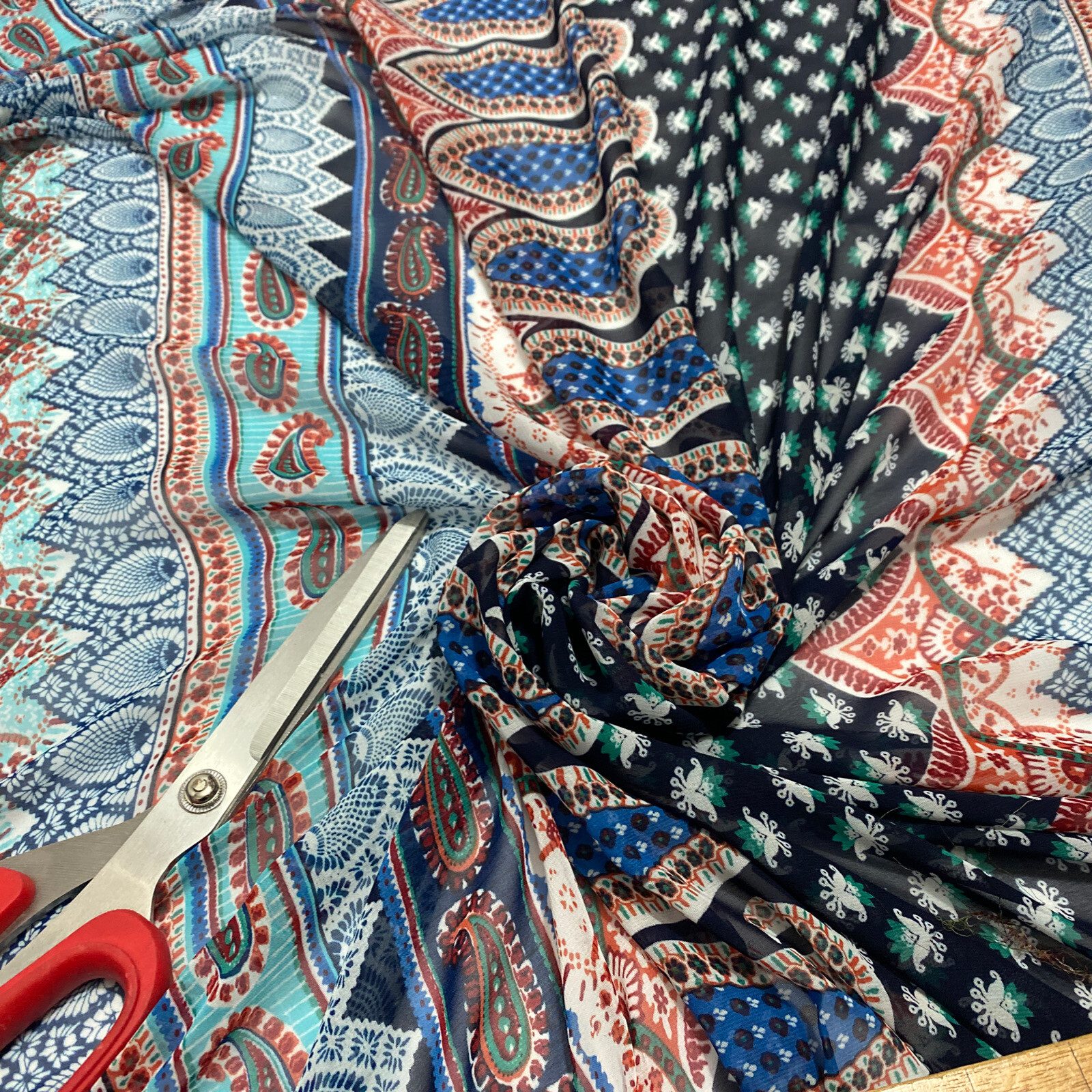 This lightweight smooth chiffon fabric features a bold and expressive Multicolour Ethnic Print 1, inspired by traditional motifs with a modern twist. Its semi-sheer finish and soft, flowing drape make it ideal for dresses, scarves, kaftans, blouses, and creative craft projects. A great choice for statement fashion pieces and cultural-inspired designs.