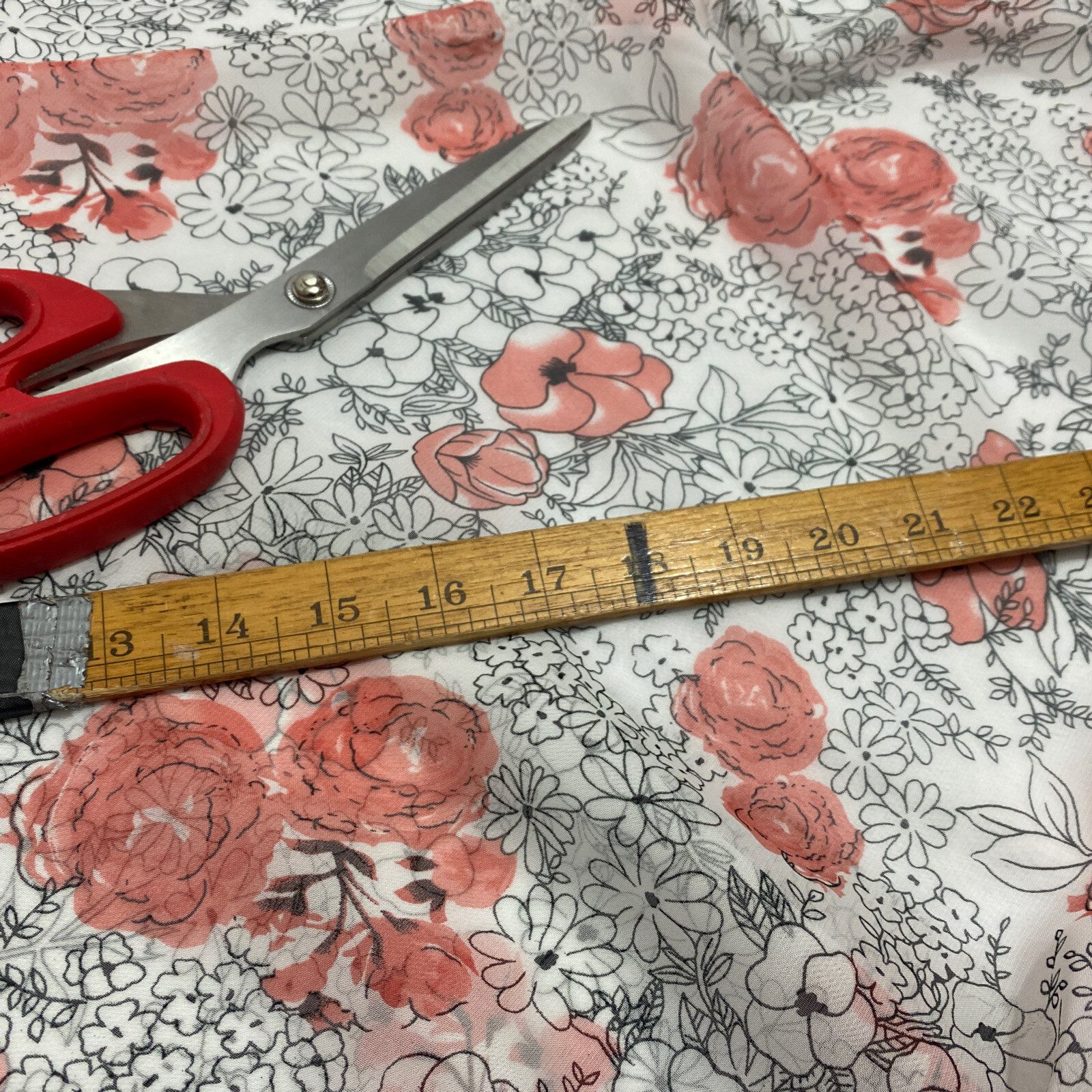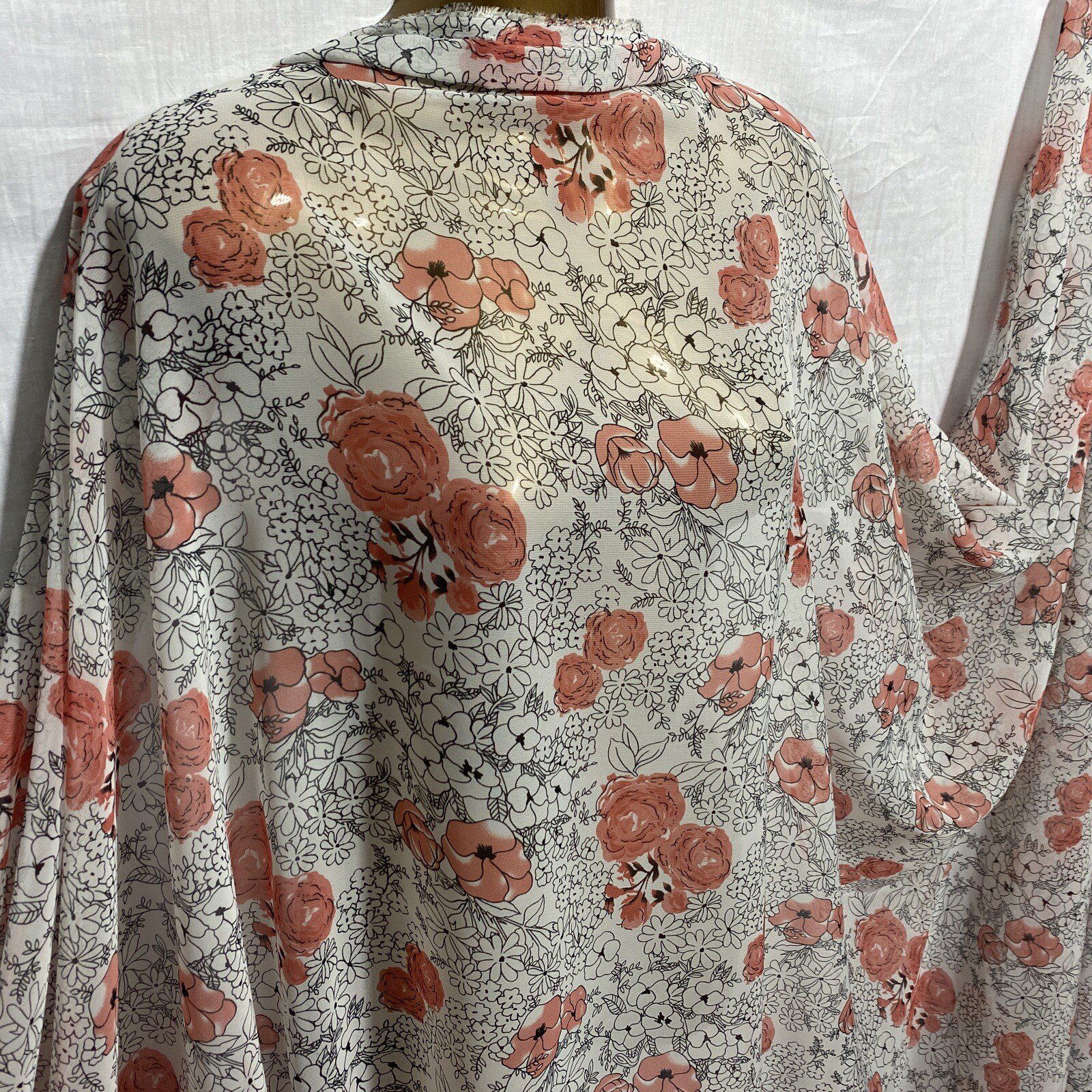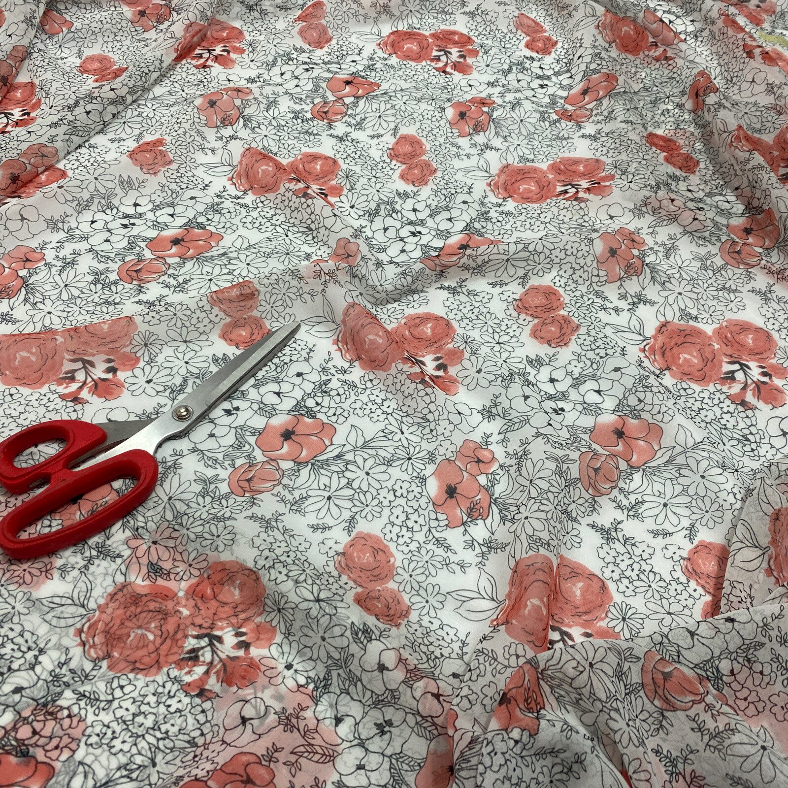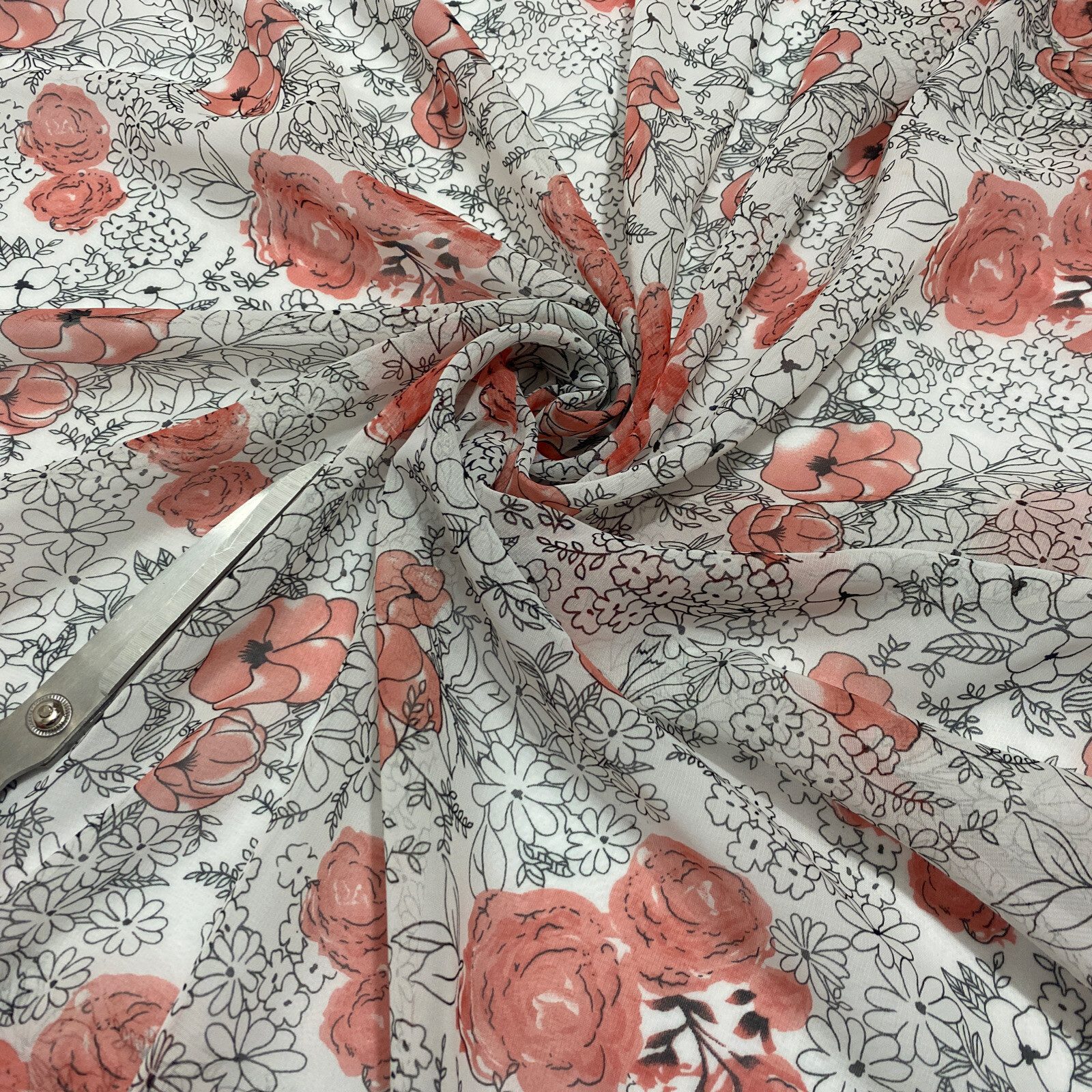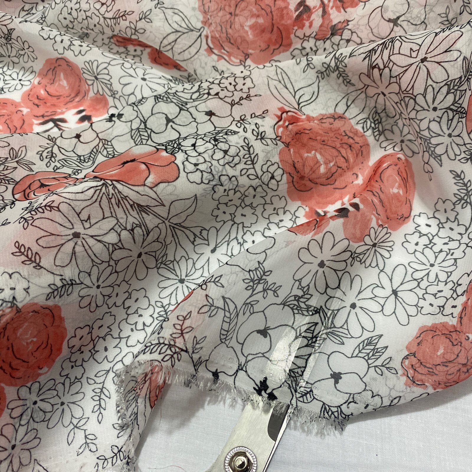This elegant smooth chiffon fabric features a romantic roses print in shades of pinkish red and black, perfect for creating graceful, feminine garments and soft craft designs. Lightweight and semi-sheer with a flowing drape, it’s ideal for dresses, blouses, scarves, overlays, and decorative projects. A timeless floral fabric for both daywear and evening styles.