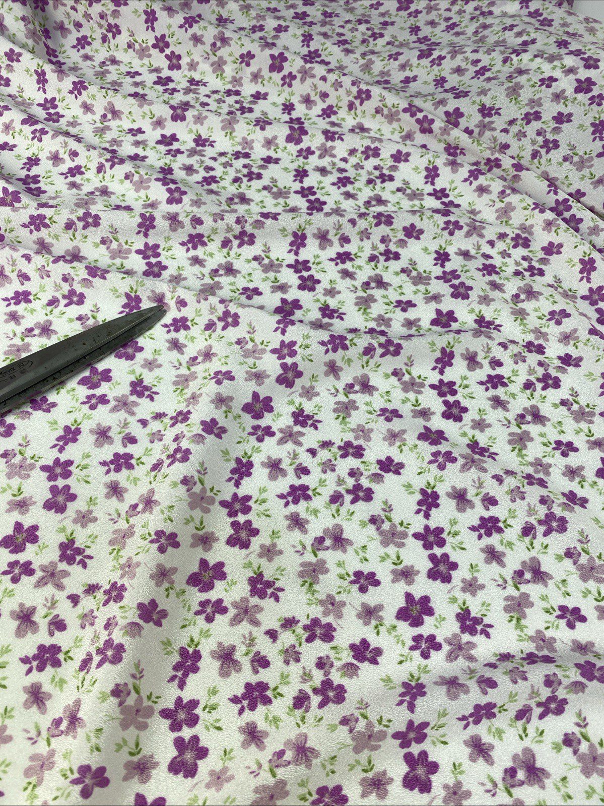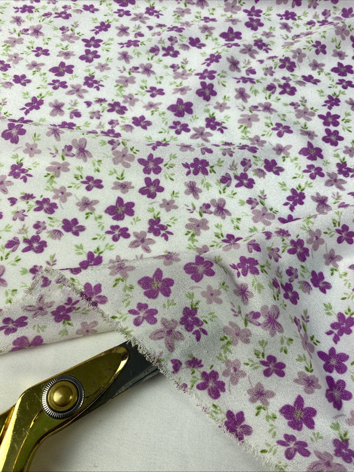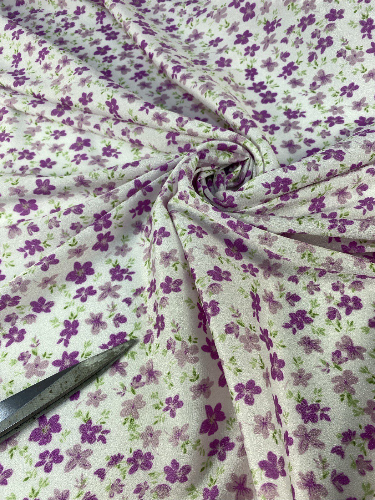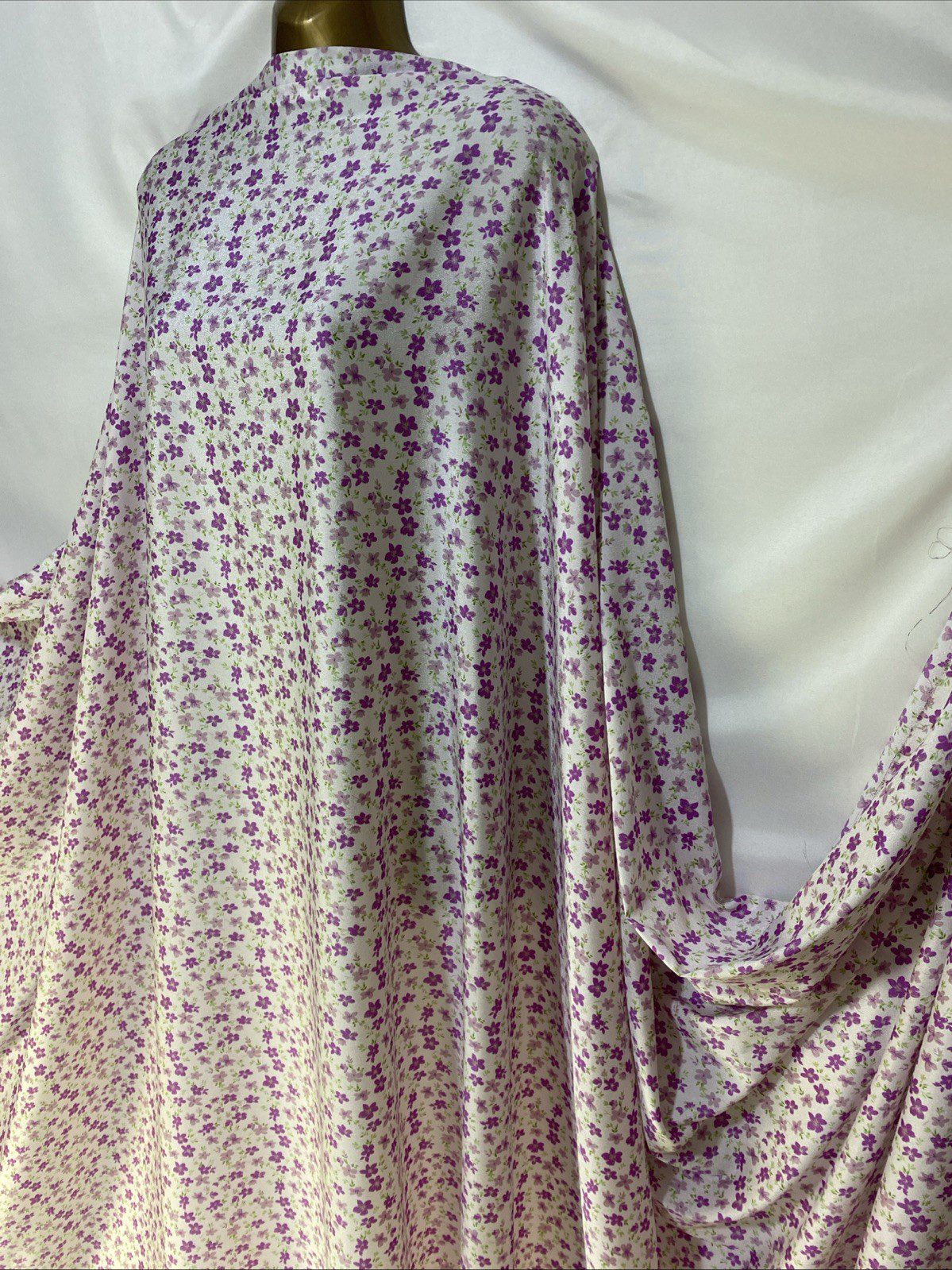 Craft your next masterpiece with our smooth, soft, and medium-weight polyester fabric, featuring a delightful floral print on a white base, accented with lilac and green hues. This versatile material is perfect for a wide range of projects, including apparel such as dresses, everyday clothing, and dance/sportswear, as well as accessories like bags, hats, and gloves. It's also an excellent choice for various crafts and home décor applications.