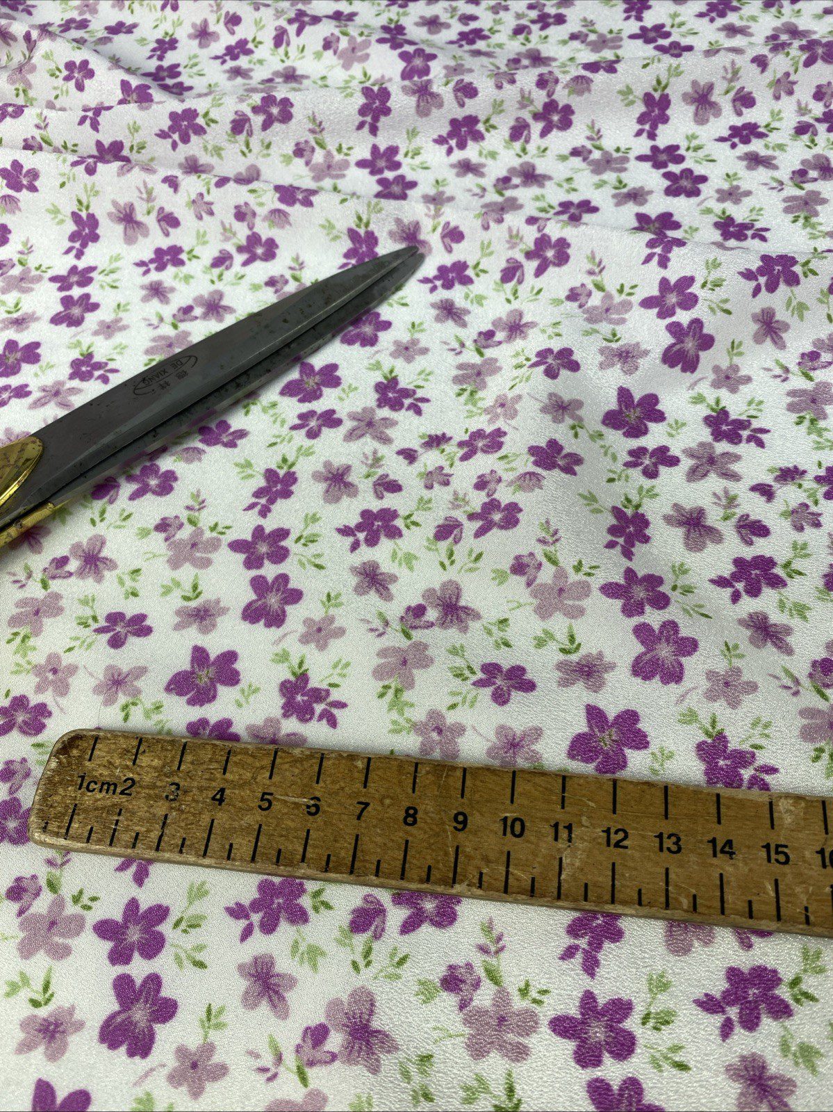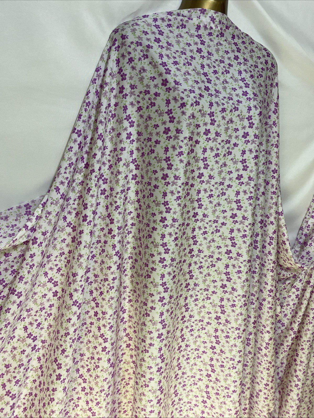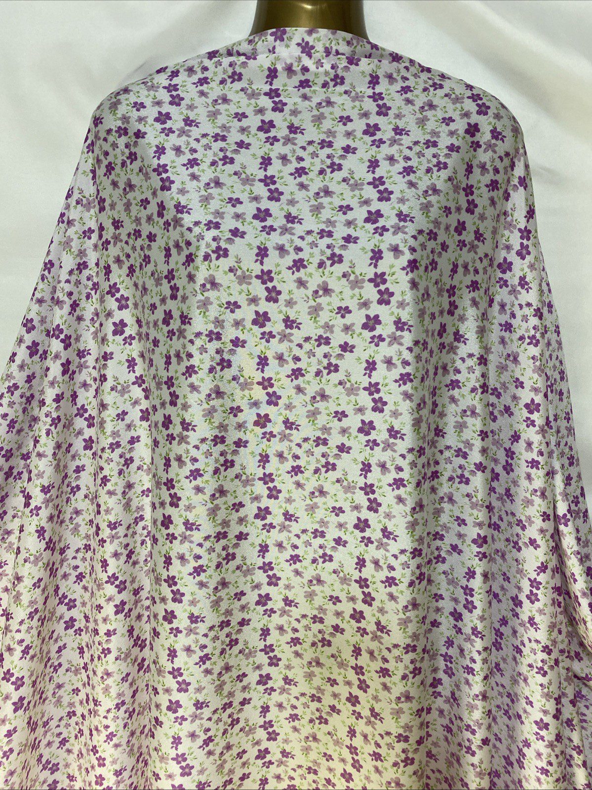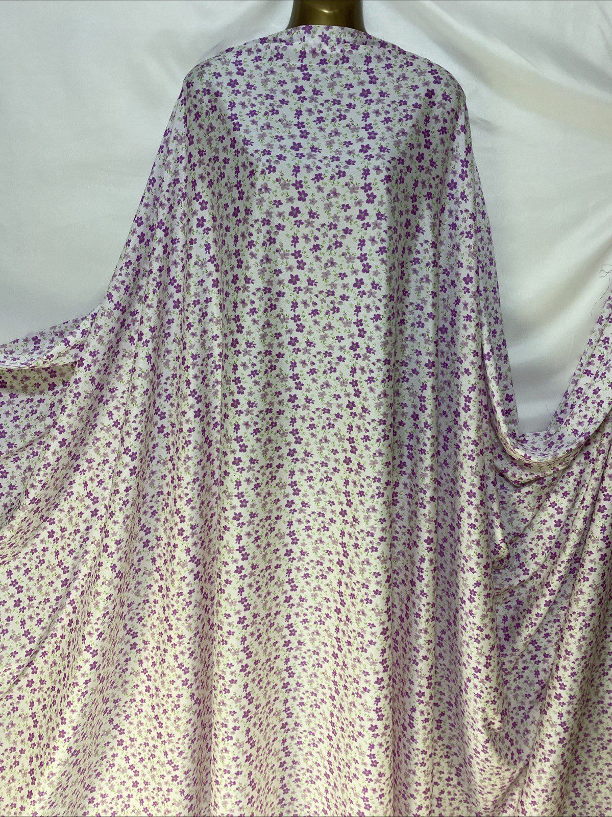 Craft your next masterpiece with our smooth, soft, and medium-weight polyester fabric, featuring a delightful floral print on a white base, accented with lilac and green hues. This versatile material is perfect for a wide range of projects, including apparel such as dresses, everyday clothing, and dance/sportswear, as well as accessories like bags, hats, and gloves. It's also an excellent choice for various crafts and home décor applications.