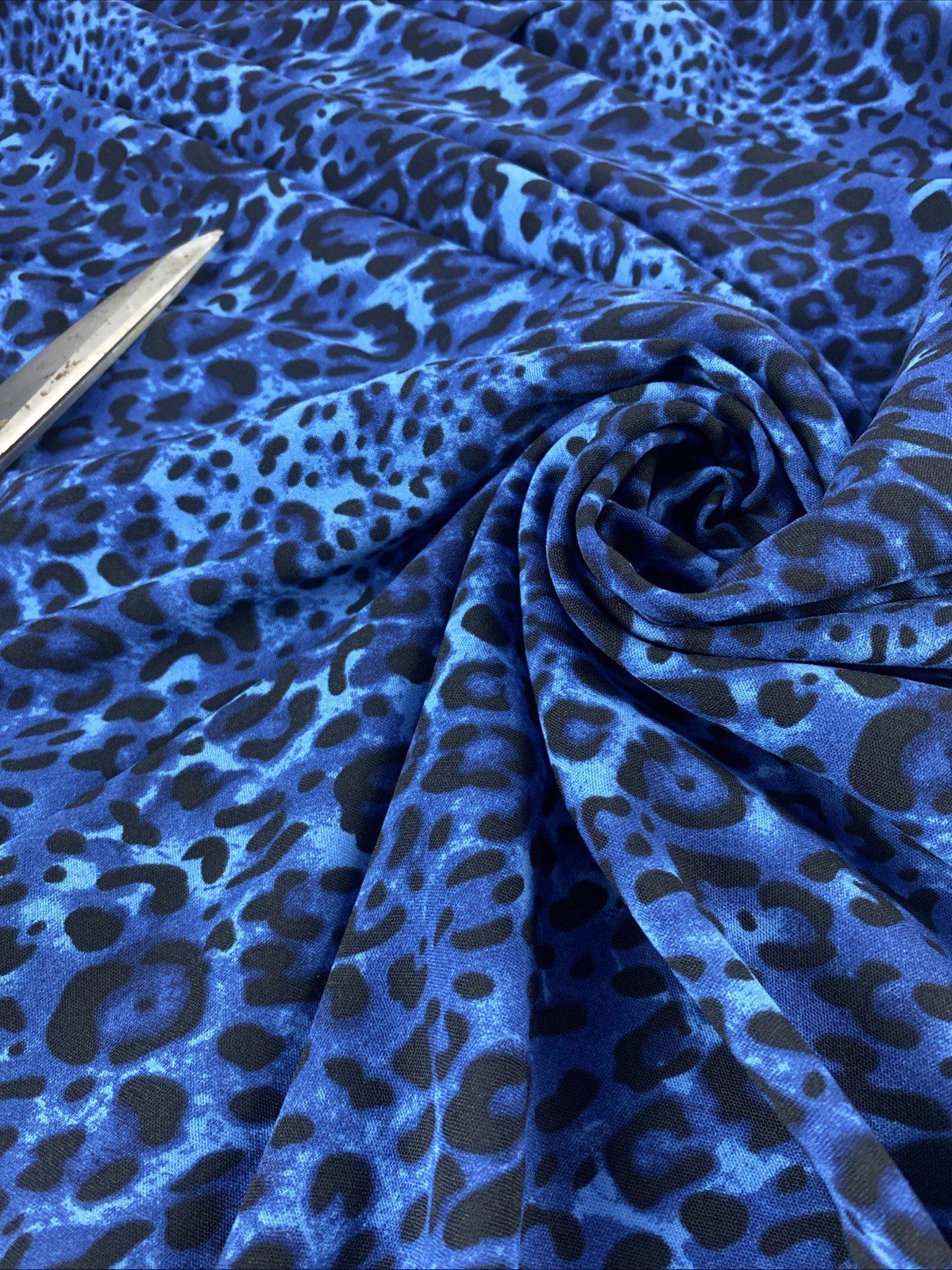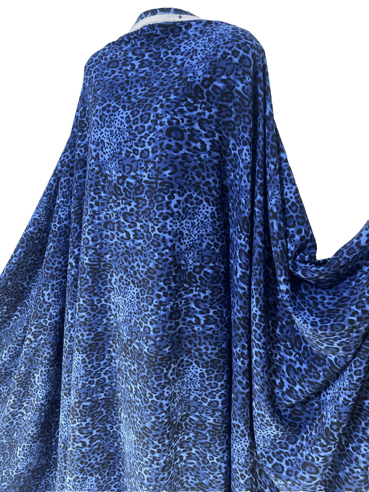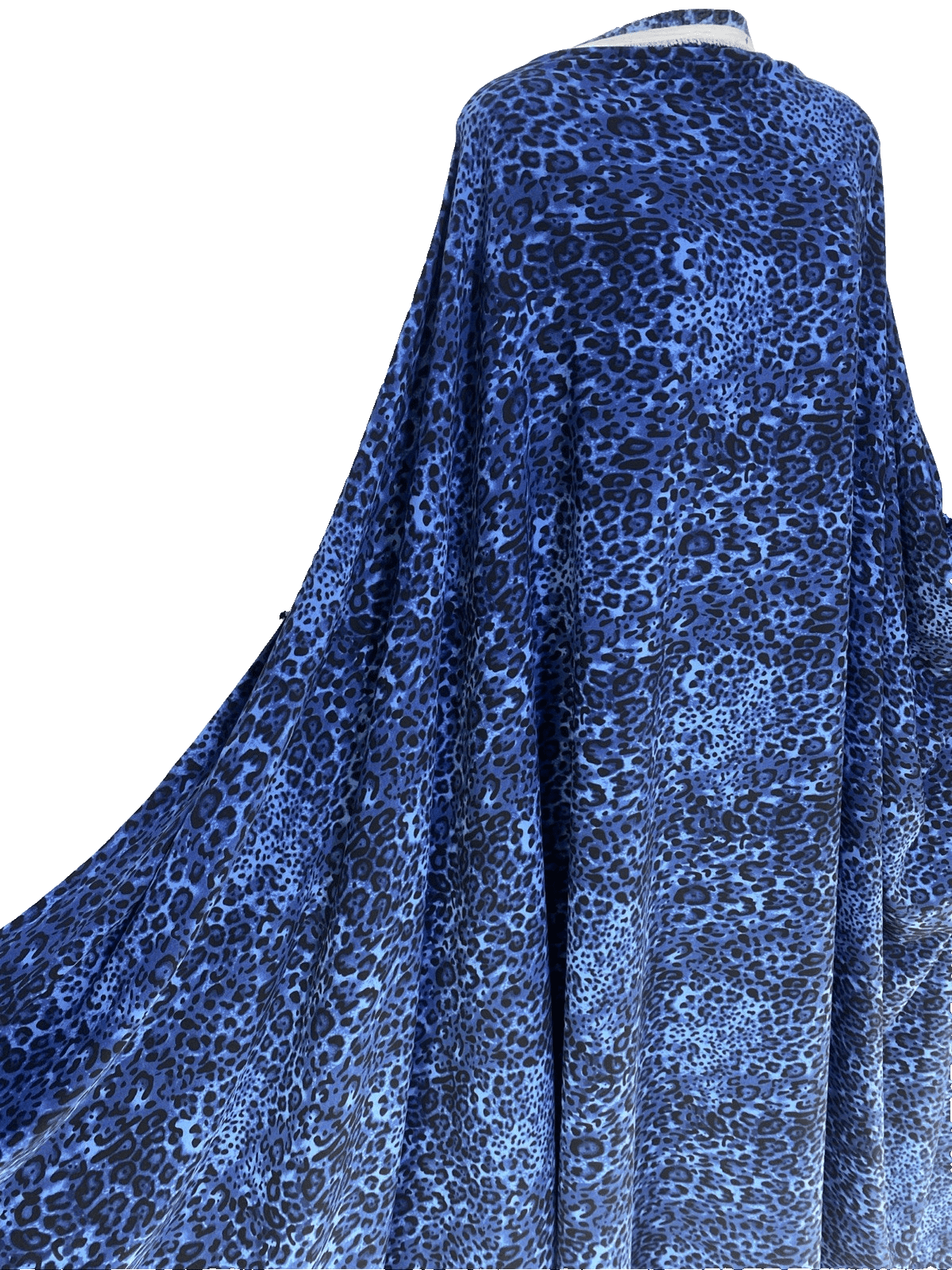 Craft a statement piece with our medium-weight 100% polyester animal print fabric, ideal for a range of creative projects. This versatile material features a bold leopard or jaguar pattern in a striking blue-black tone, perfect for making accessories like bags, hats, and gloves, or for crafting apparel such as dresses and dance/sportswear. The width of the fabric ranges from 58 to 60 inches, allowing for ample design flexibility.