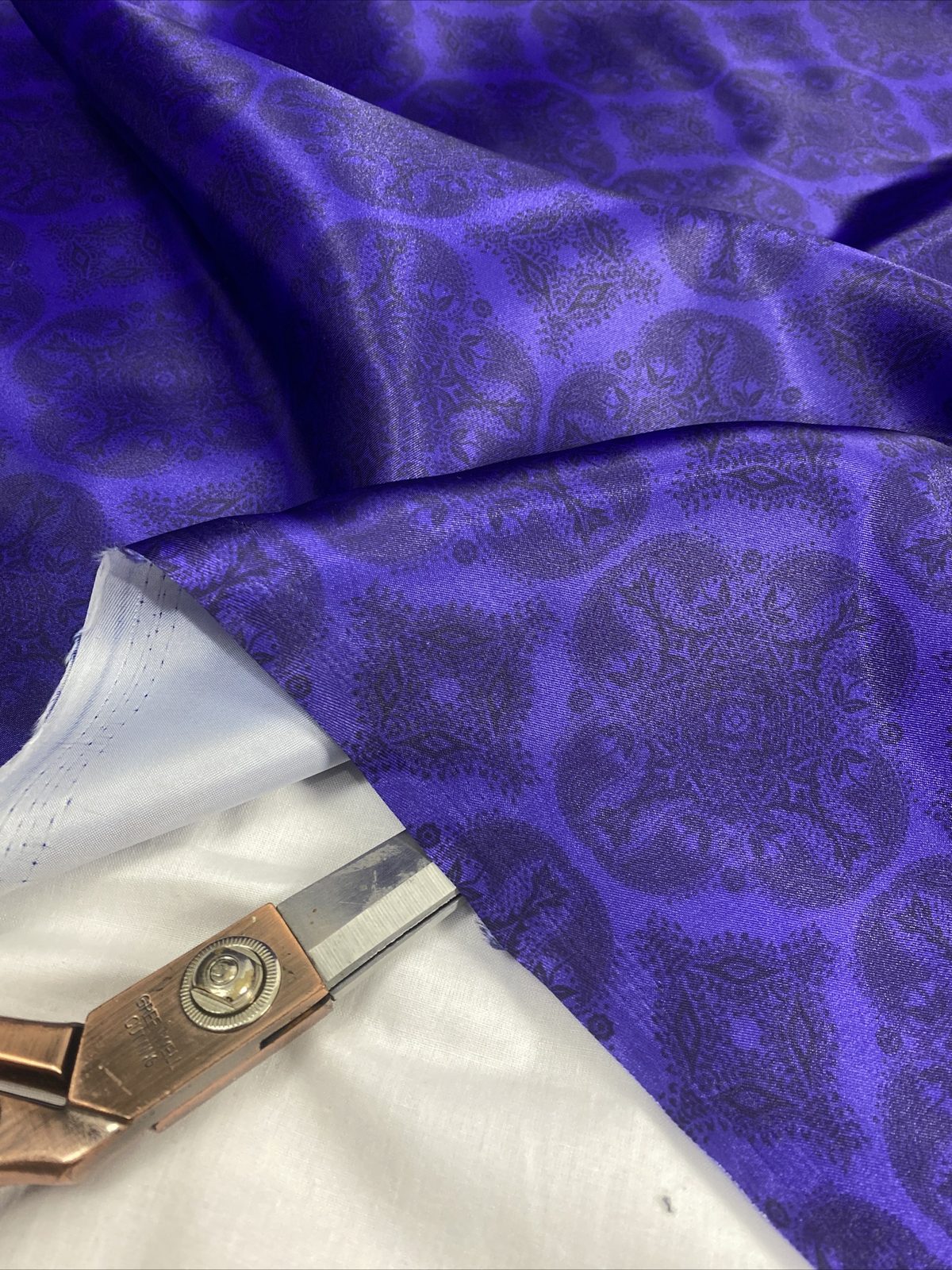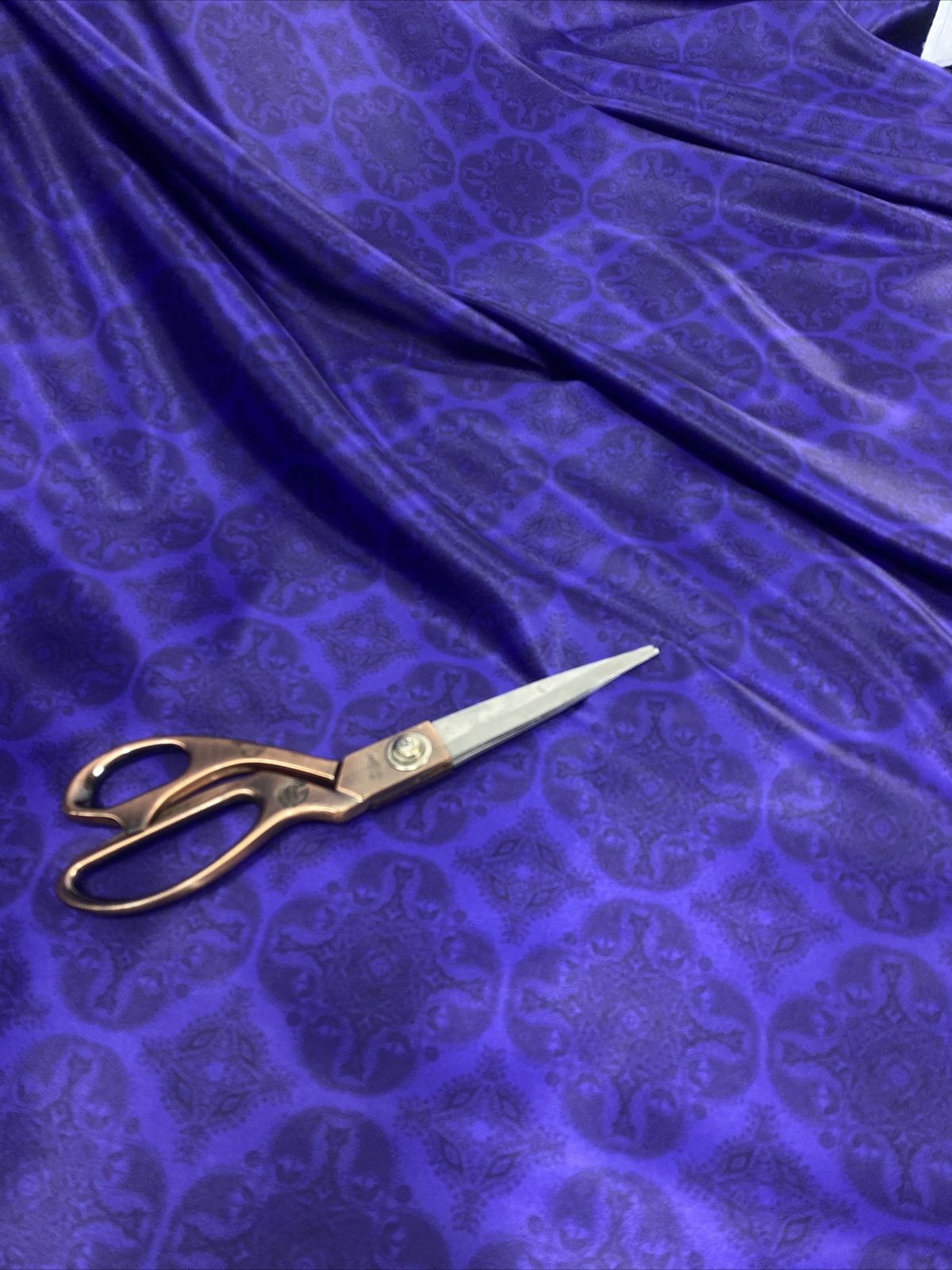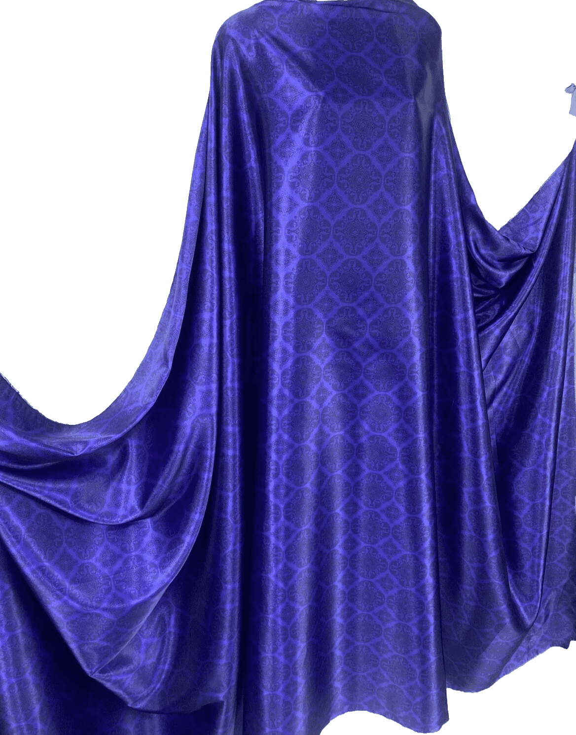 This luxurious soft satin fabric features an elegant damask print in rich dark purple, combining classic design with a smooth, glossy finish. Lightweight with a flowing drape, it’s perfect for evening dresses, blouses, occasionwear, and sophisticated craft projects. The silky texture and royal tones add a refined, high-end feel to any creation.