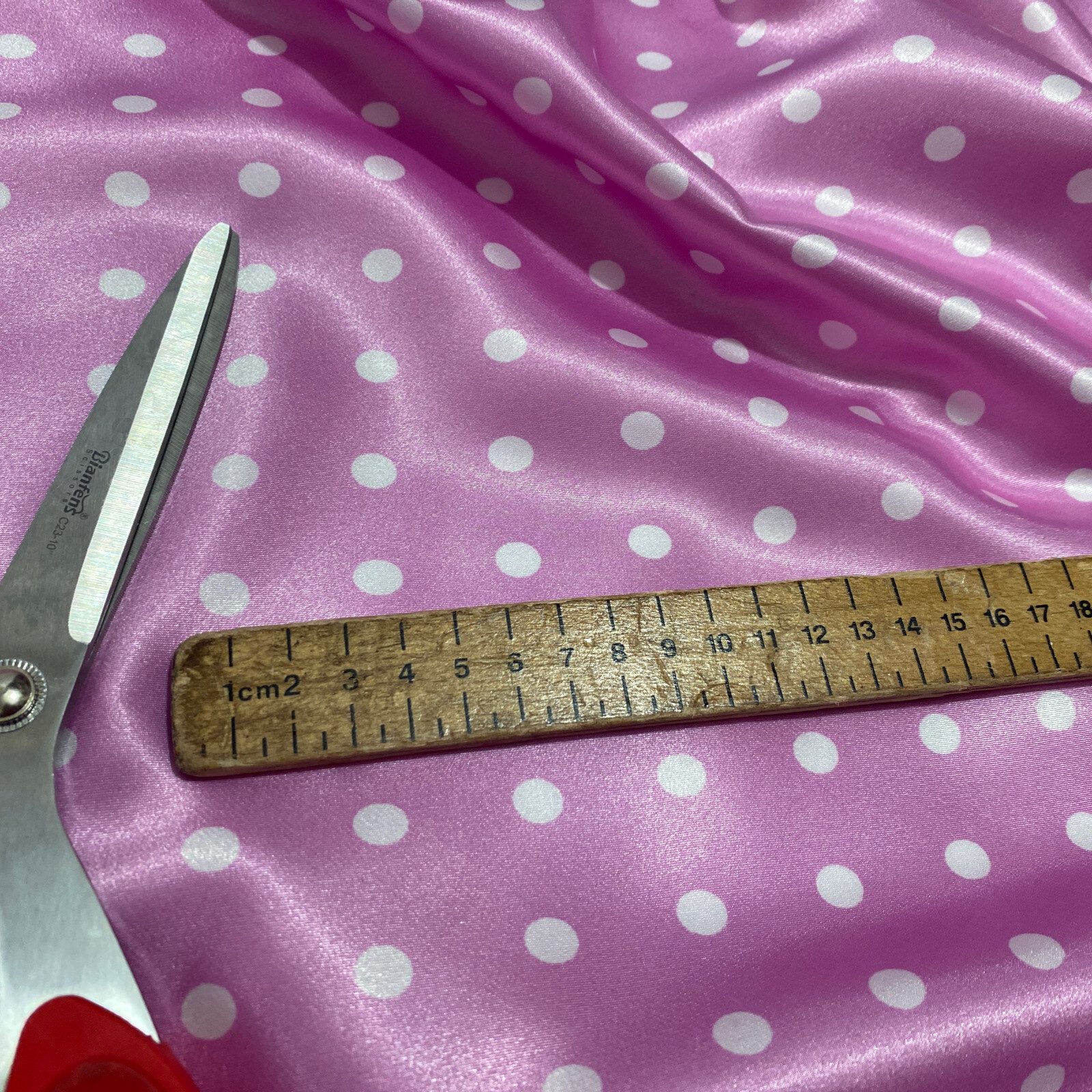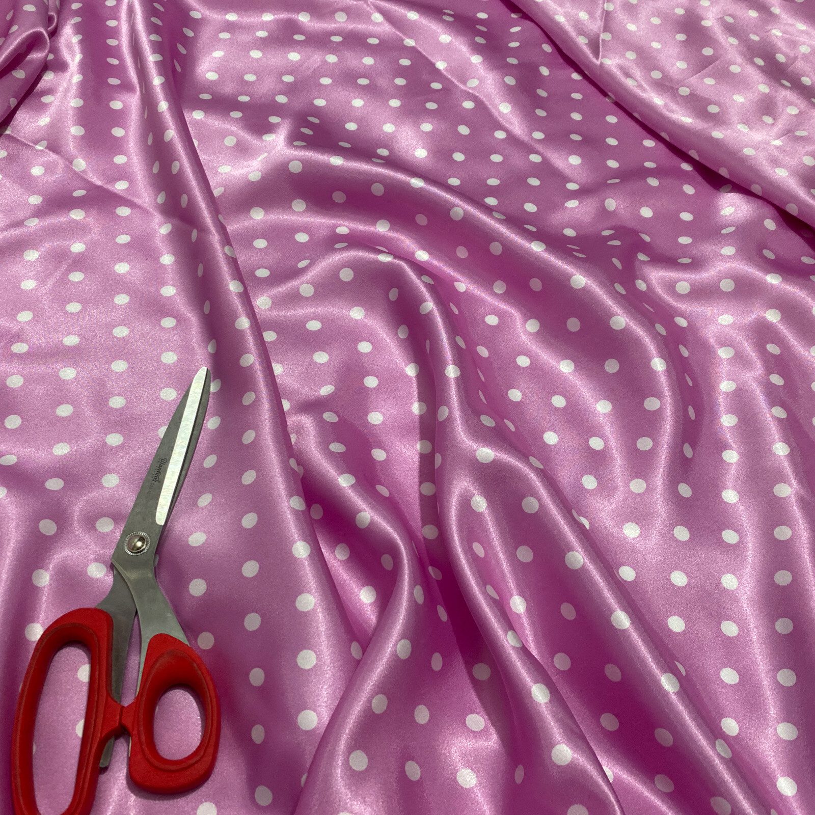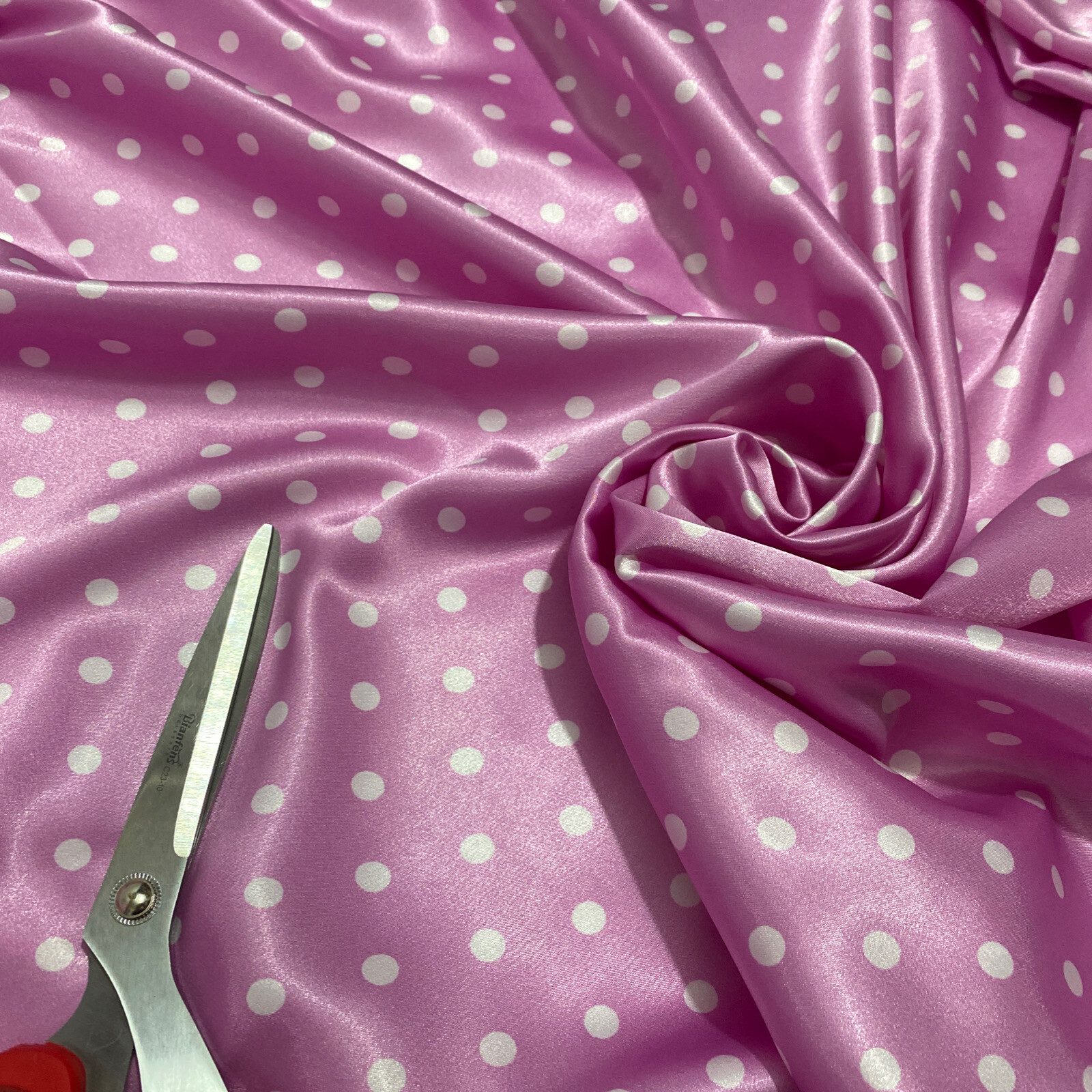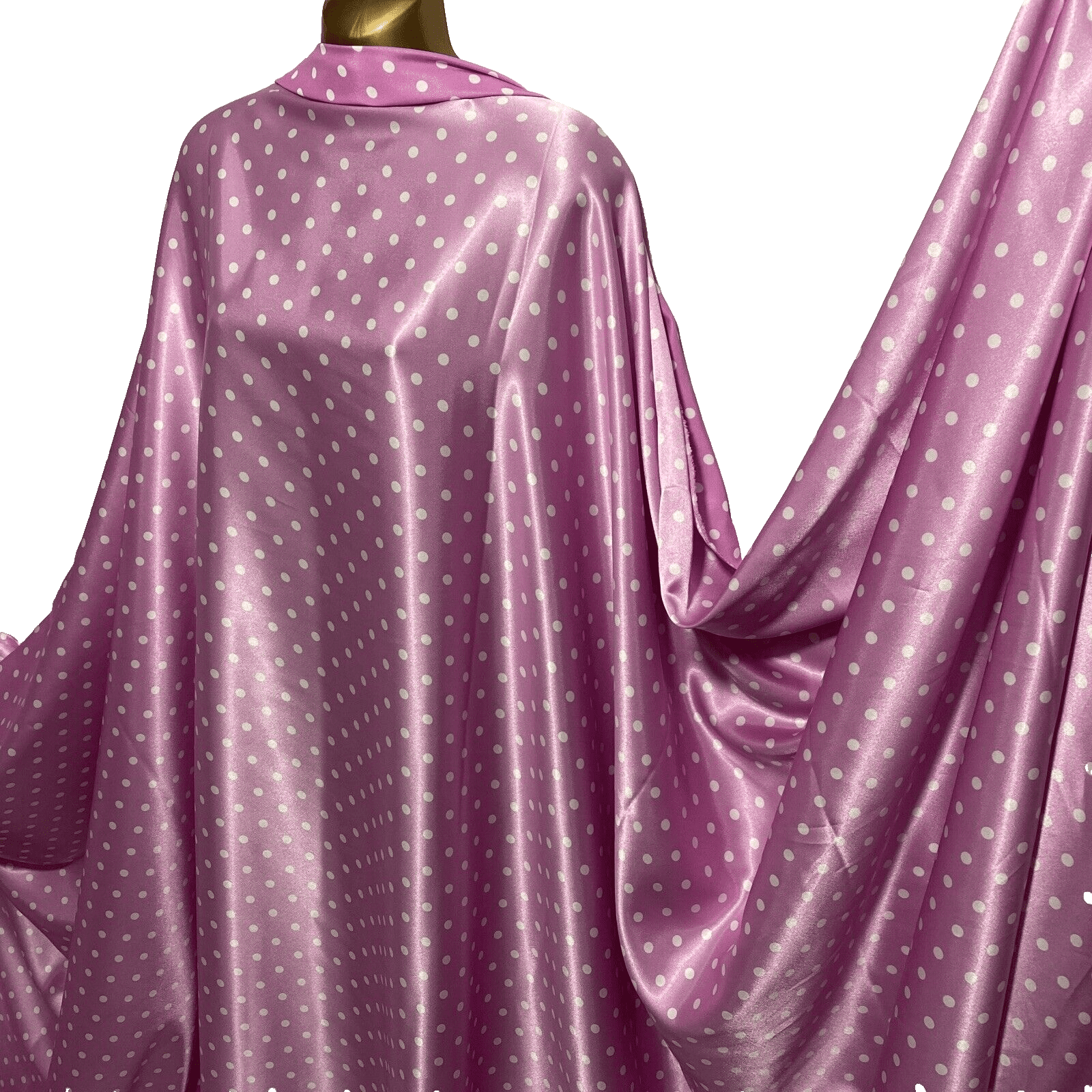Add a touch of fun to your next project with this beautiful satin fabric in a mauve pink colour, featuring a playful polka dot print. The fabric is perfect for creating a range of items, including dresses, interfacing, curtains, dance and sportswear, loungewear, cushions, saris, costumes, upholstery, kimonos, and more. With a width of 58″-60″, and a medium fabric weight, this versatile material is ideal for all your crafting needs.