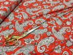 This soft and breathable stretch viscose jersey fabric features elegant paisley prints, perfect for comfortable and stylish face masks, dresses, tops, and craft projects. With a smooth finish and excellent drape, it hugs the body without clinging, making it ideal for flowing or fitted garments. Its stretch and softness ensure both flexibility and all-day wearability.