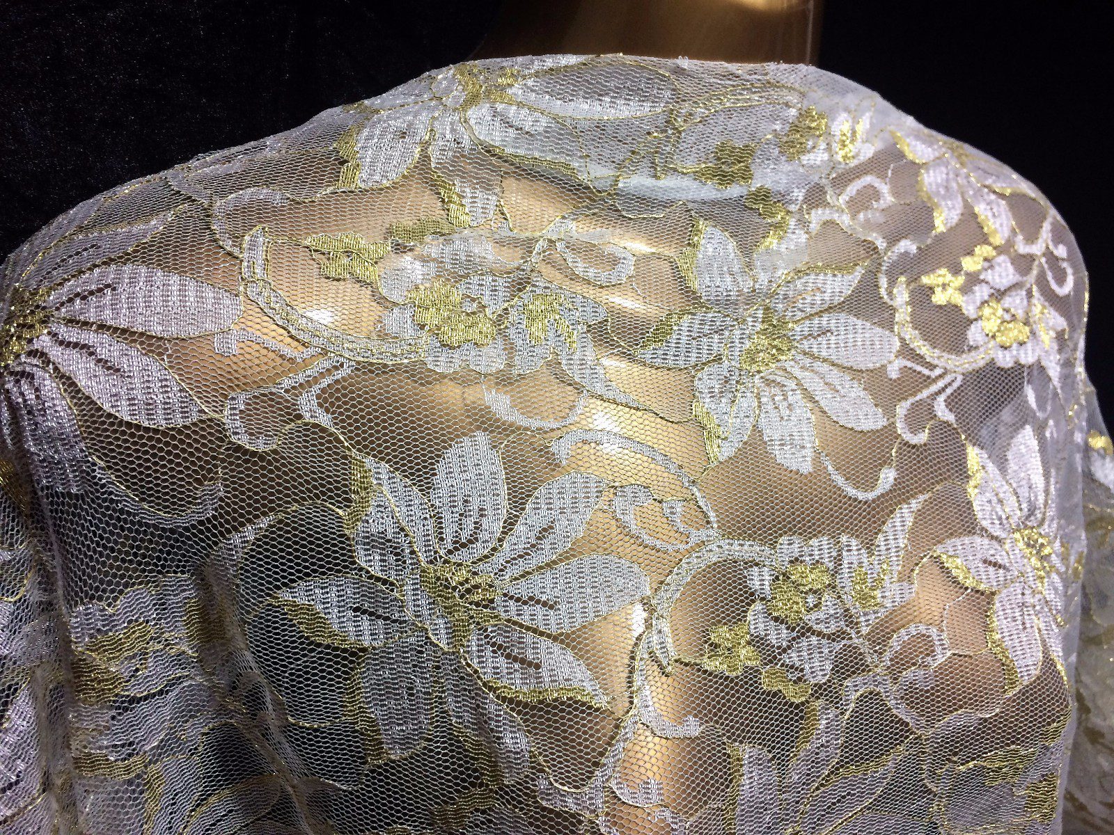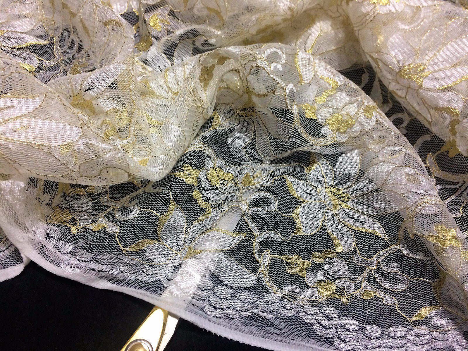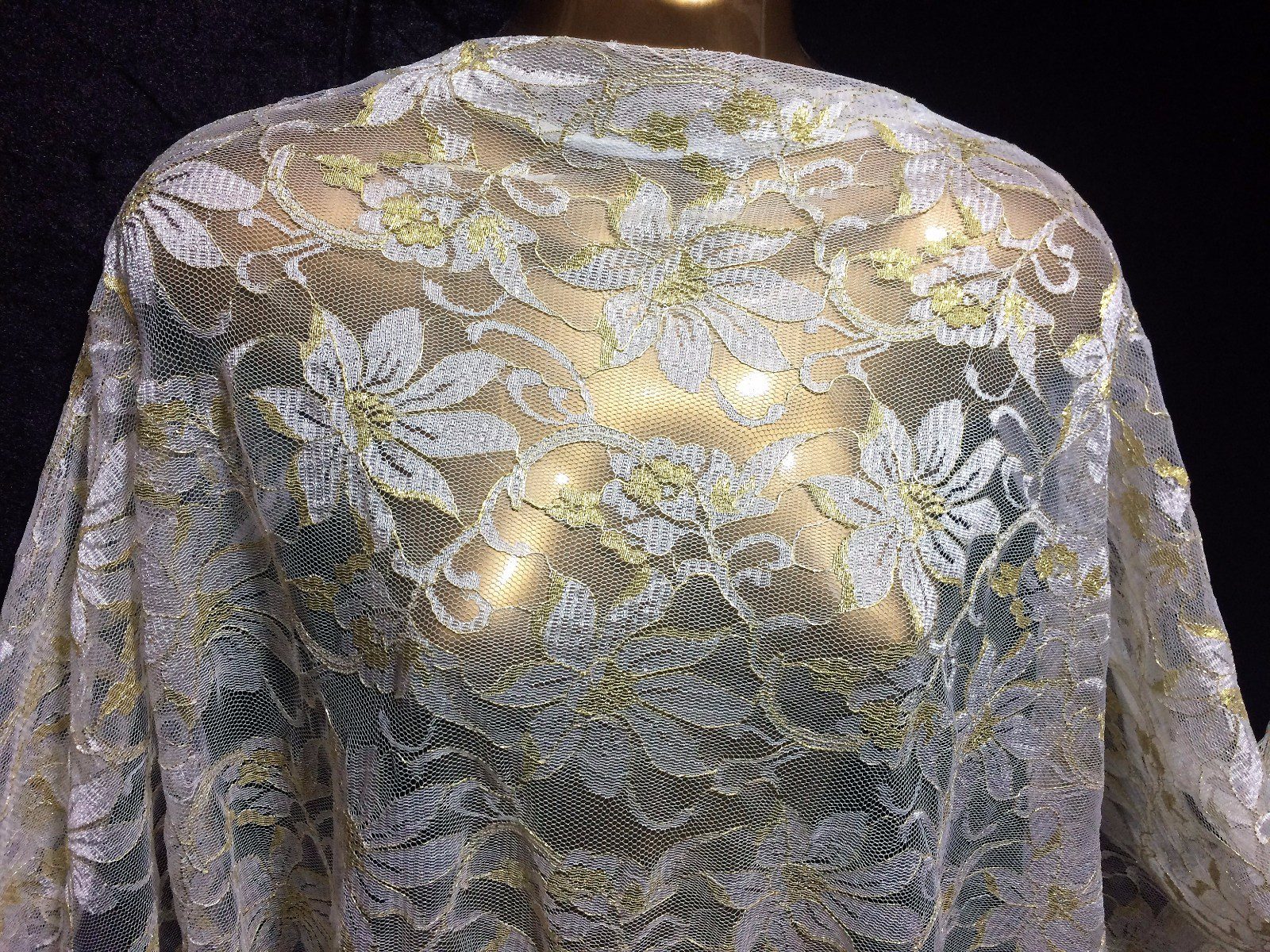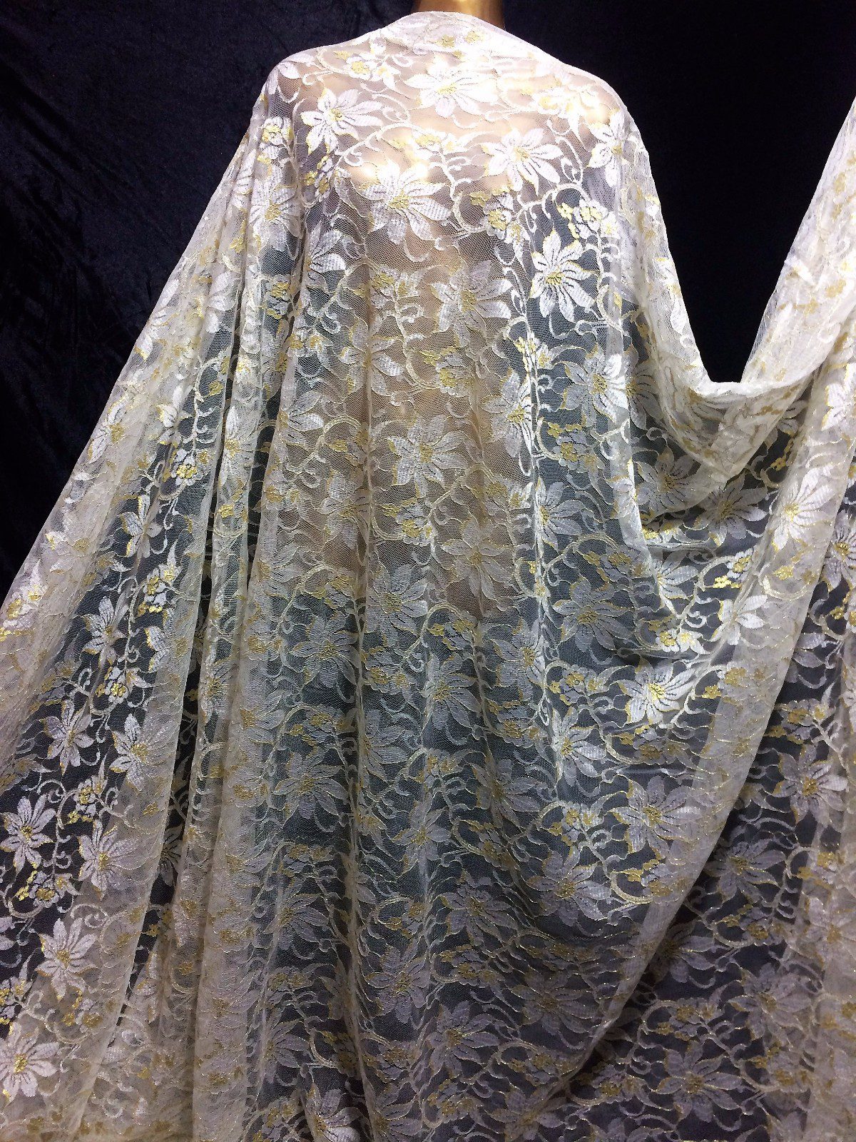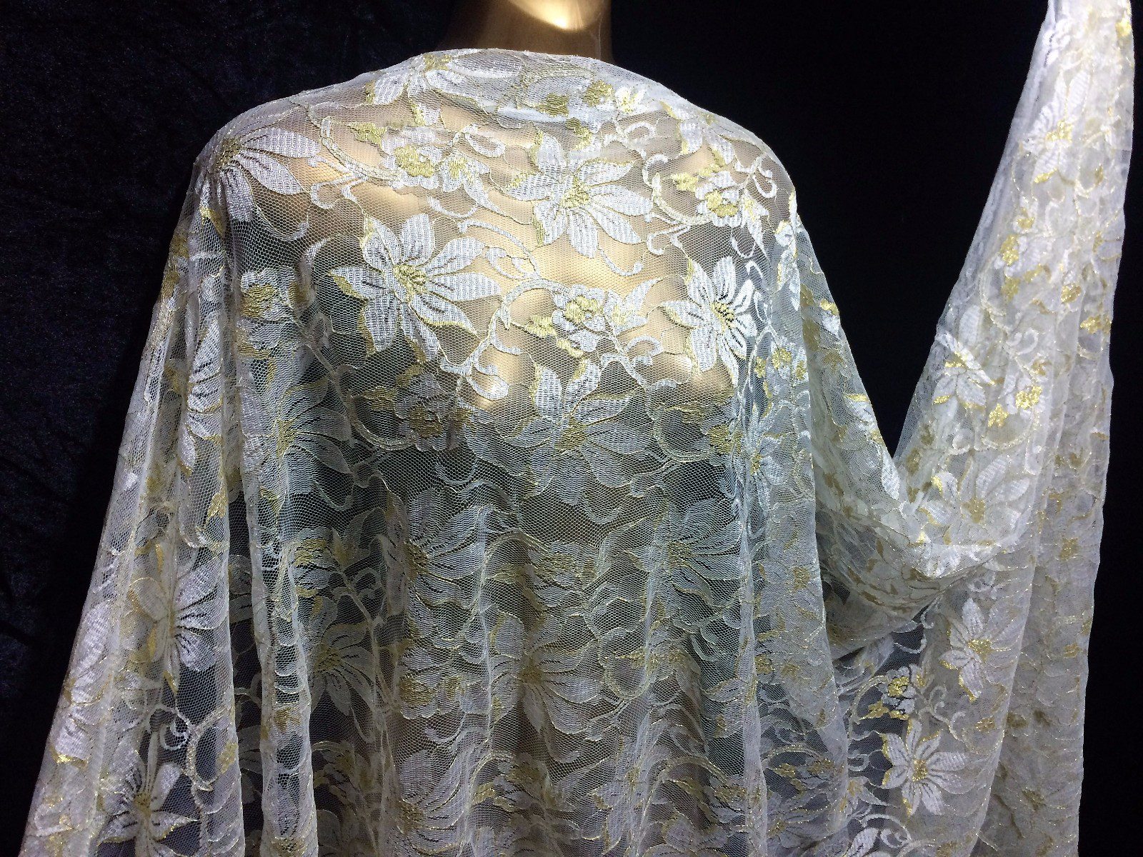 This luxurious ivory and gold floral crochet lace is a stunning stretch fabric ideal for bridal wear, dresses, overlays, and elegant crafts. The intricate floral pattern is delicately enhanced with metallic gold threads, adding a subtle shimmer that elevates any creation. With its soft stretch and elegant drape, it’s perfect for romantic gowns, veils, sleeves, and high-end accessories.