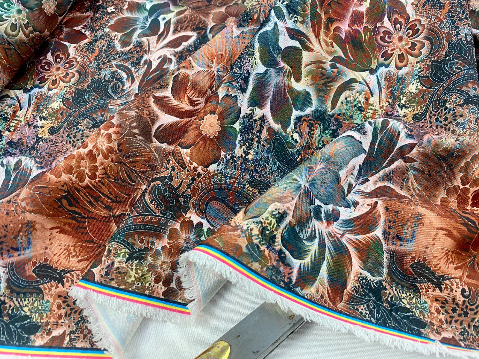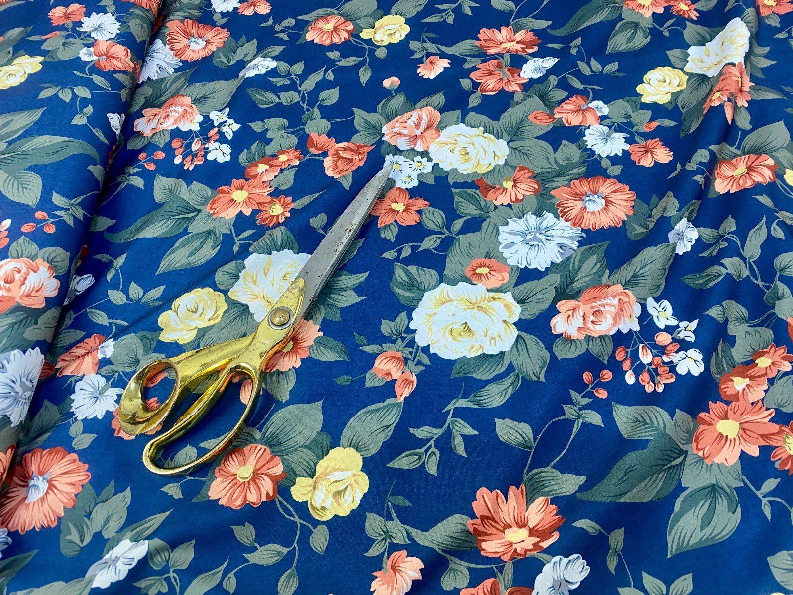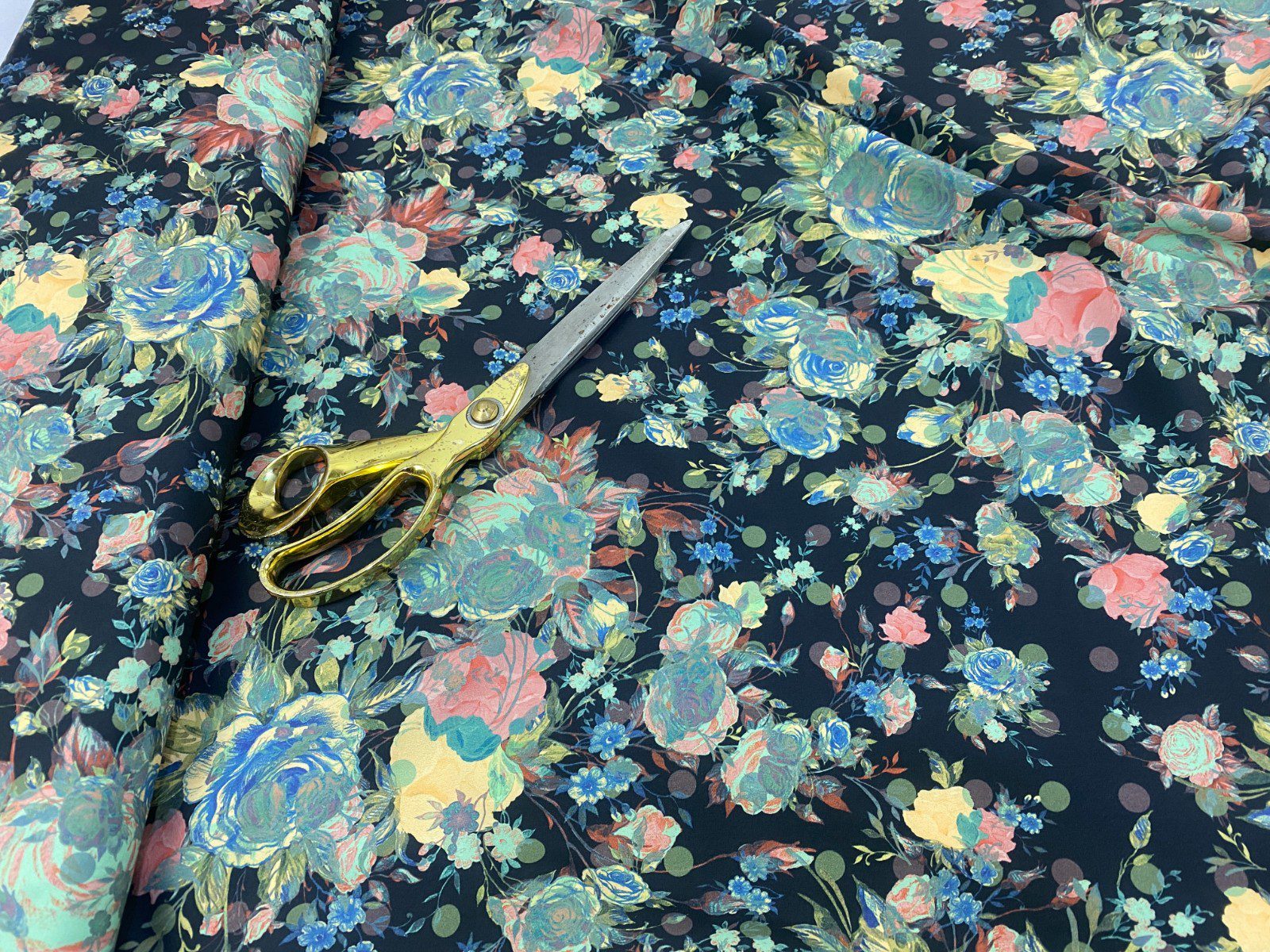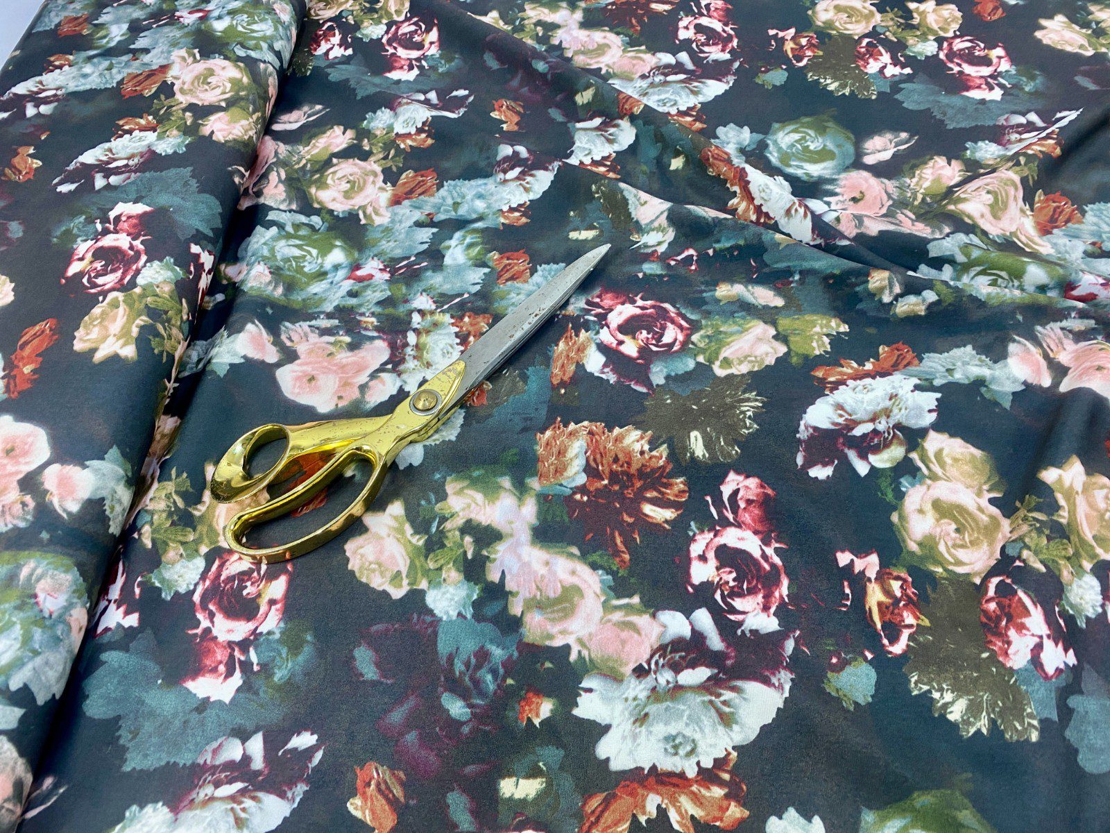 Smooth designer floral polyester fabric with a soft lightweight drape. Ideal for dresses, blouses, skirts & evening wear.