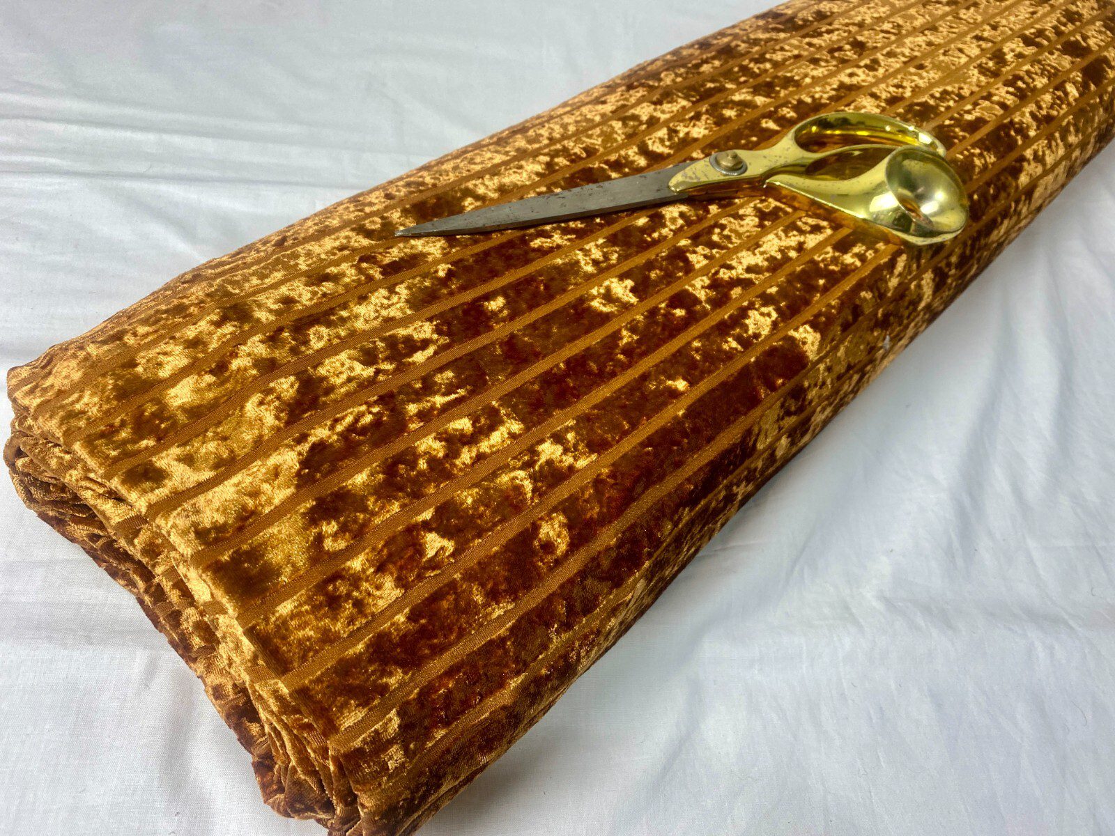 Add warmth and texture to your projects with this luxurious striped burnout copper velvet fabric. Featuring a semi-sheer striped effect with a soft velvet pile, it offers both elegance and versatility. Ideal for statement cushions, decorative curtains, glamorous dresses, or refined craft projects. This fabric delivers a perfect balance of sheen, texture, and style.